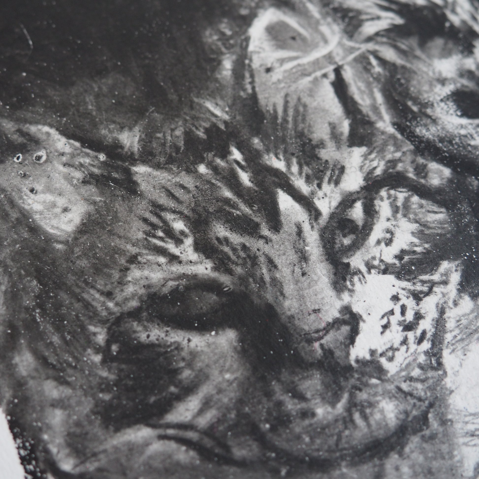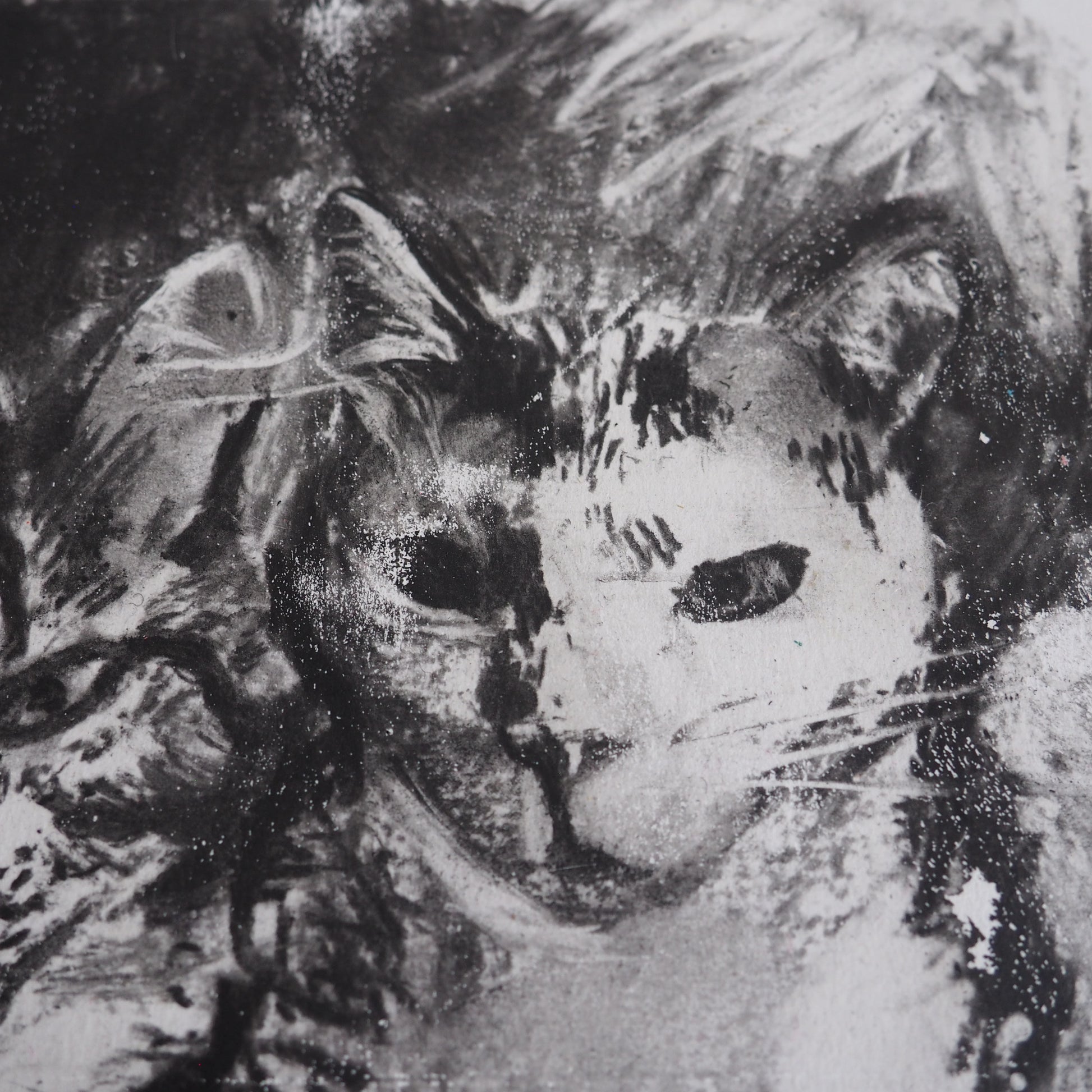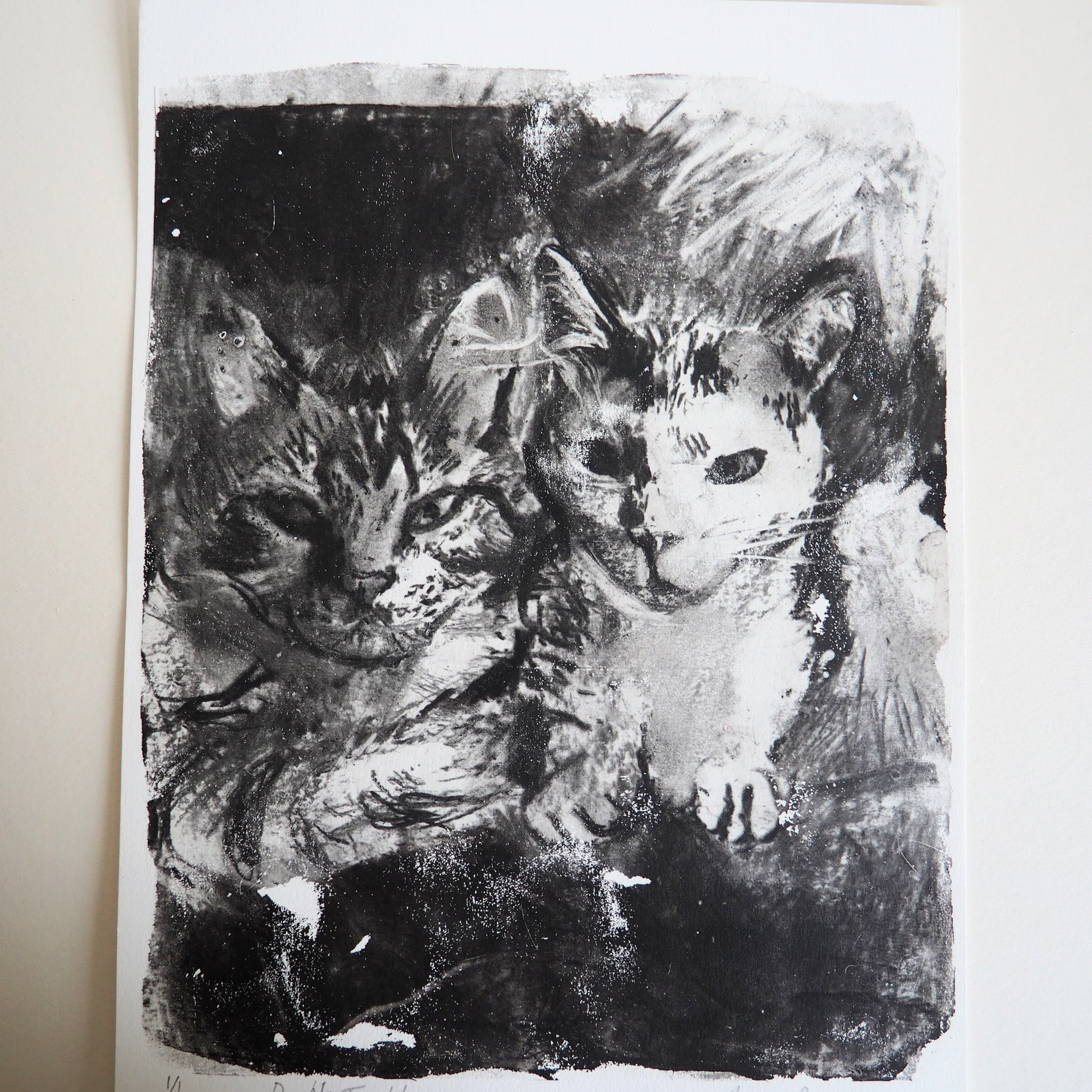 This charcoal mono print is a striking black-and-white image of my Cats, Marco and Melba, snuggled together, looking somewhat mischievous.