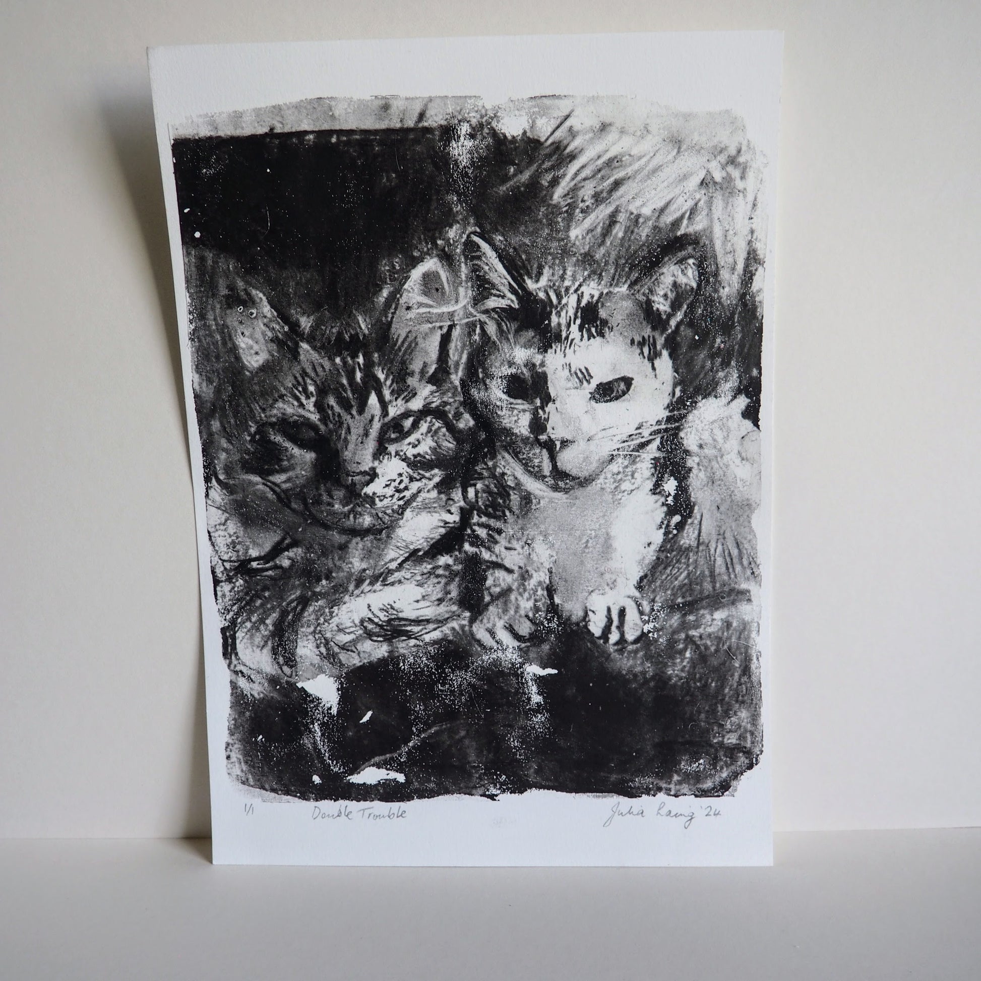 Charcoal Monoprint Artwork on Paper of Two Cats 'Double Trouble'