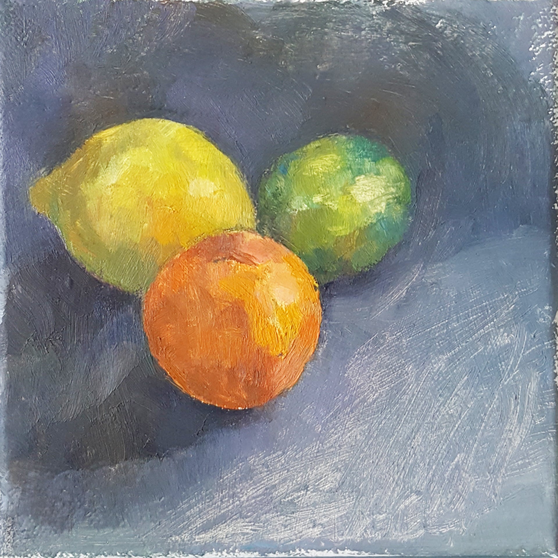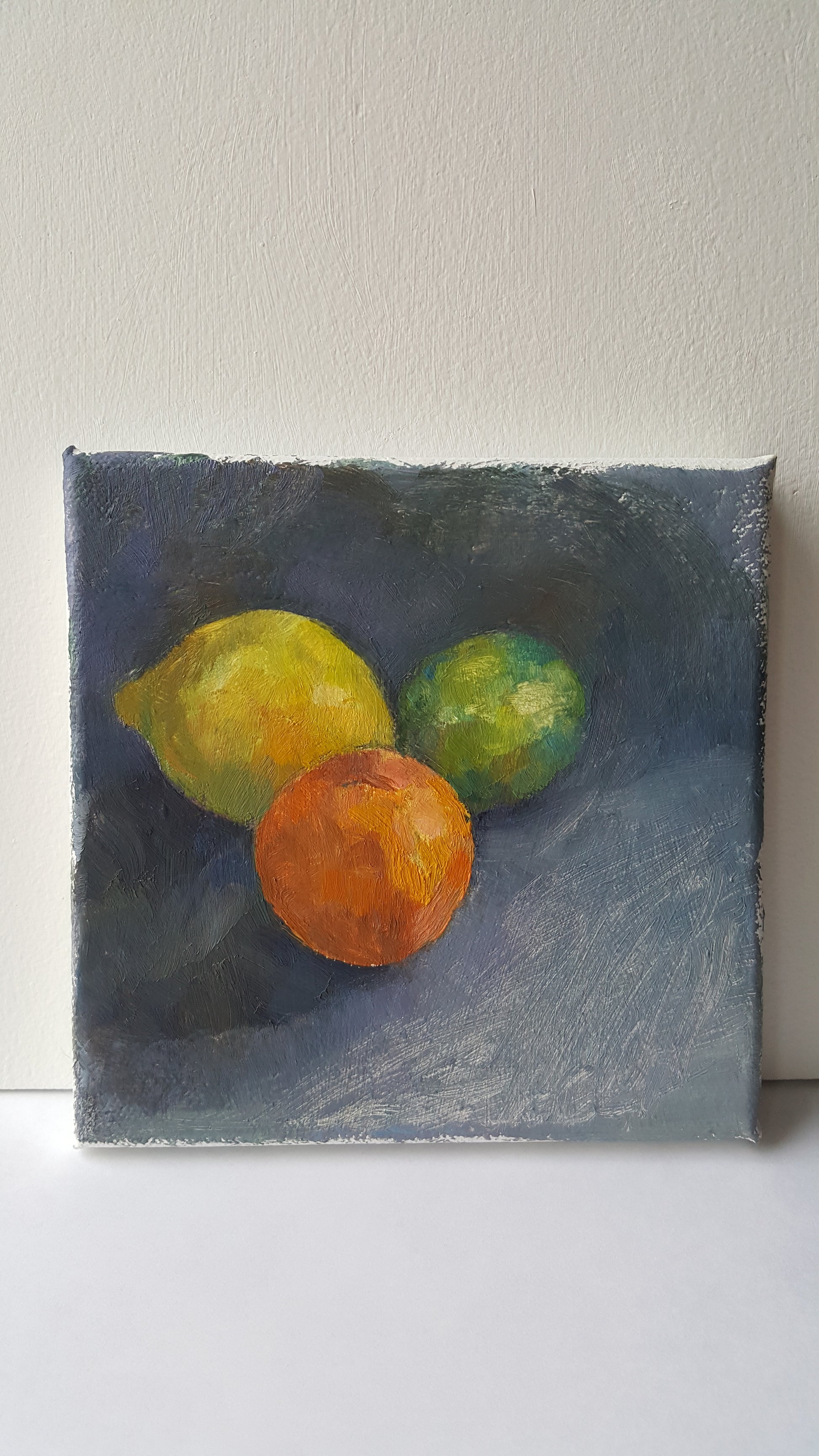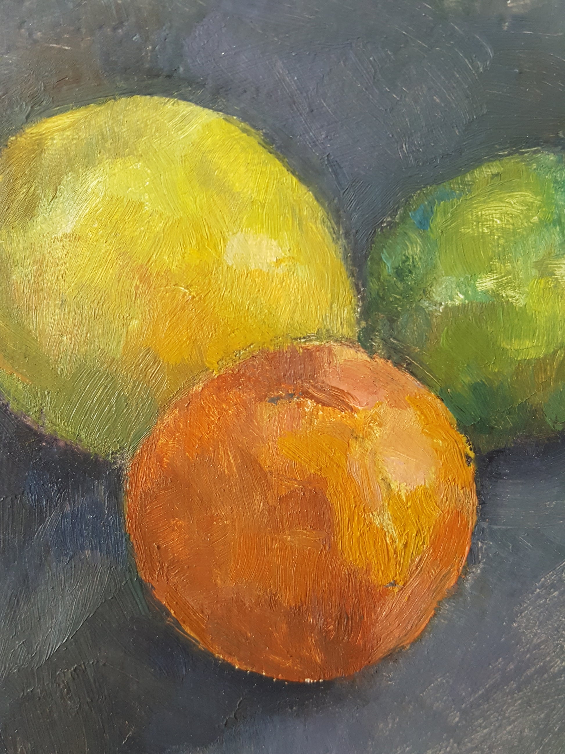 Small oil painting study of citrus fruit against a grey background.