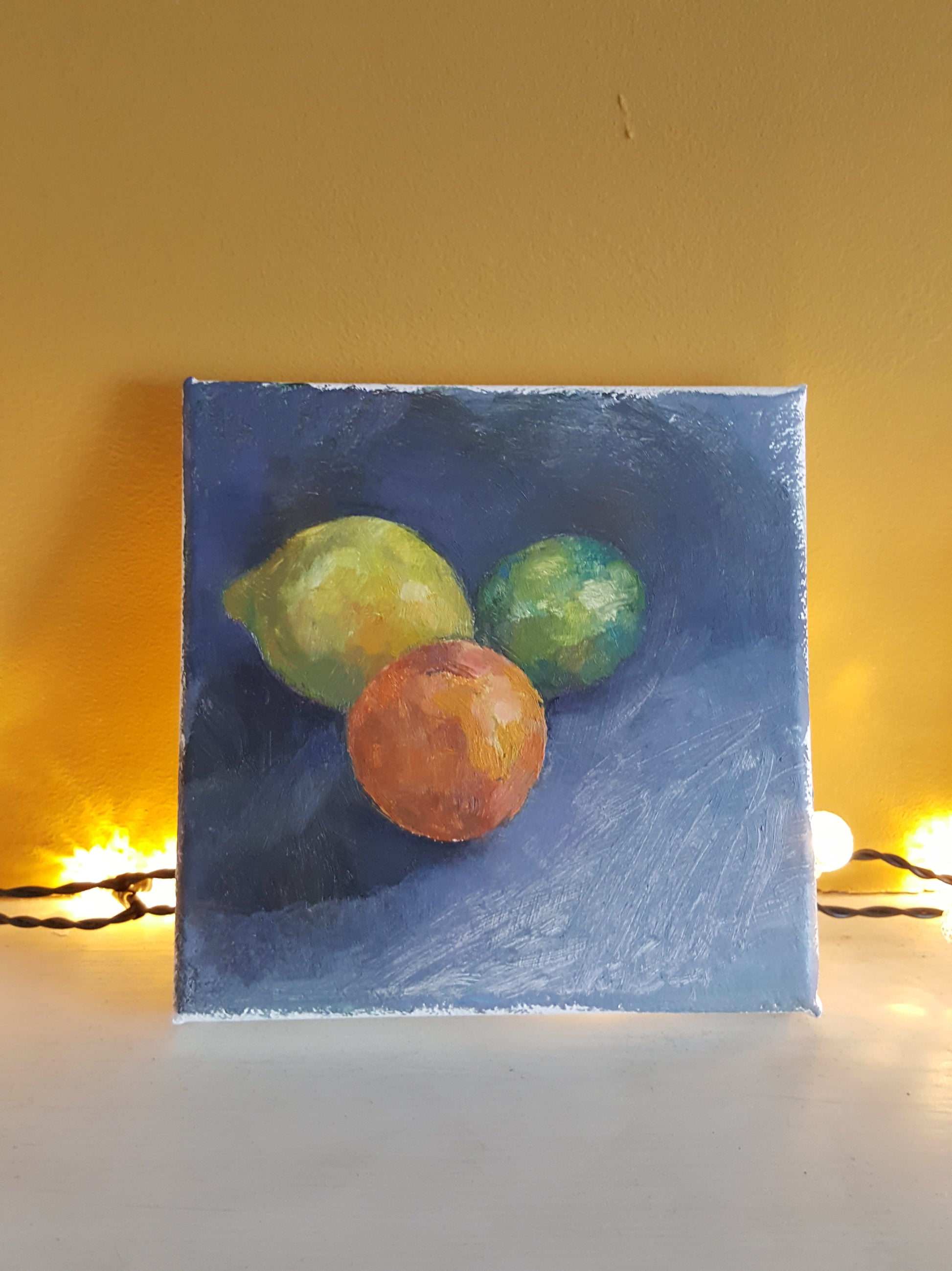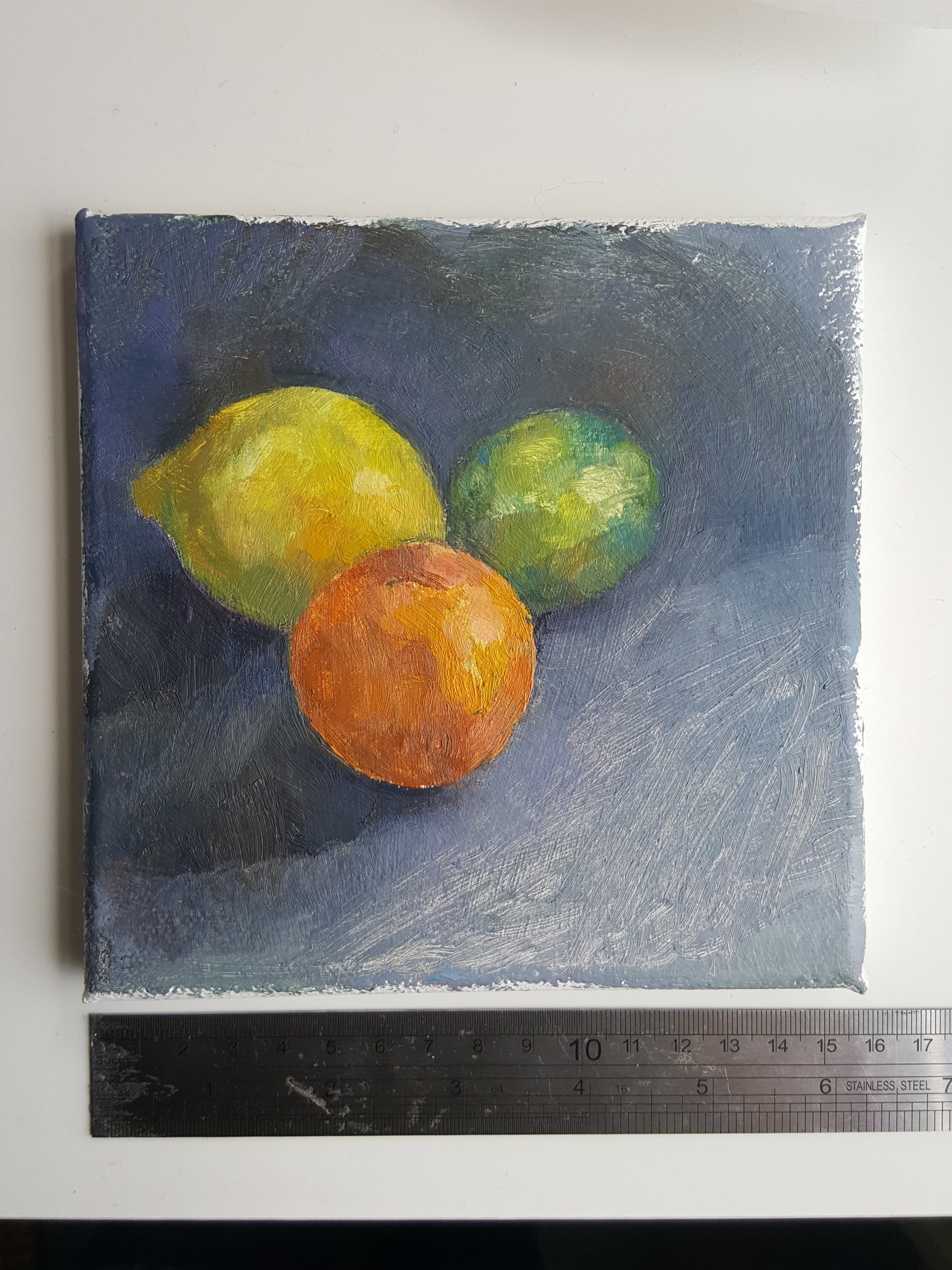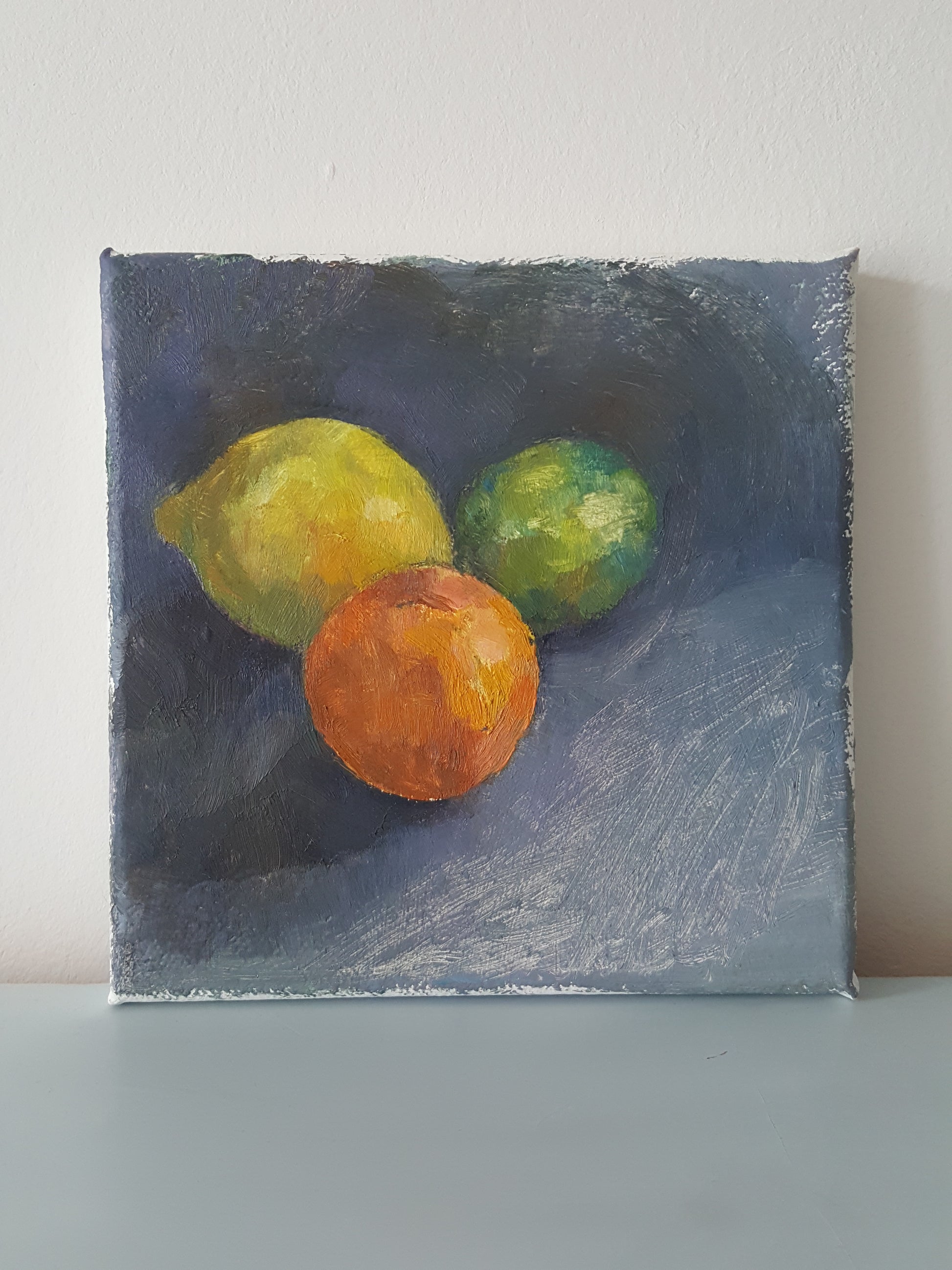 Small oil painting study of citrus fruit against a grey background.