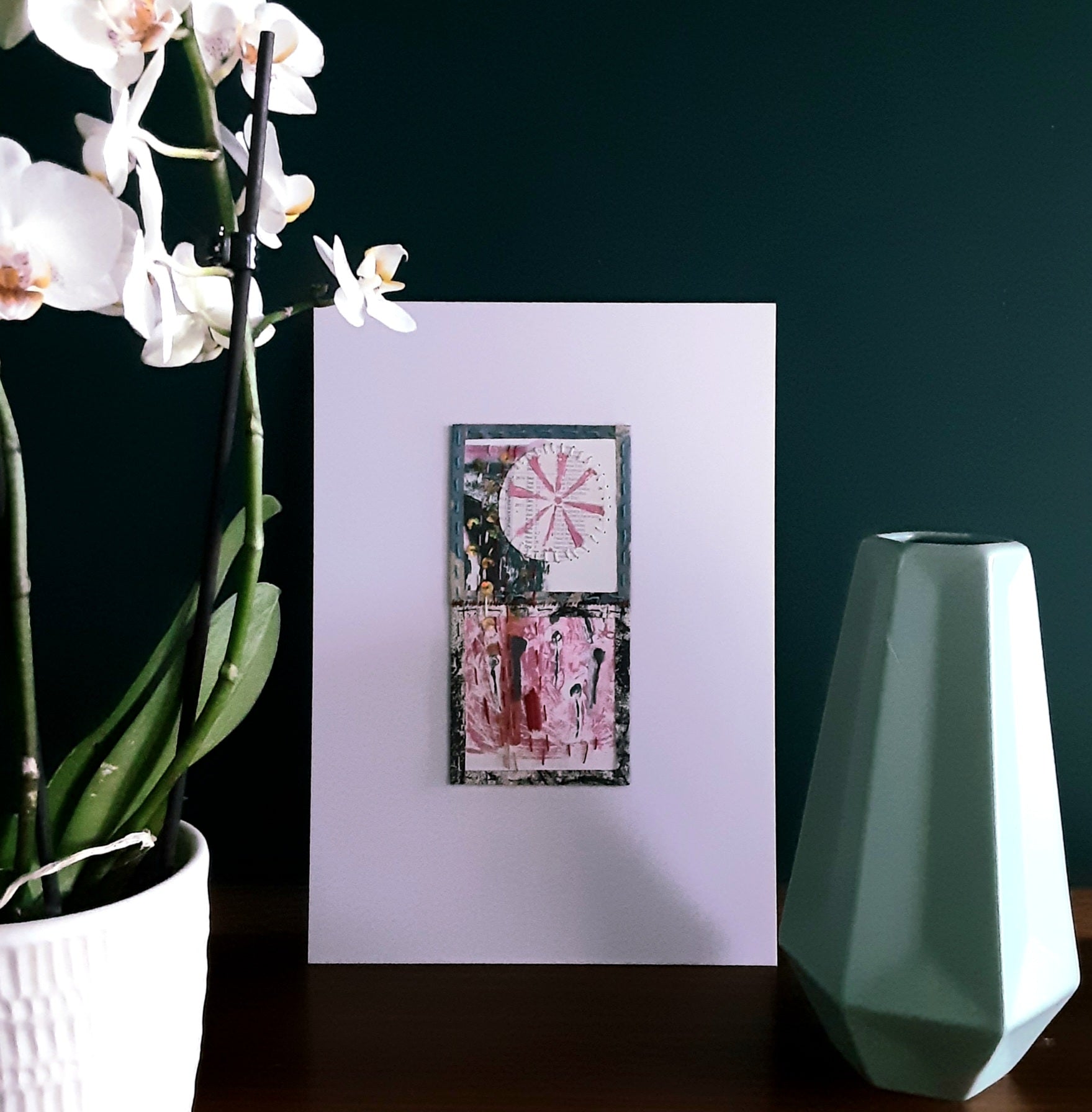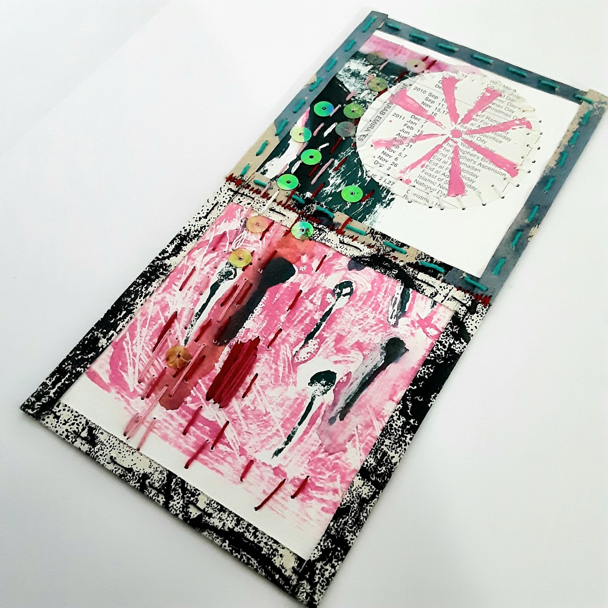 A lovely abstract paper quilt, featuring a sewing theme, meticulously stitched by hand in my Edinburgh home studio. This experimental piece evolved naturally, stemming from a series of mono prints of pins on paper, which I combined with other printed and painted papers. On a gorgeous sunny day, I decided to incorporate some sequins to capture the joyful sunshine, carefully stitching each one in its place by hand. When the light hits them, they add a playful twinkle to the piece.