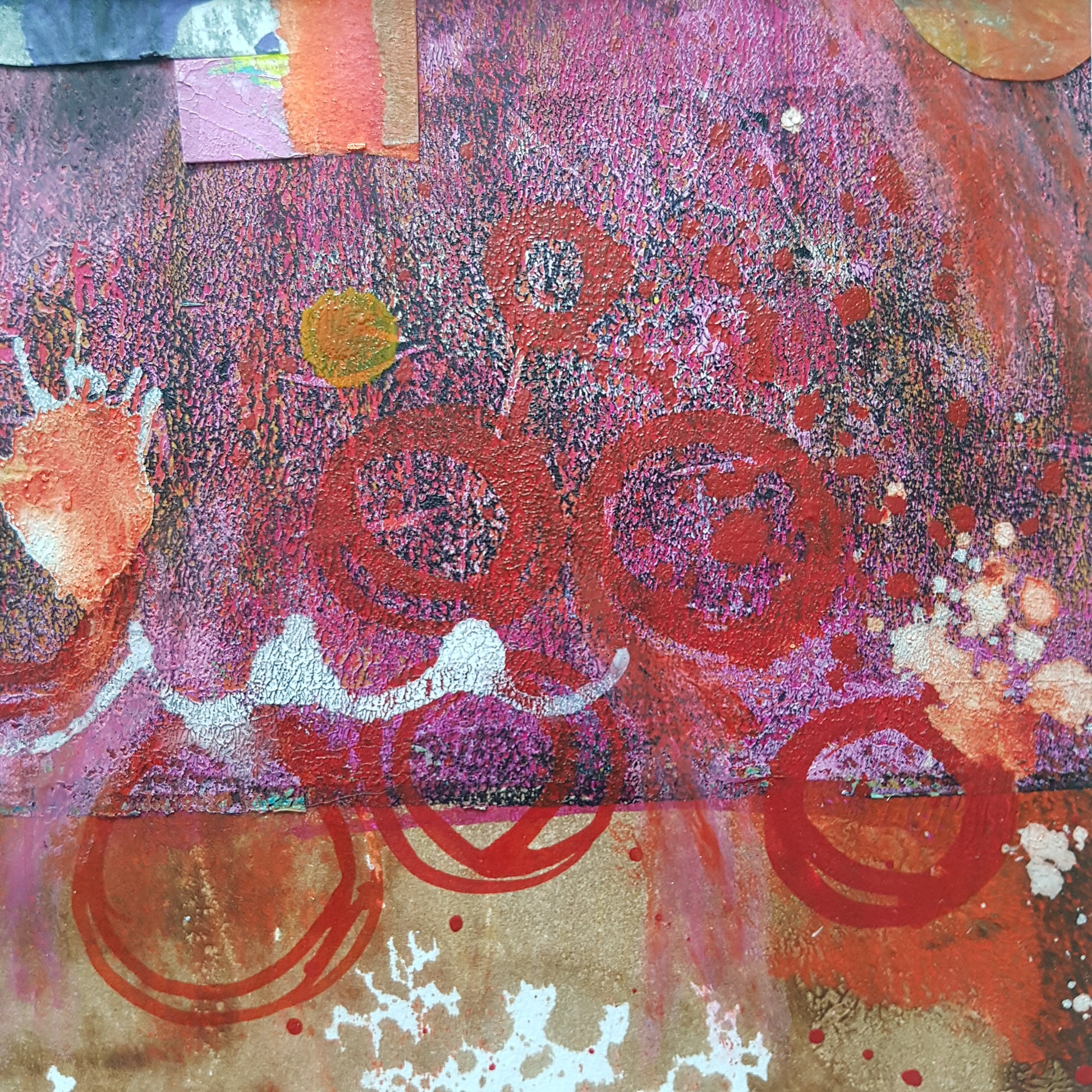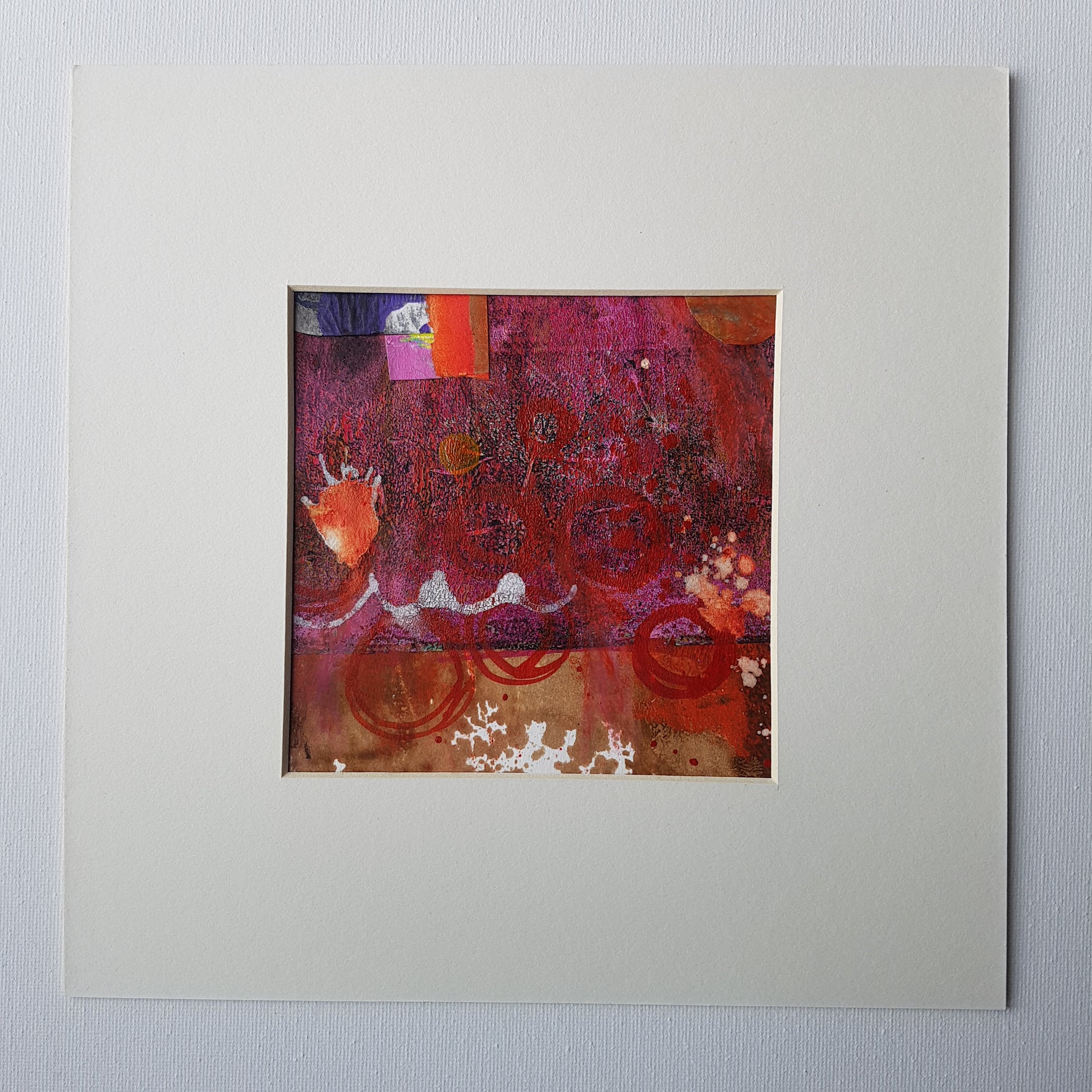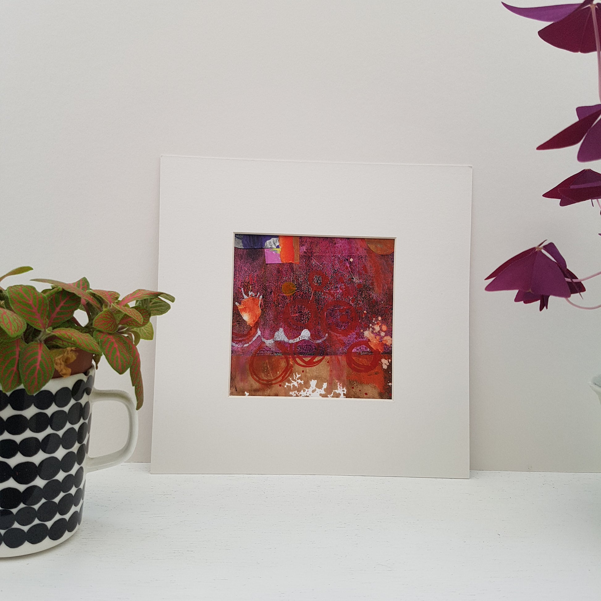 I loved creating this small paper collage. I worked intuitively splashing paint and ink to create mixed painted papers. The different paper elements were pieced together to make an abstract composition, including the sun and moon.