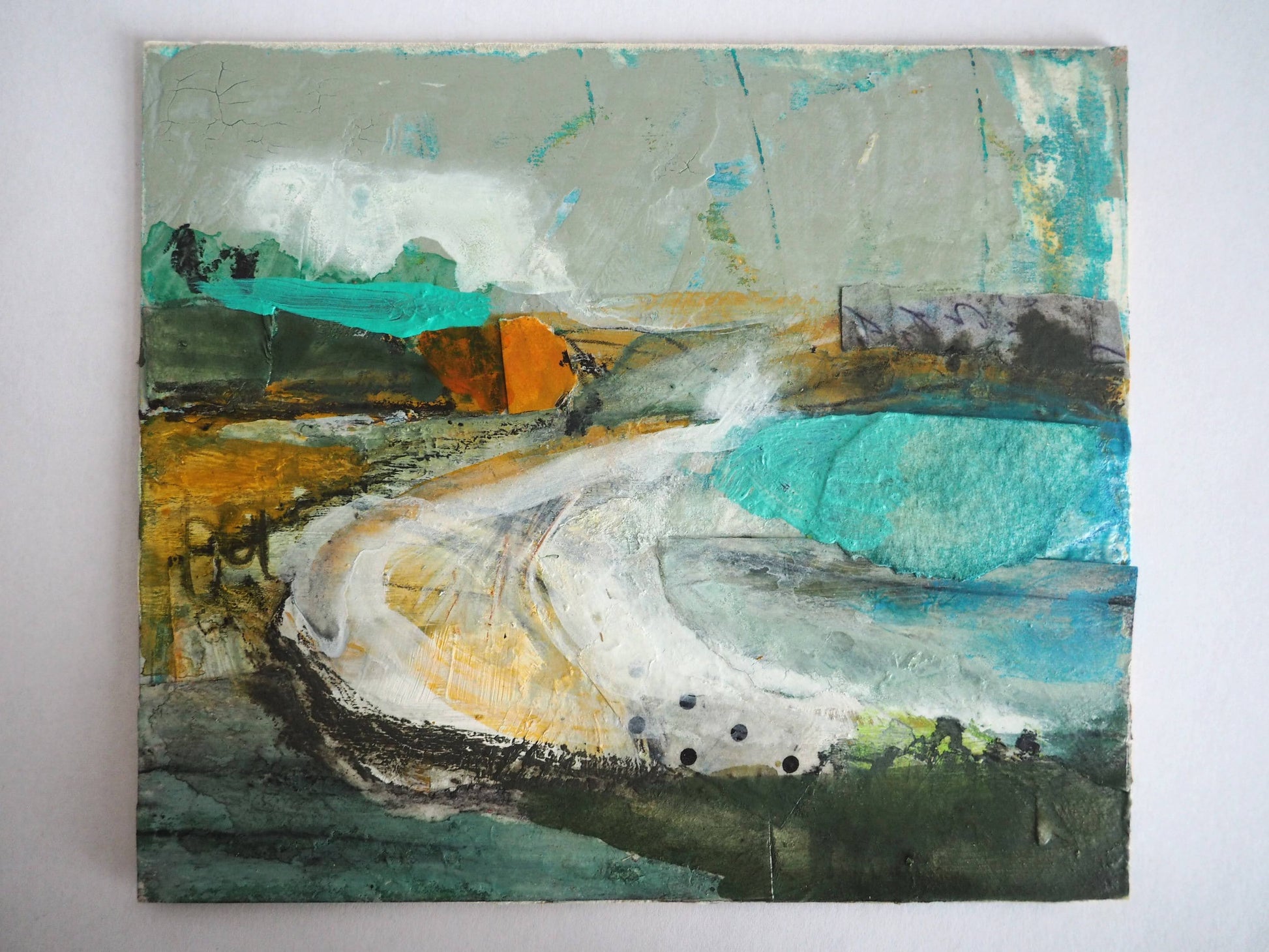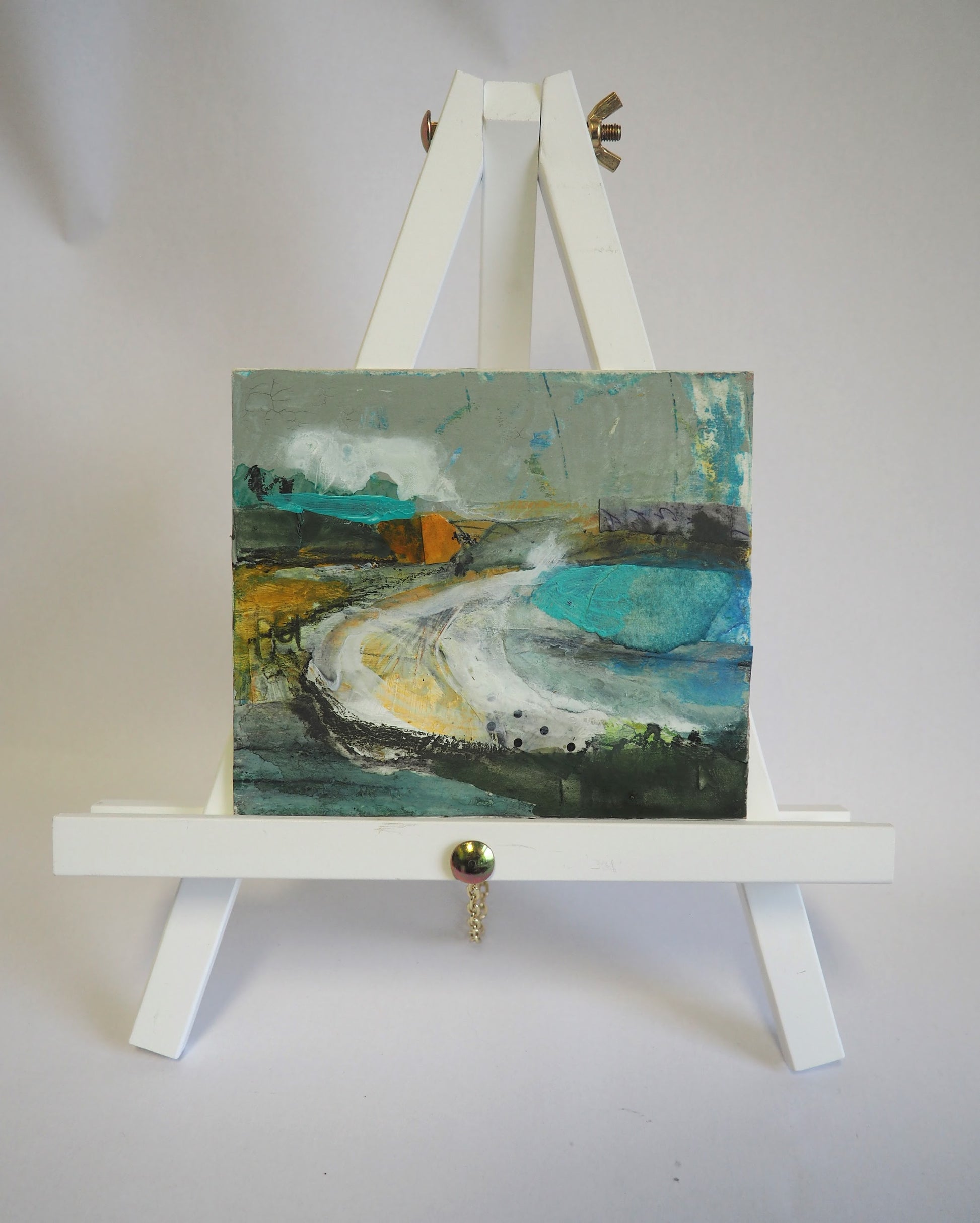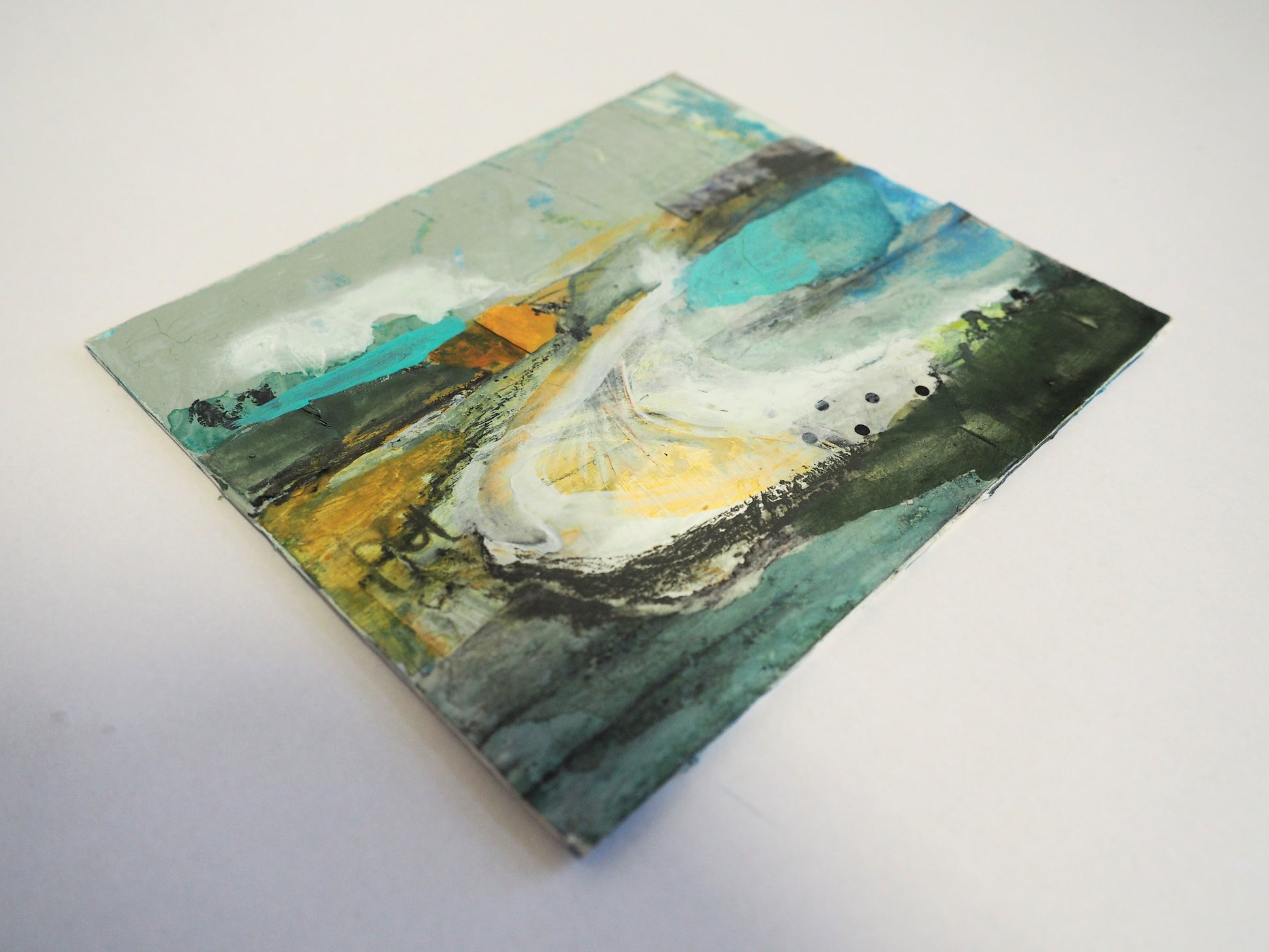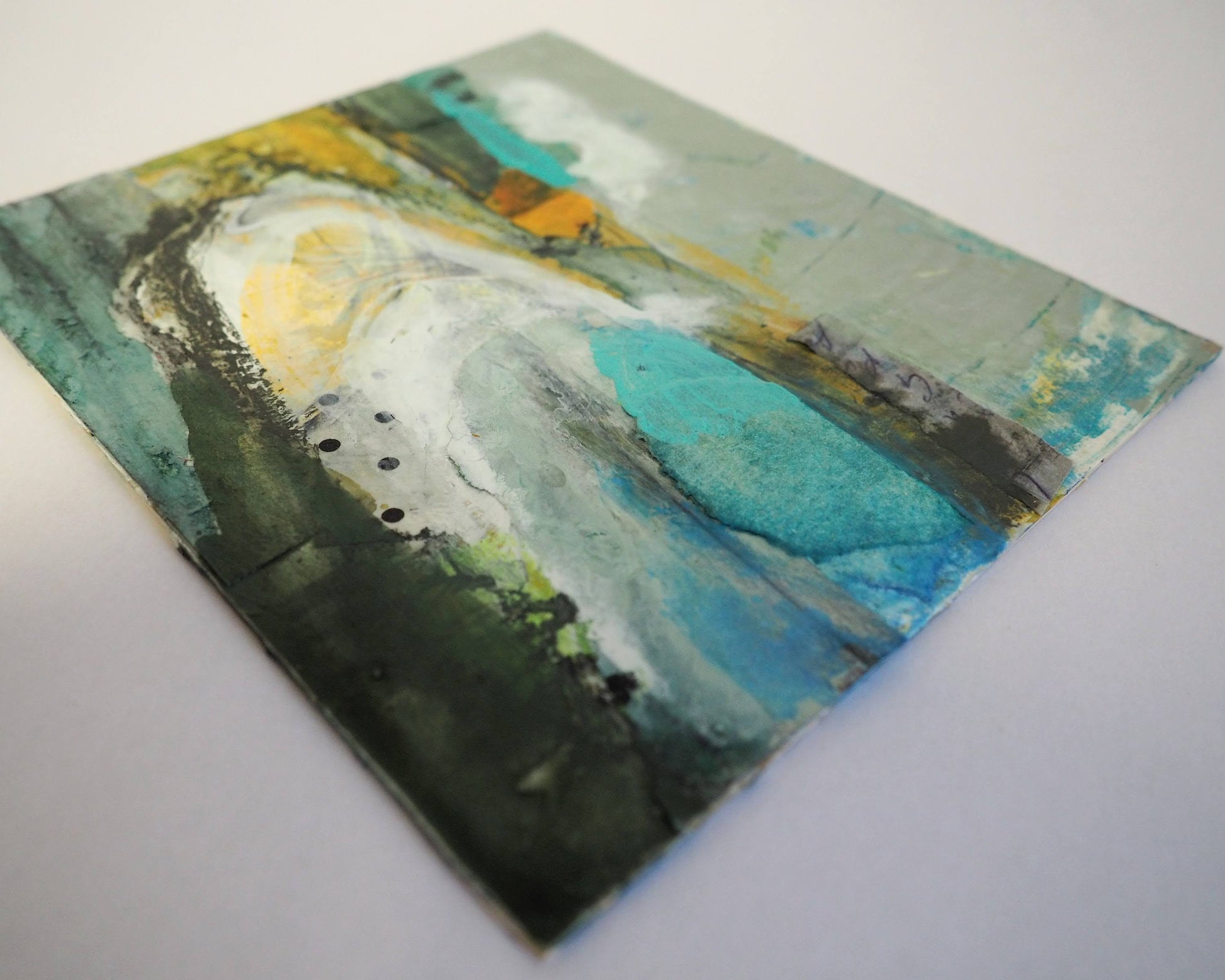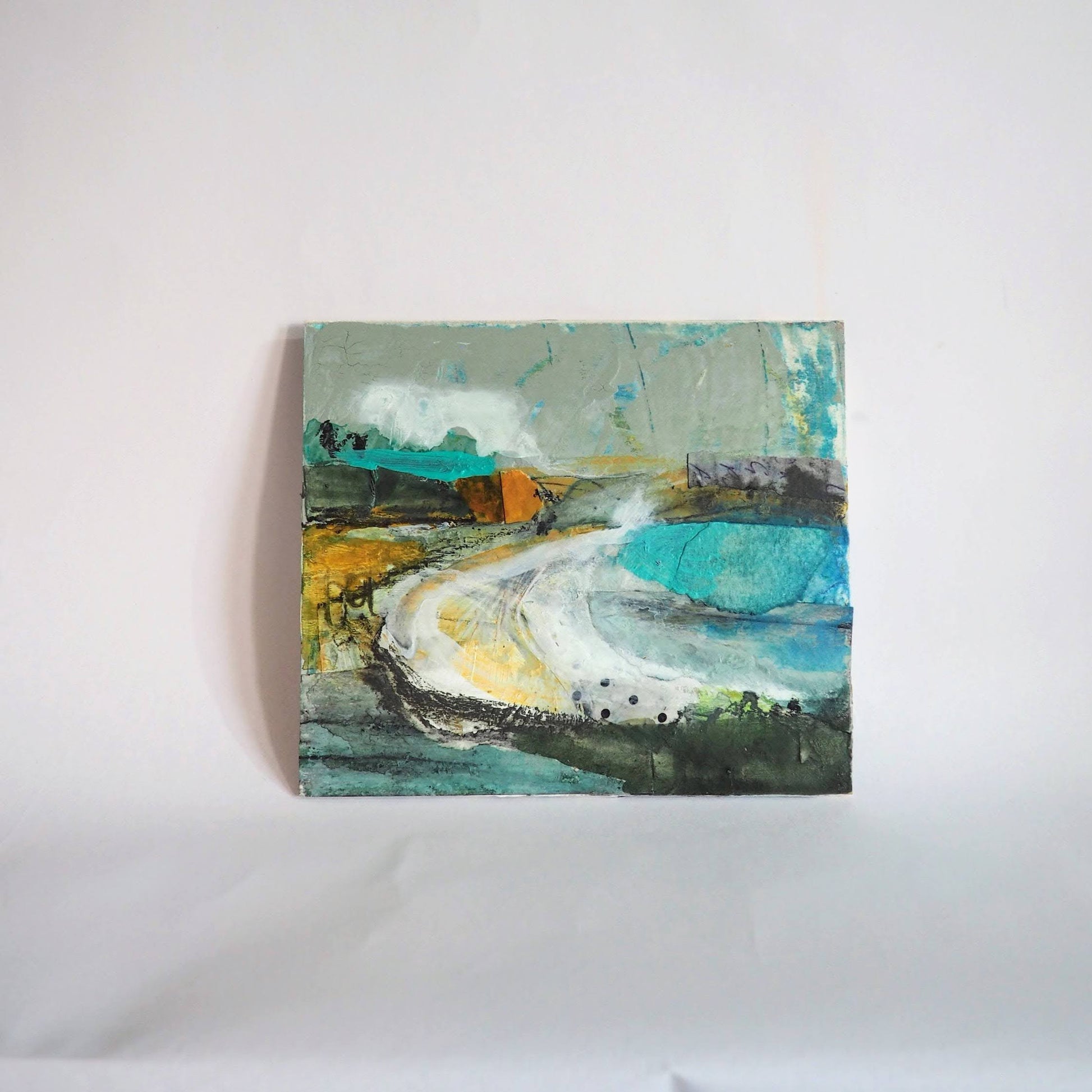This small mixed media artwork, created on card, brings a calming yet uplifting ambience to any space. Shades of grey, turquoise, and yellow create a serene coastal scene, which invites you to pause, breath, and imagine the waves lapping on the shore.