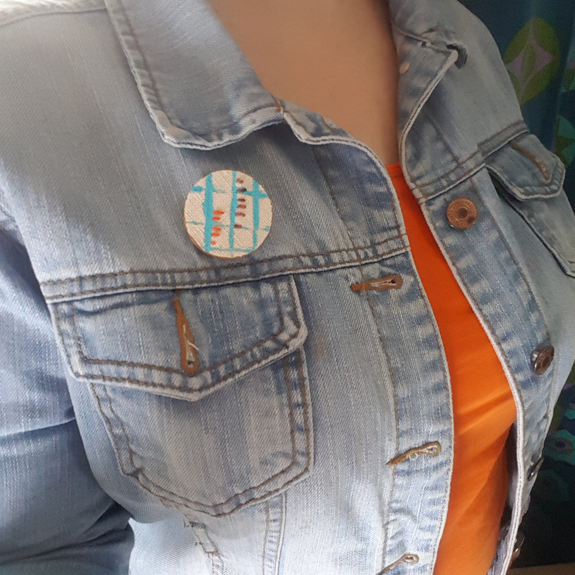 A colourful textile brooch, carefully crafted from beautiful cream Irish linen, with a turquoise geometric net design I printed by hand. Perfect for adding a dash of colour to your outfit.