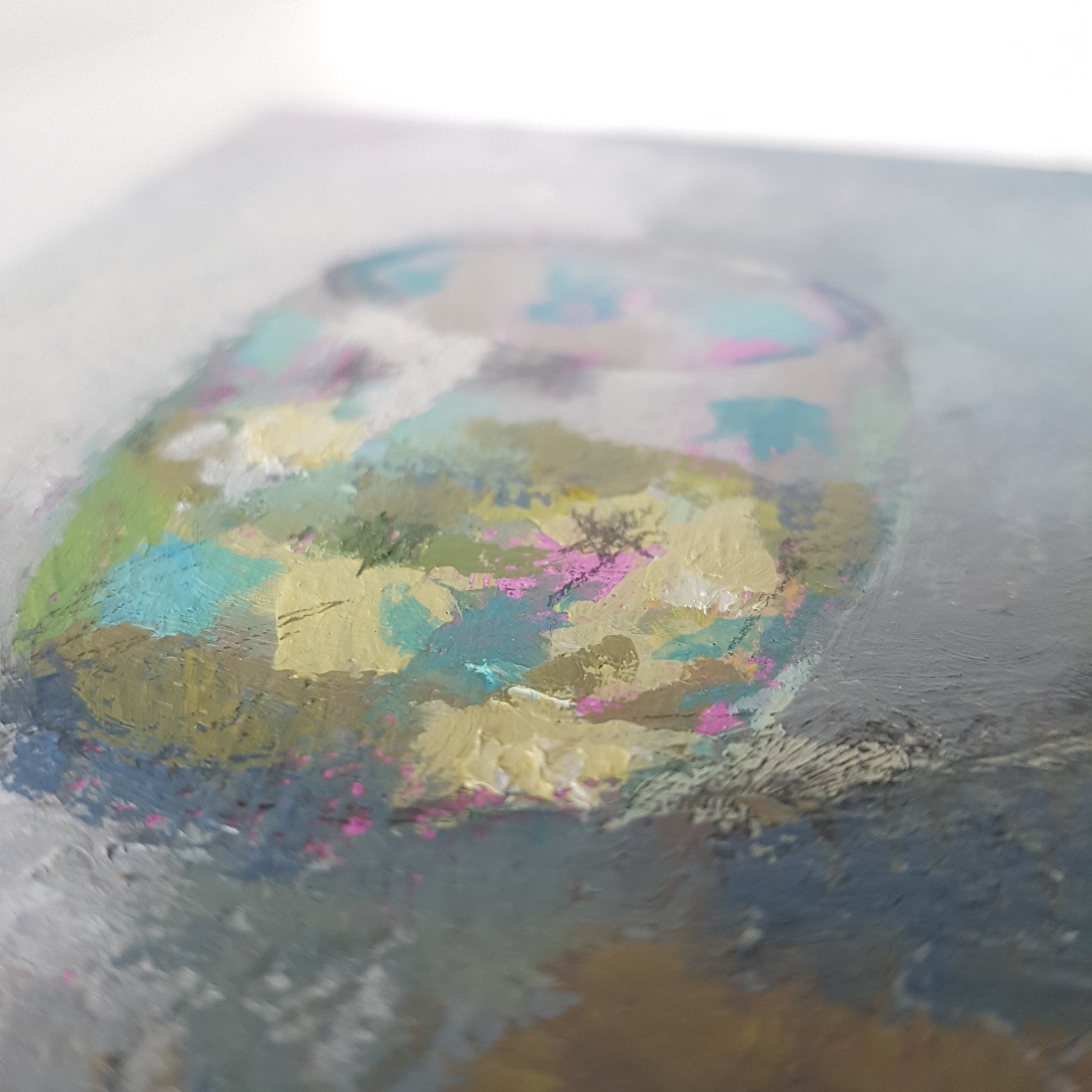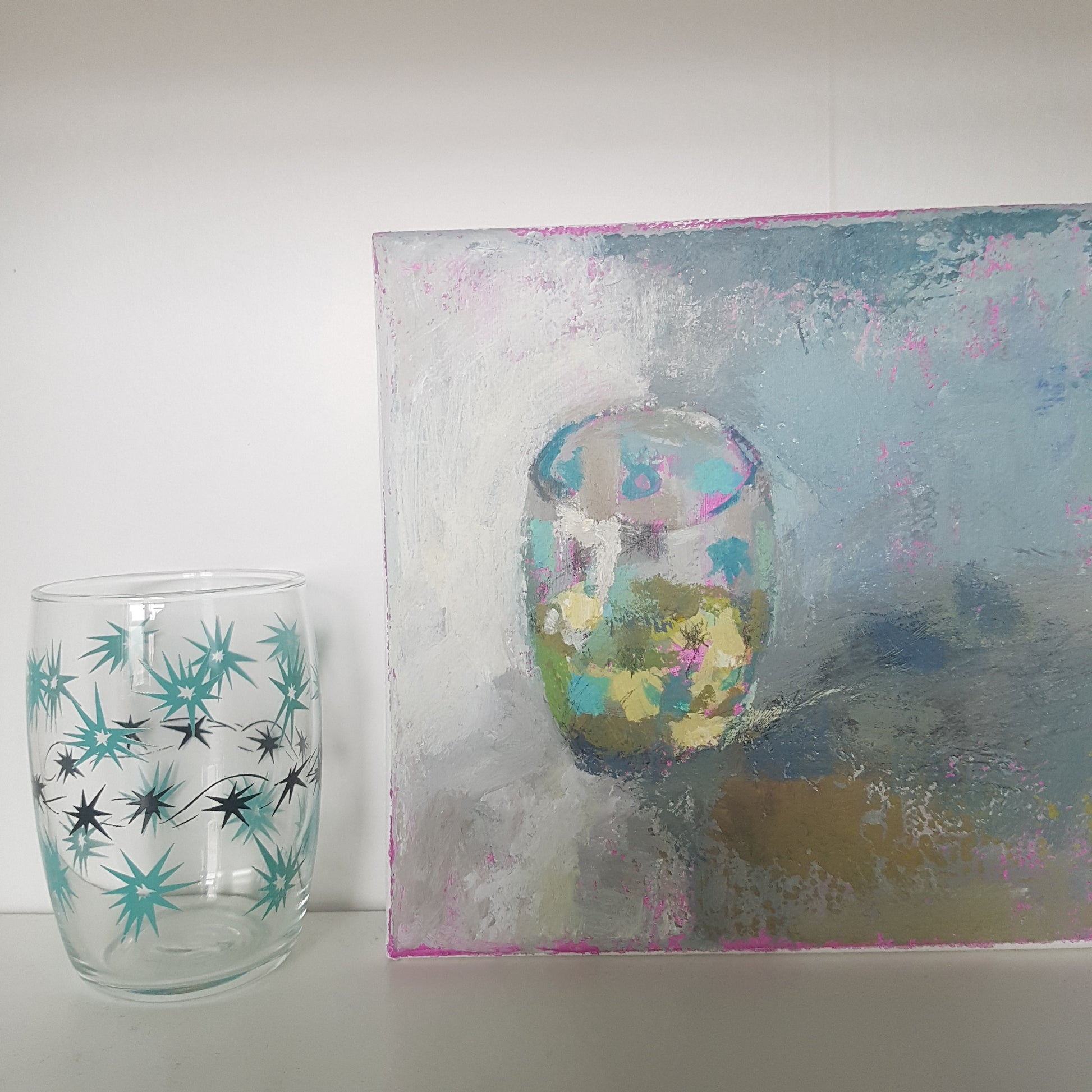 I was fascinated by the way the light hit the 1950s patterned glass and its contents - so instead of drinking it, I set out to capture the reflections in the lime green liquid (or is that chartreuse) in paint.