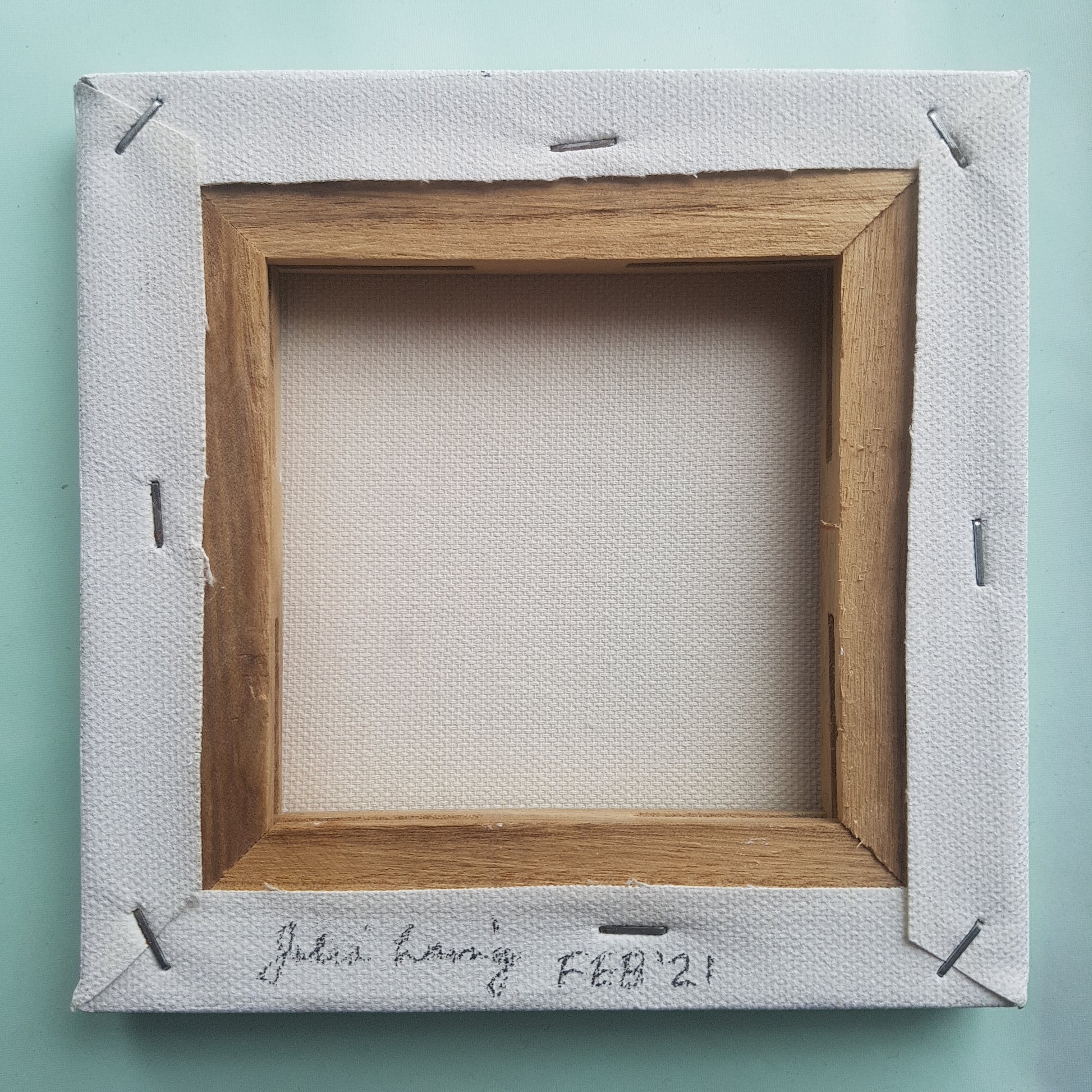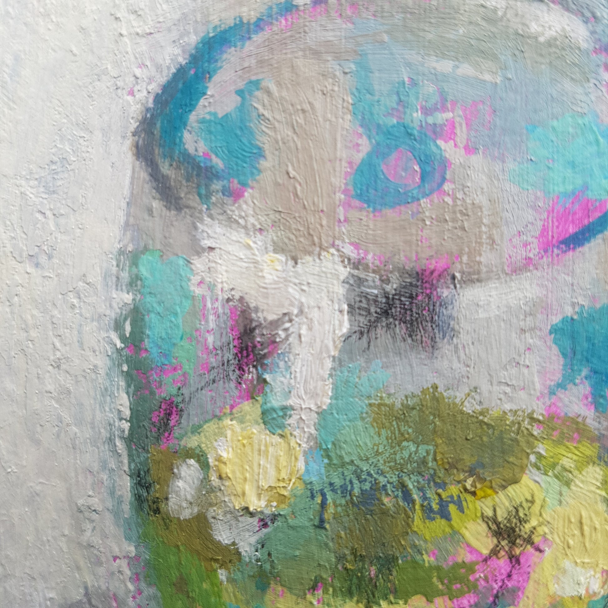 Painted on primed canvas, using artists' quality acrylic paints, matte medium, and black coloured pencil.