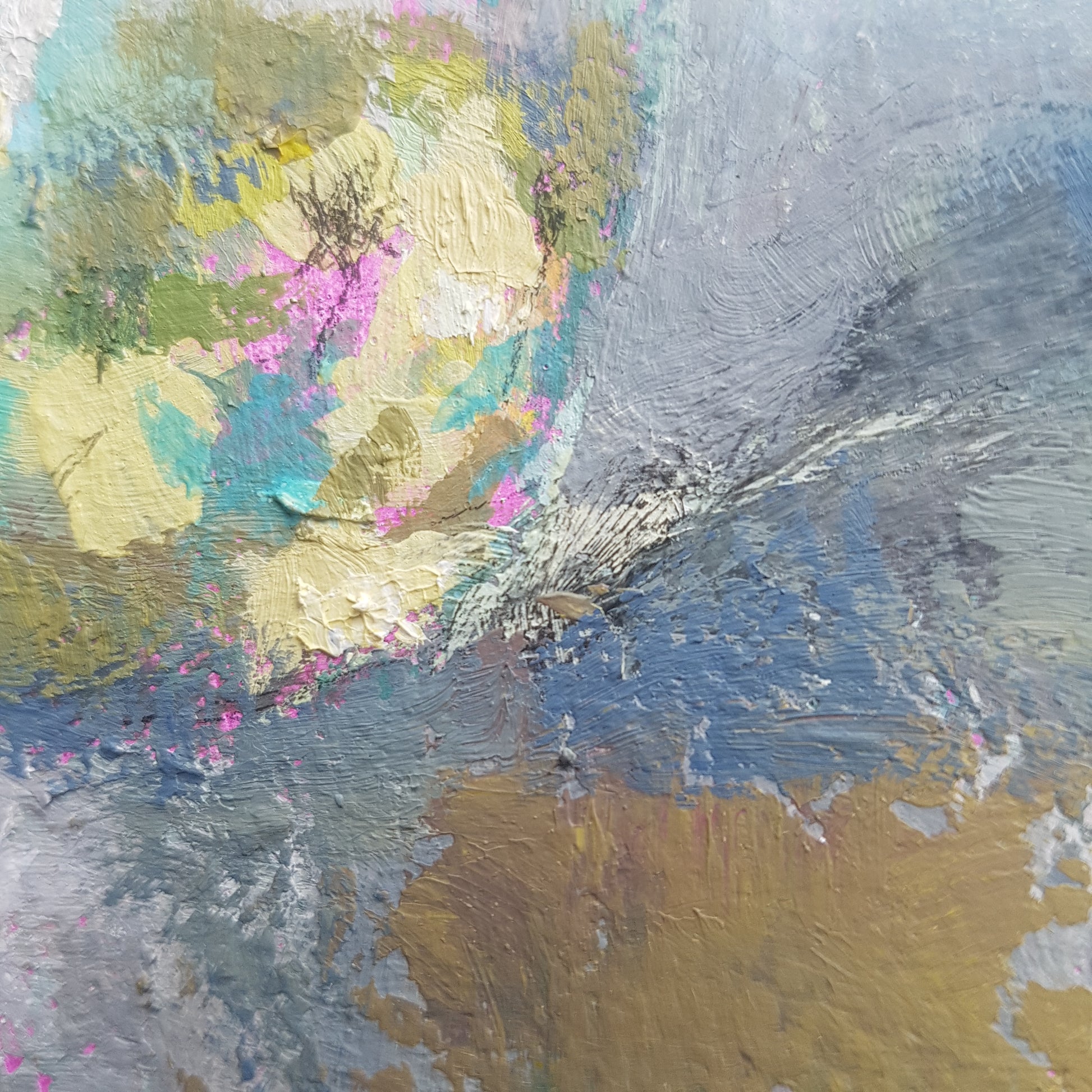 The paint was applied to the canvas with a variety of tools including hogs hair brushes and a palette knife, which have created a richly textured surface.