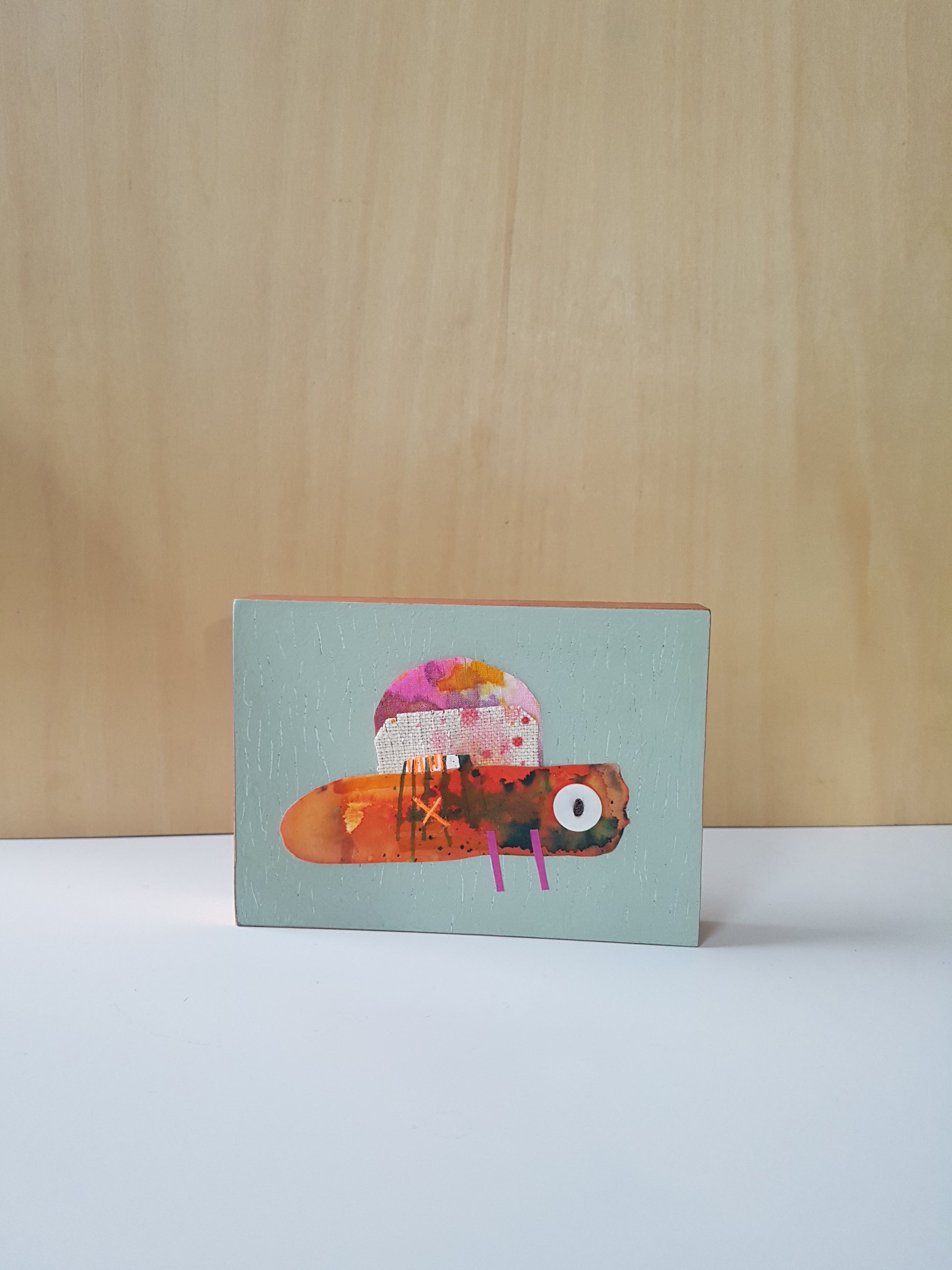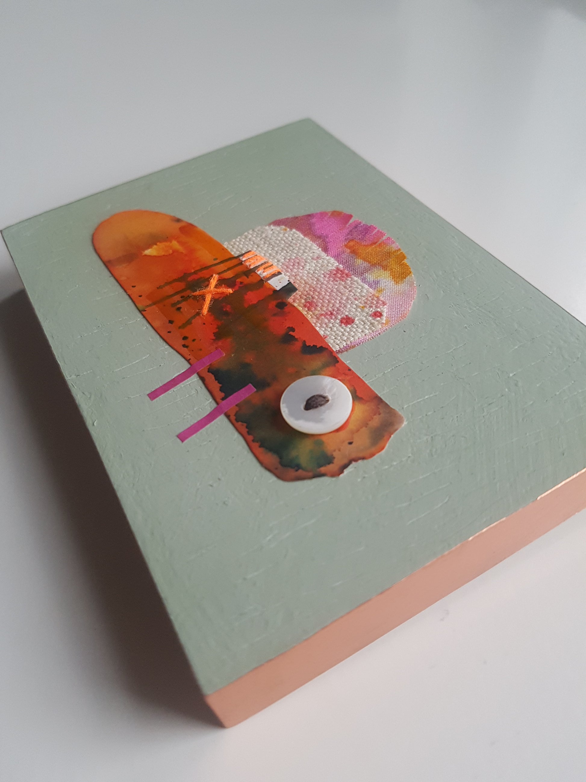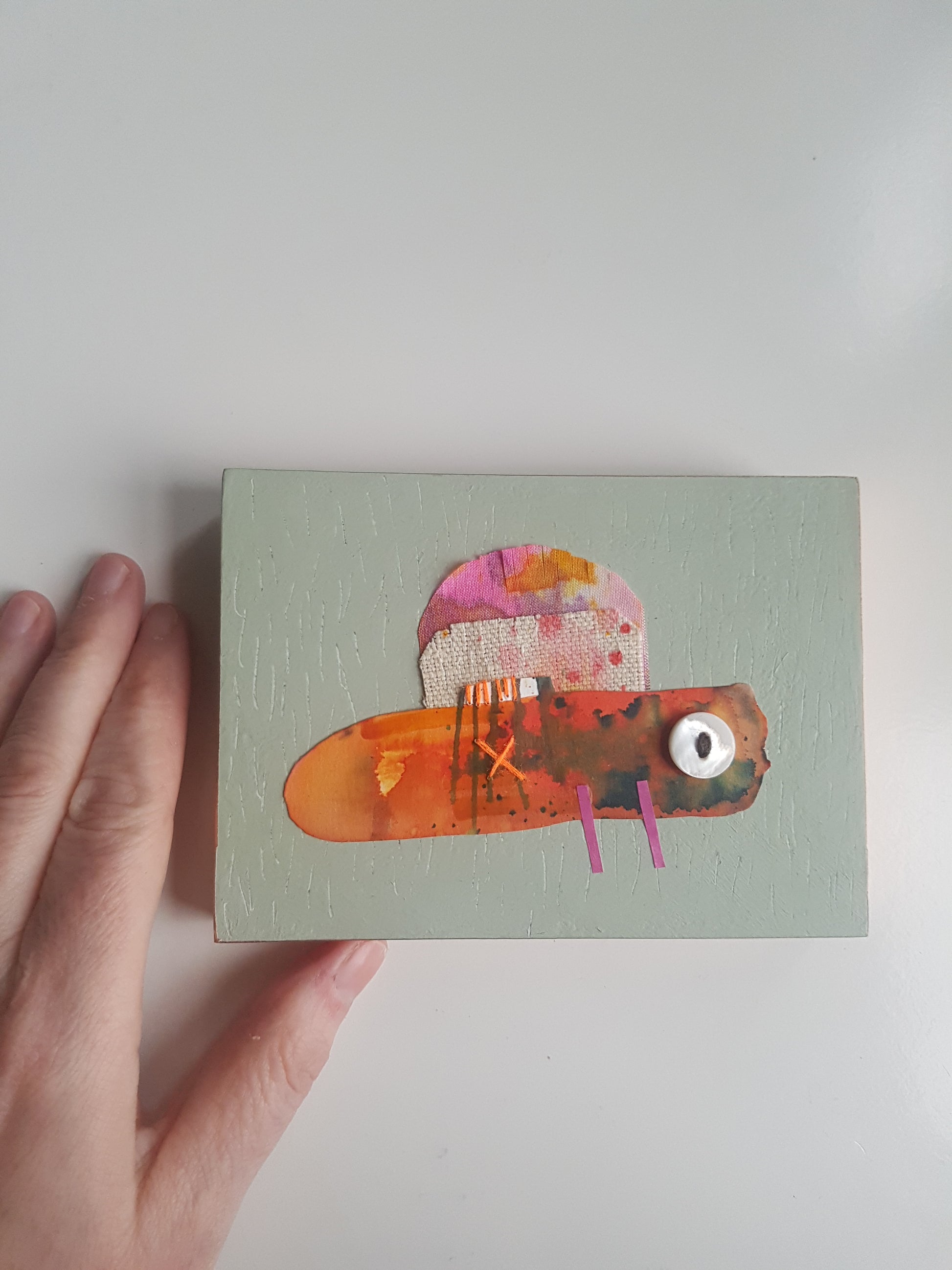 A colourful little critter collage, made from an eclectic mix of painted fabric and papers, with stitch and buttons too - all applied to an MDF panel, finished with shiny copper tape edging.