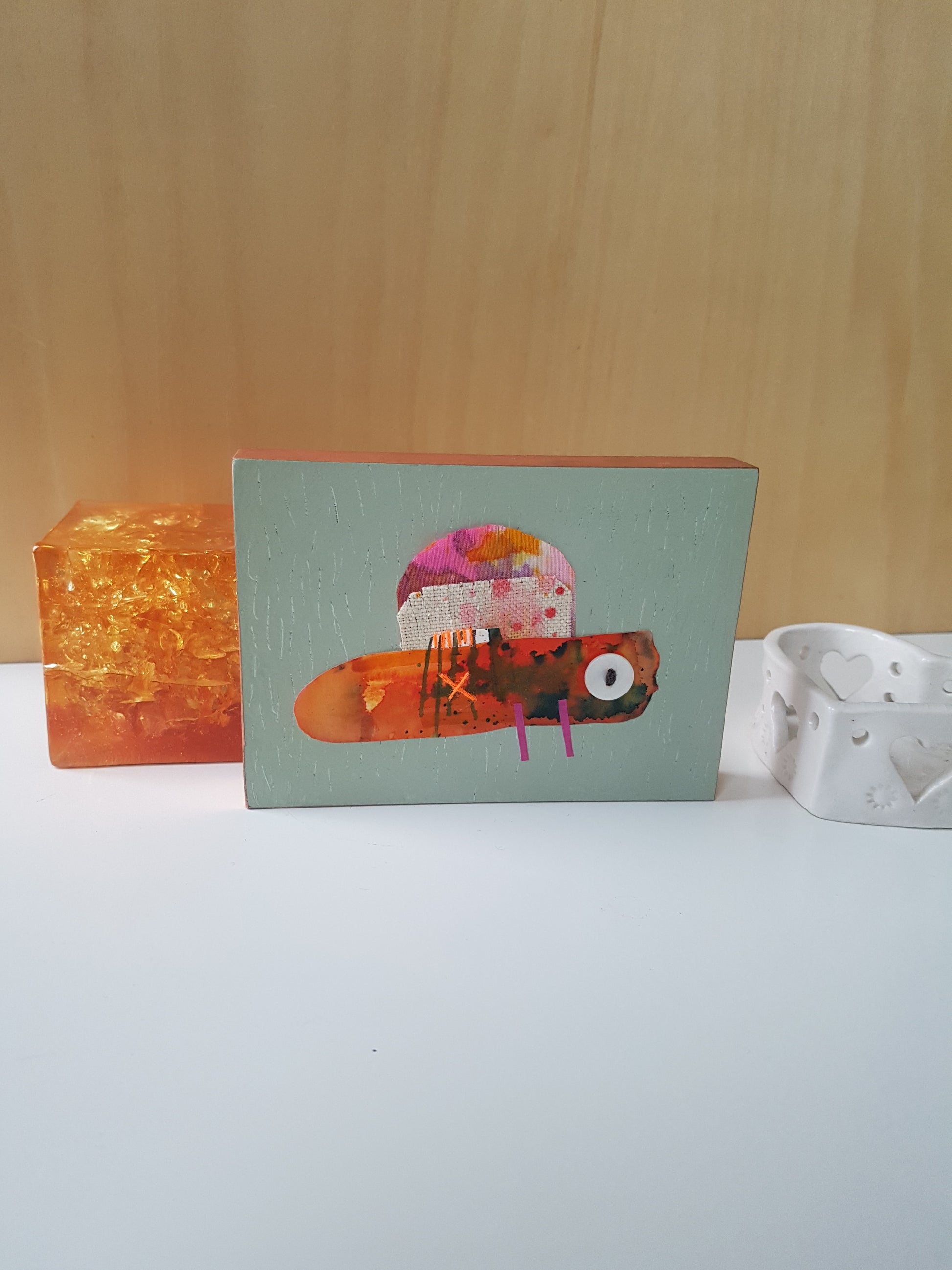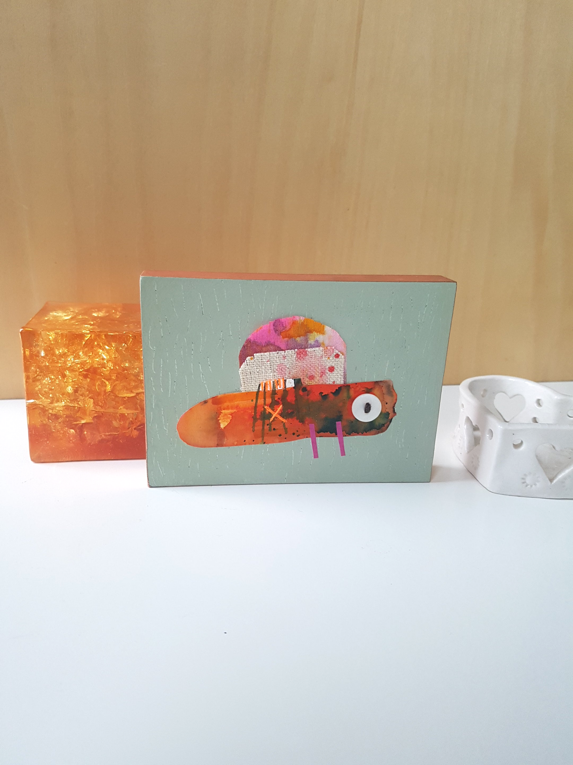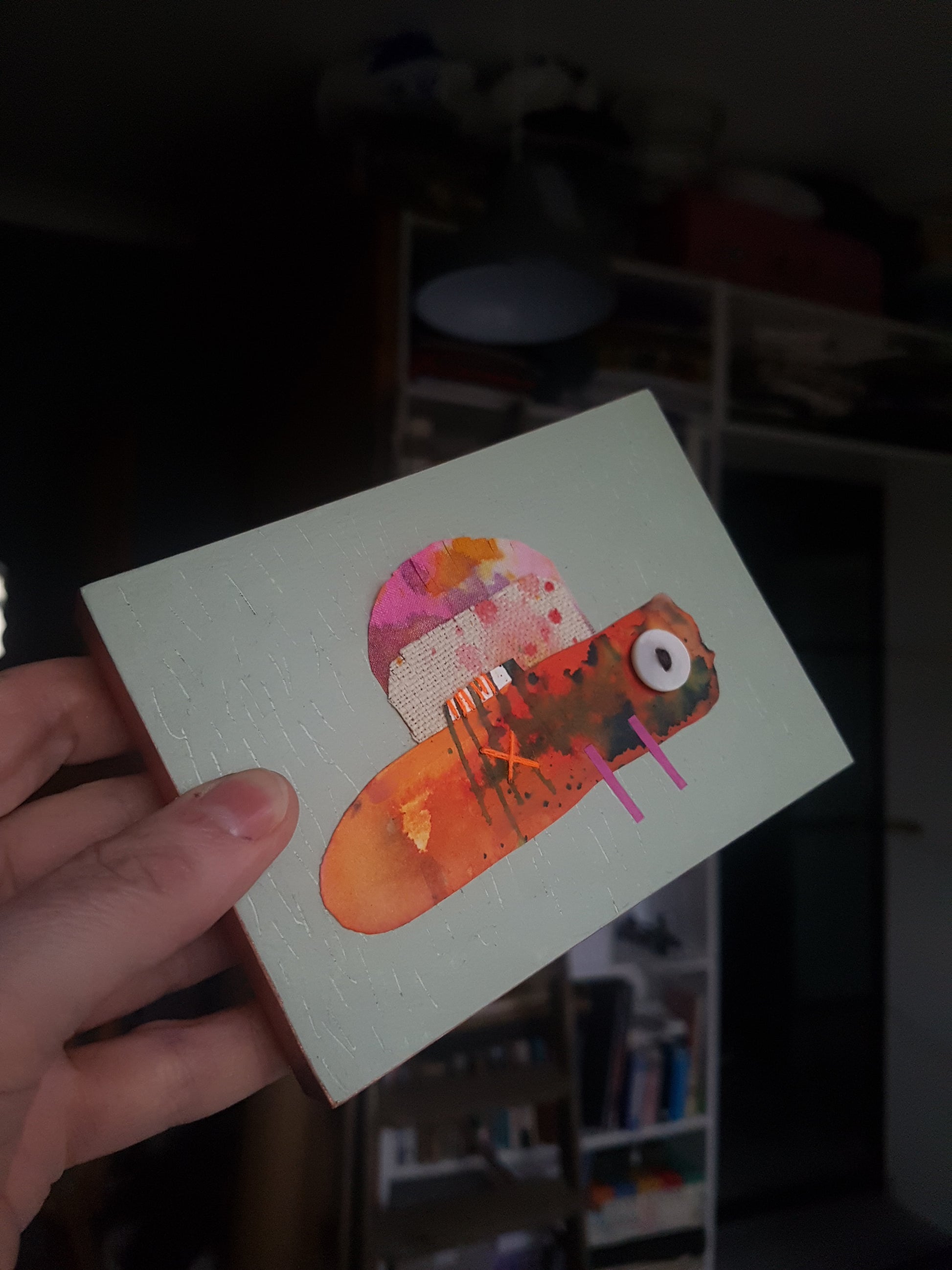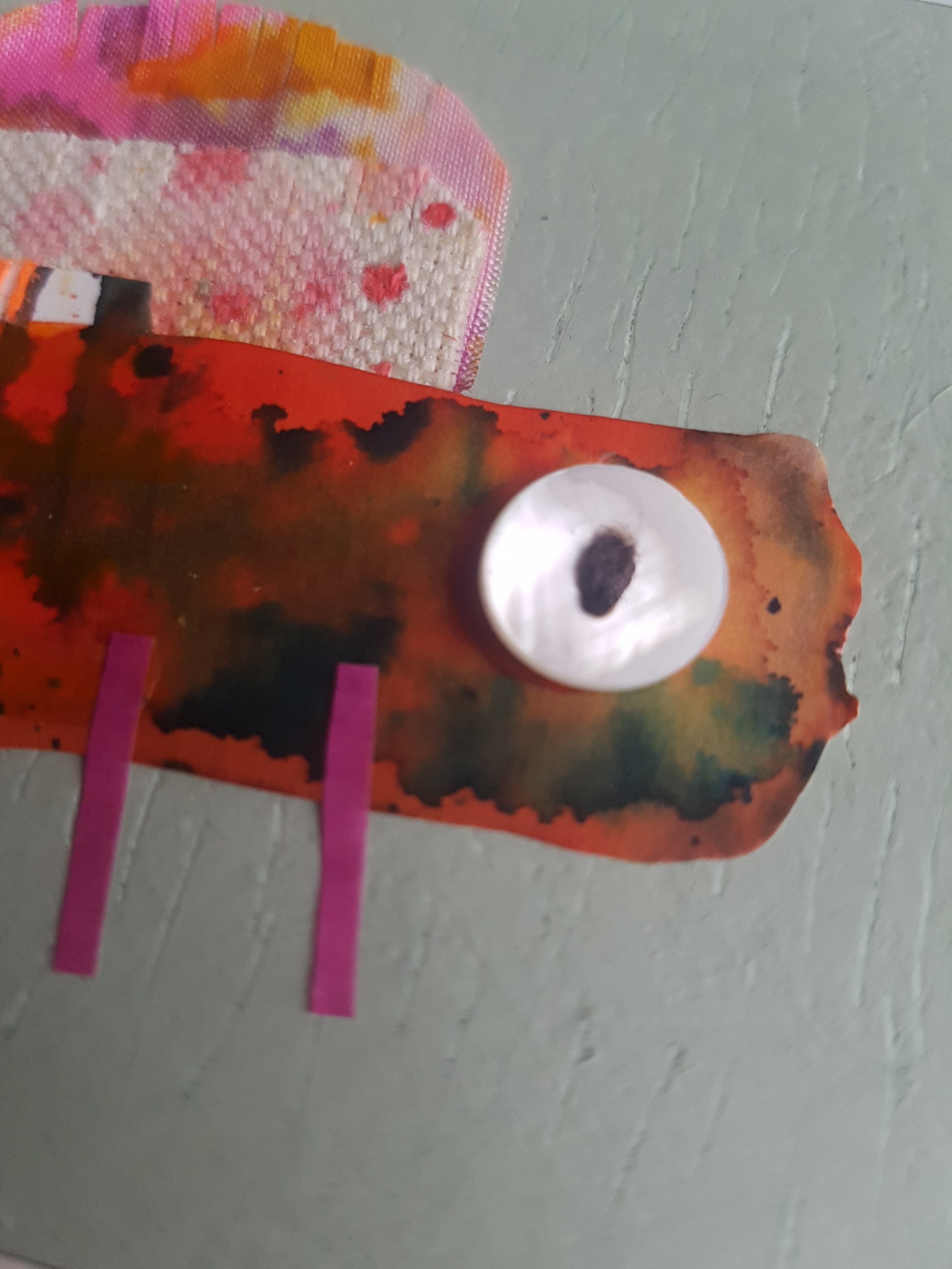 A colourful little critter collage, made from an eclectic mix of painted fabric and papers, with stitch and buttons too - all applied to an MDF panel, finished with shiny copper tape edging.