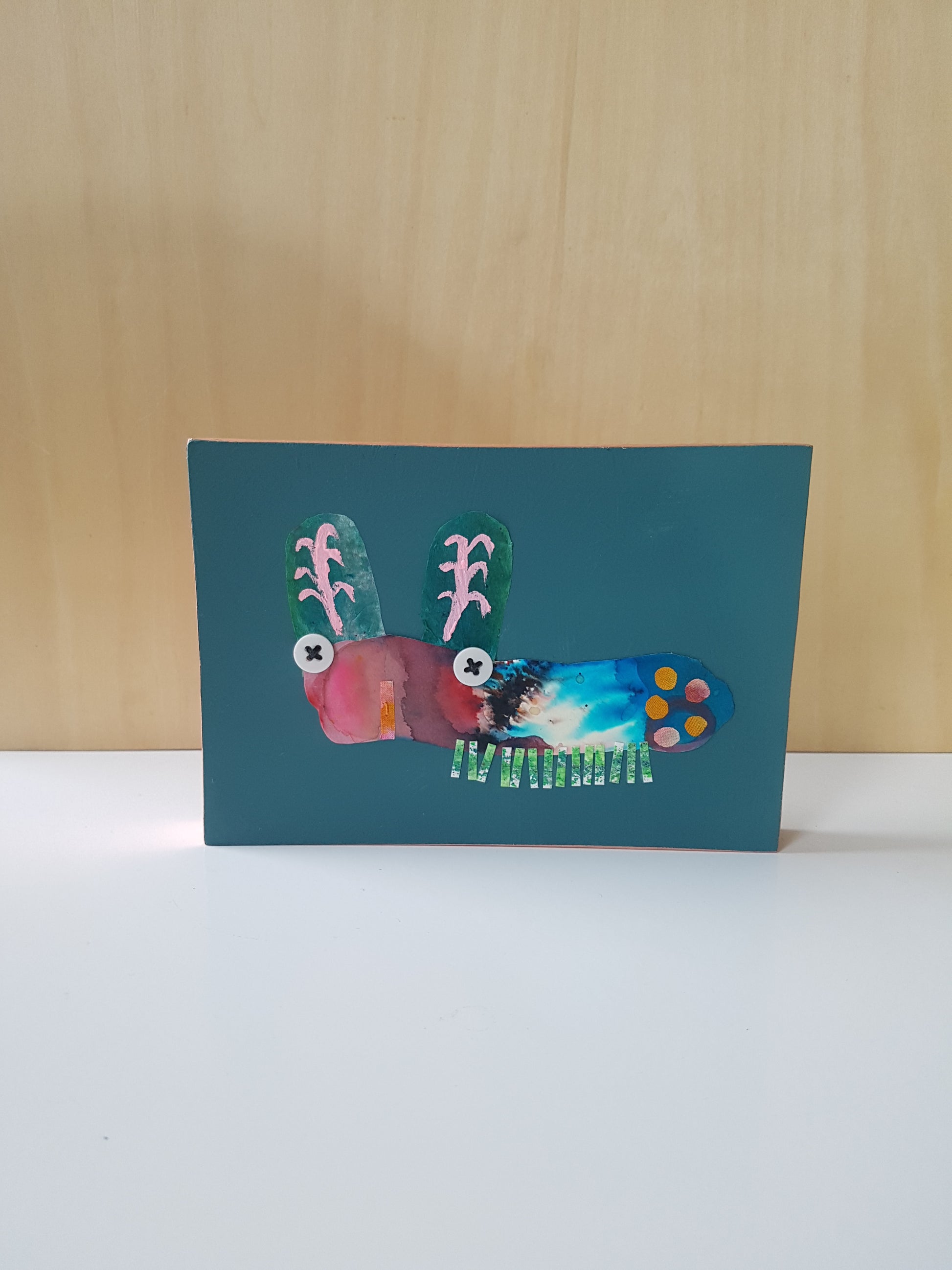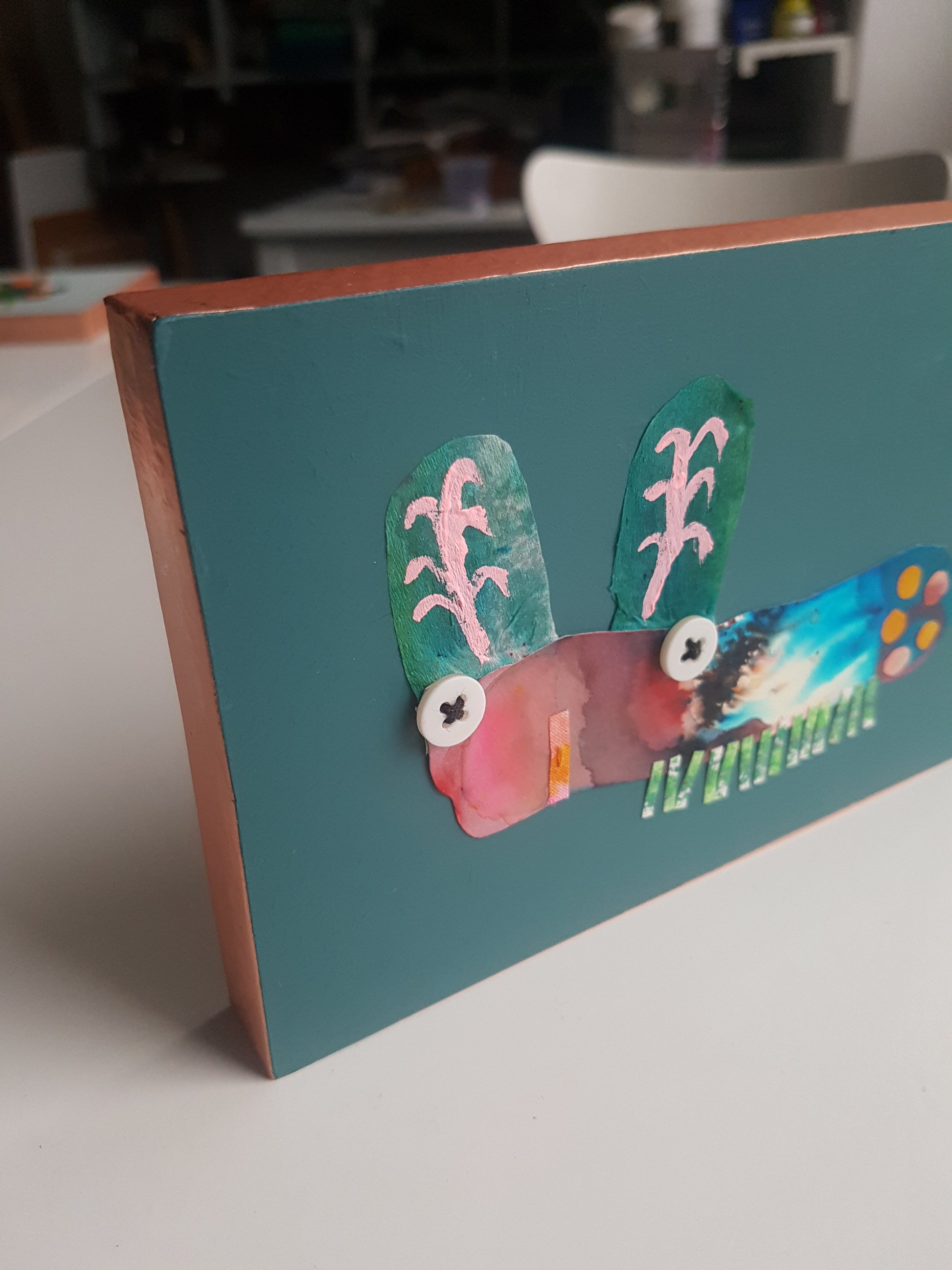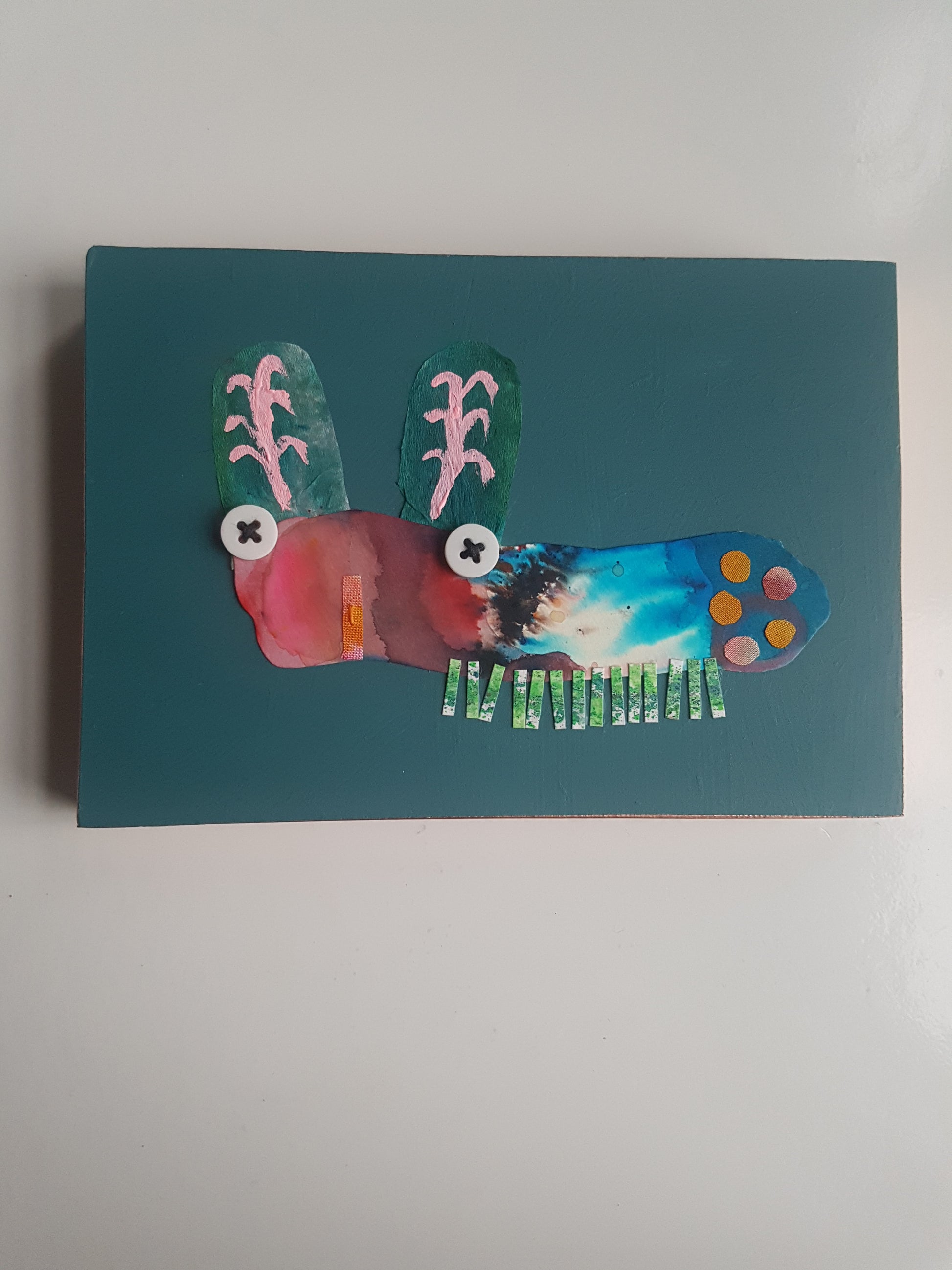 A colourful little critter collage, made from an eclectic mix of painted fabric and papers, with stitch and buttons too - all applied to an MDF panel, finished with shiny copper tape edging.