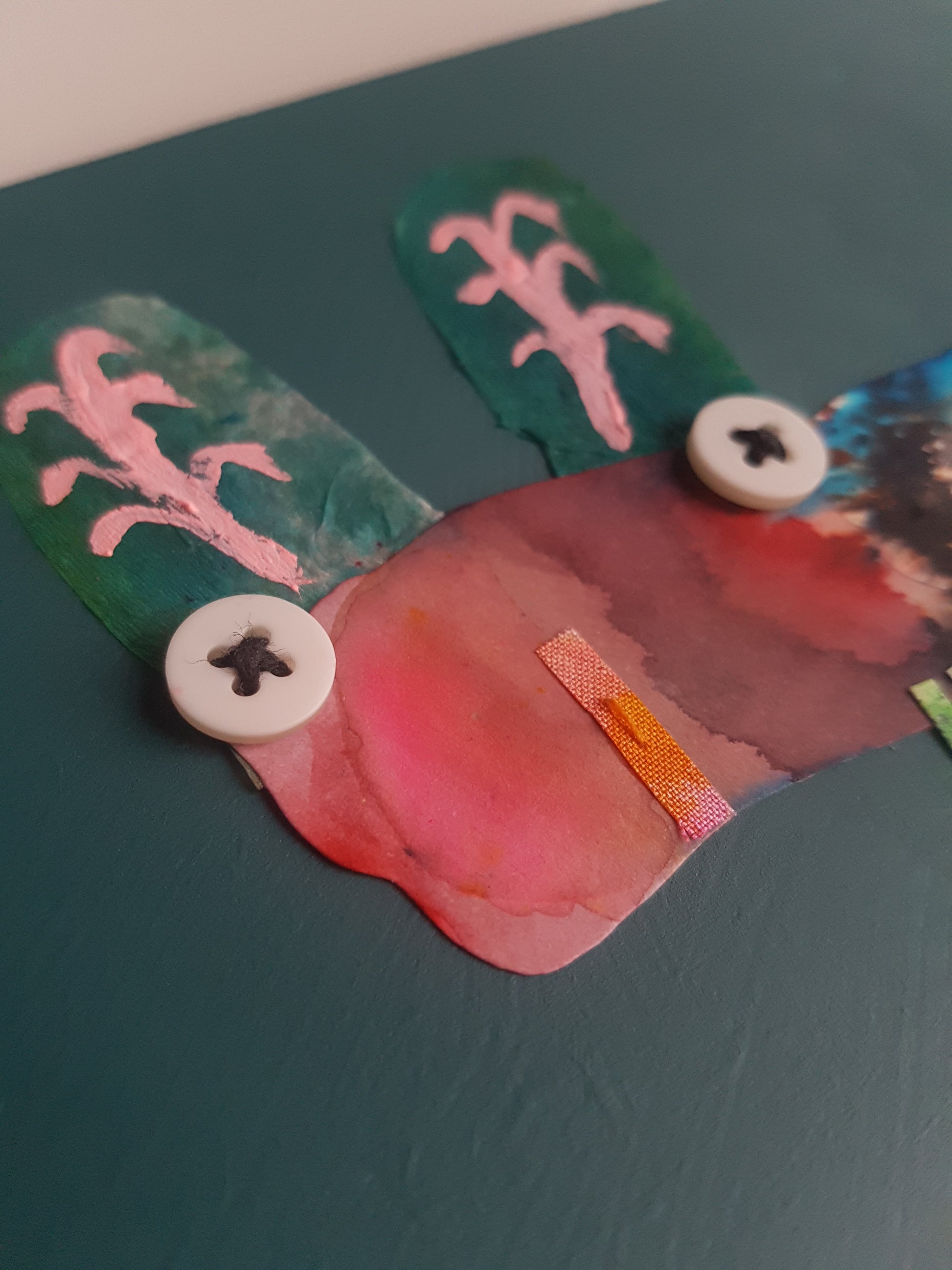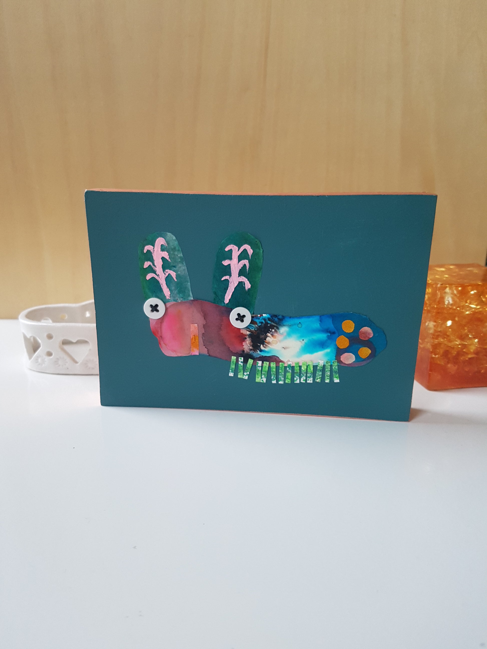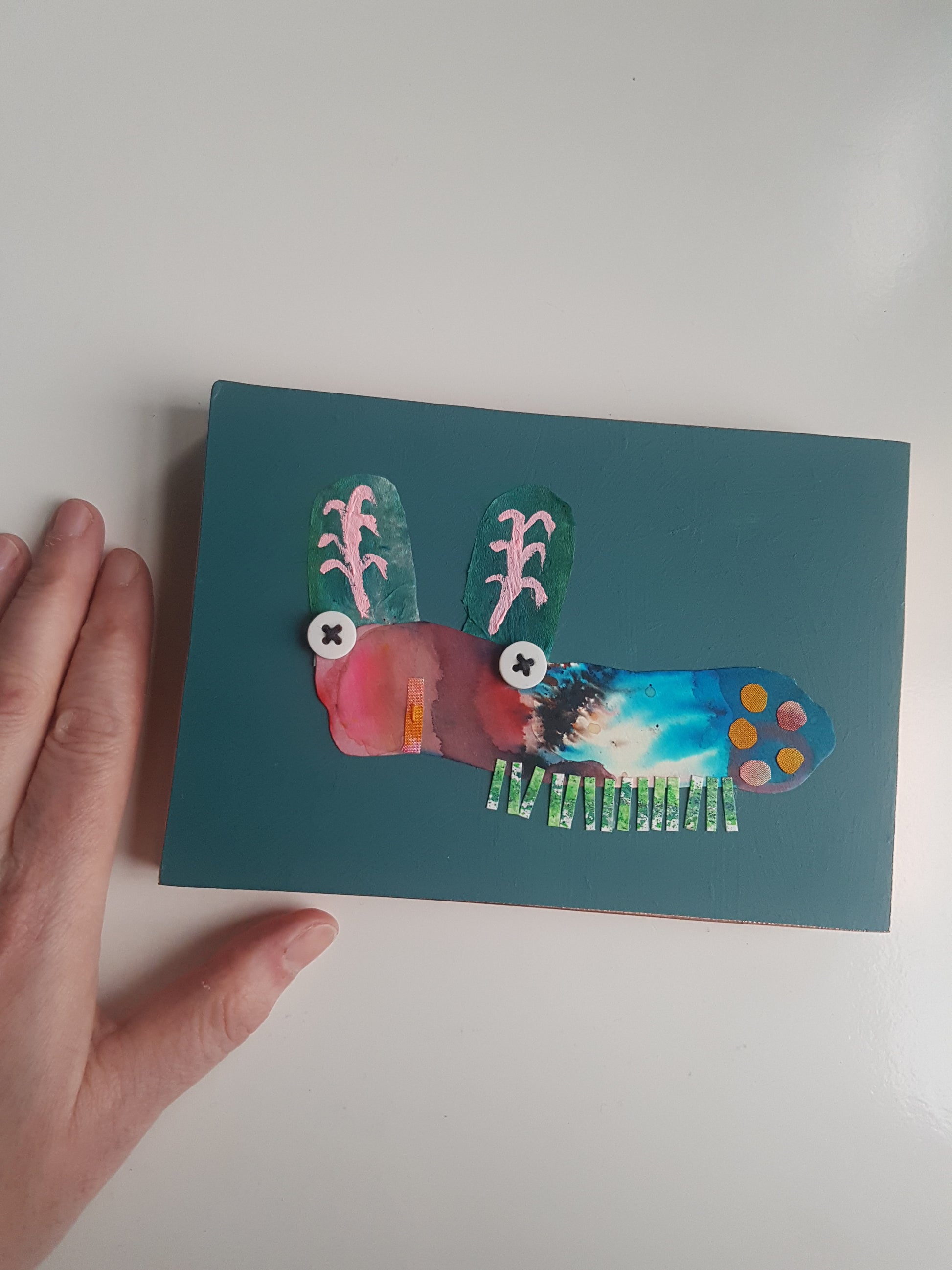 A colourful little critter collage, made from an eclectic mix of painted fabric and papers, with stitch and buttons too - all applied to an MDF panel, finished with shiny copper tape edging.