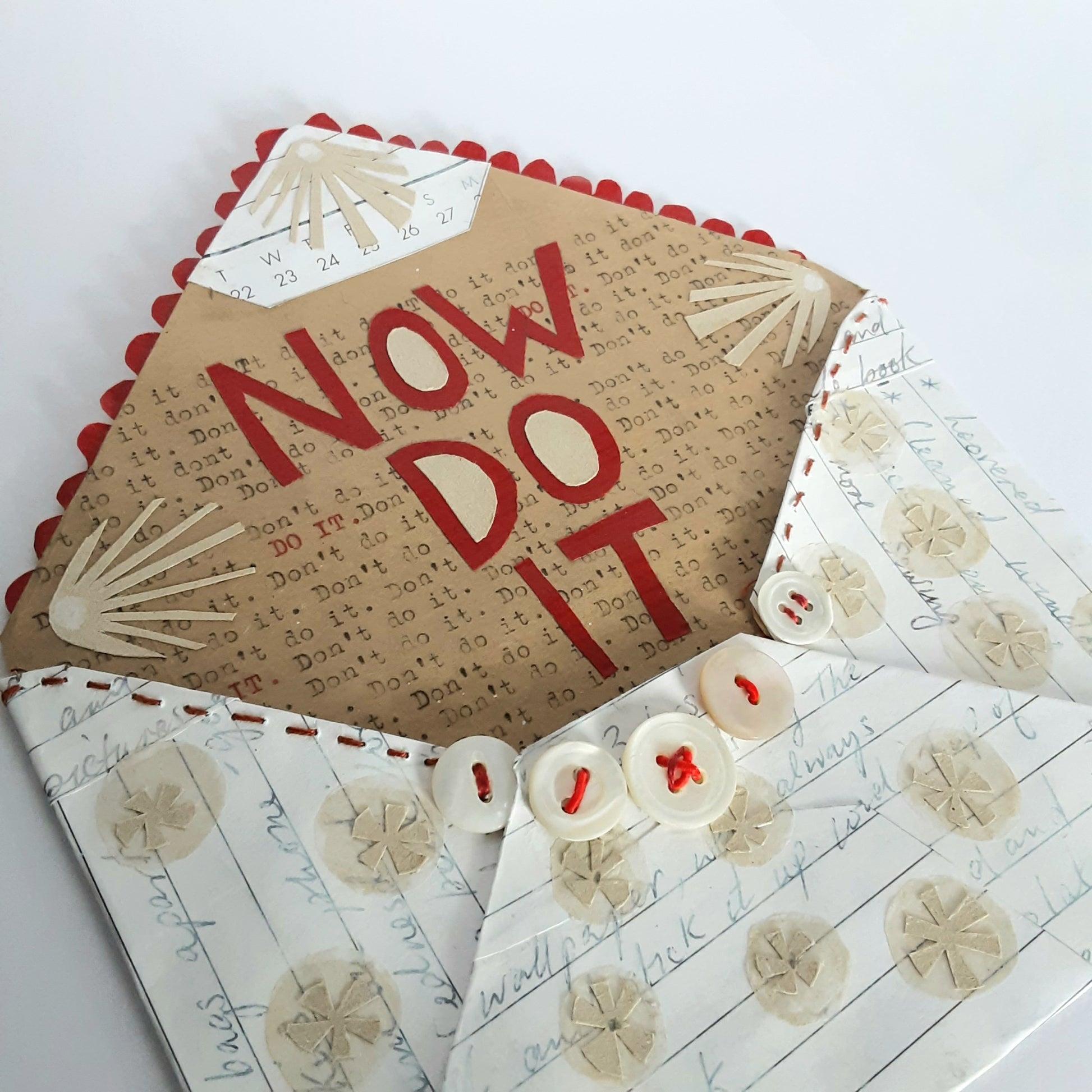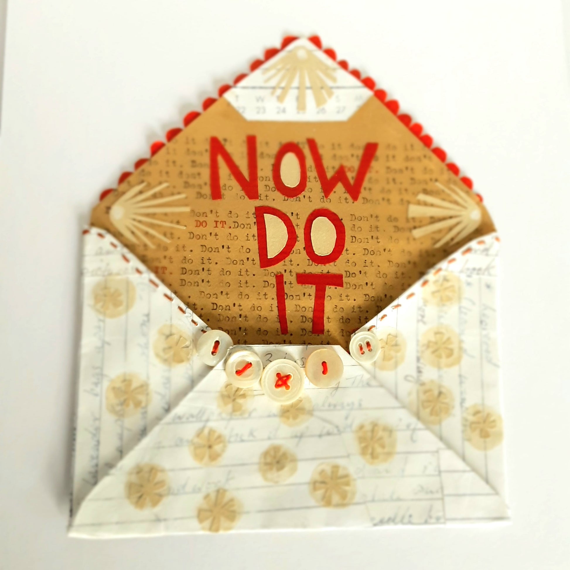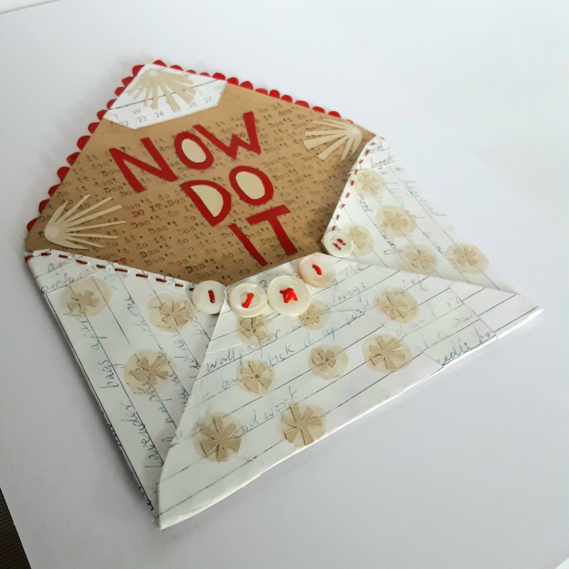 Crafted in 2013, this small envelope artwork took many hours to complete. The envelope itself is completely handmade from pages torn from an old diary. It's been embellished with cut paper shapes on the outside. Inside collaged in red paper reads NOW DO IT - this is placed onto paper, with a repetative hand typed message; do it, don't do it... If you are a procrastinator, you'll understand!