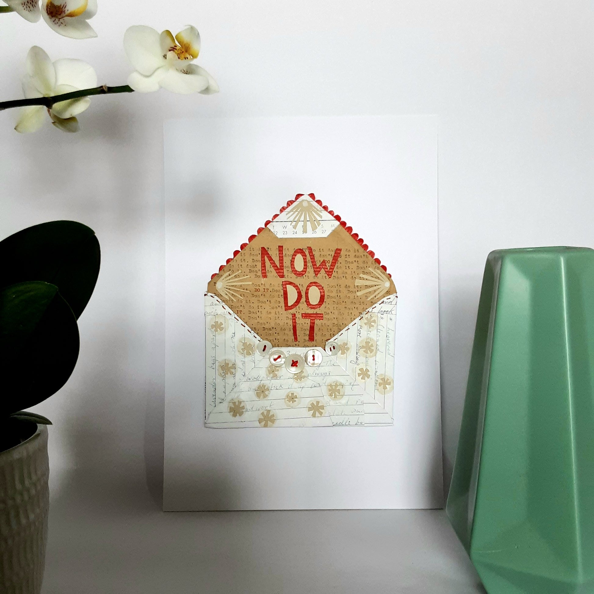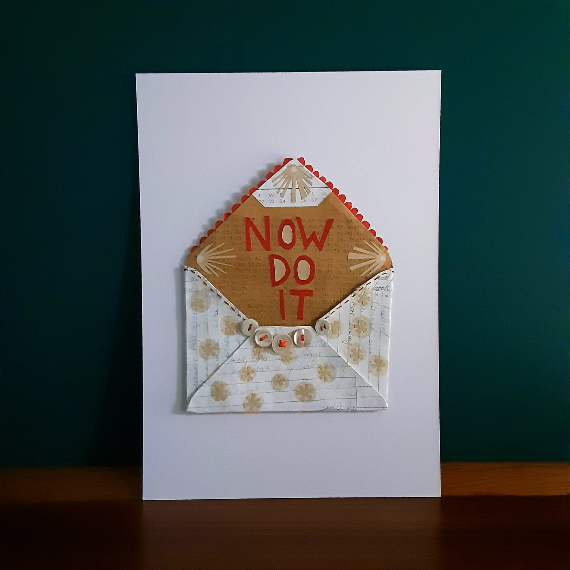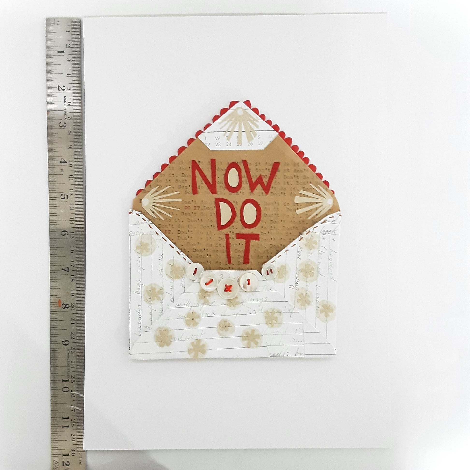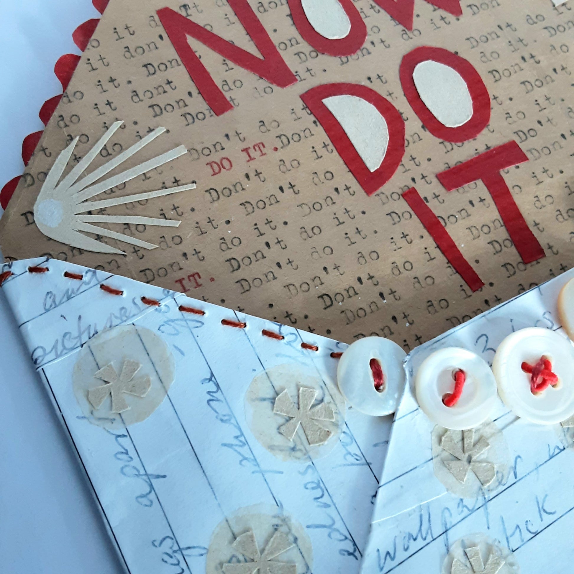 Crafted in 2013, this small envelope artwork took many hours to complete. The envelope itself is completely handmade from pages torn from an old diary. It's been embellished with cut paper shapes on the outside. Inside collaged in red paper reads NOW DO IT - this is placed onto paper, with a repetative hand typed message; do it, don't do it... If you are a procrastinator, you'll understand!