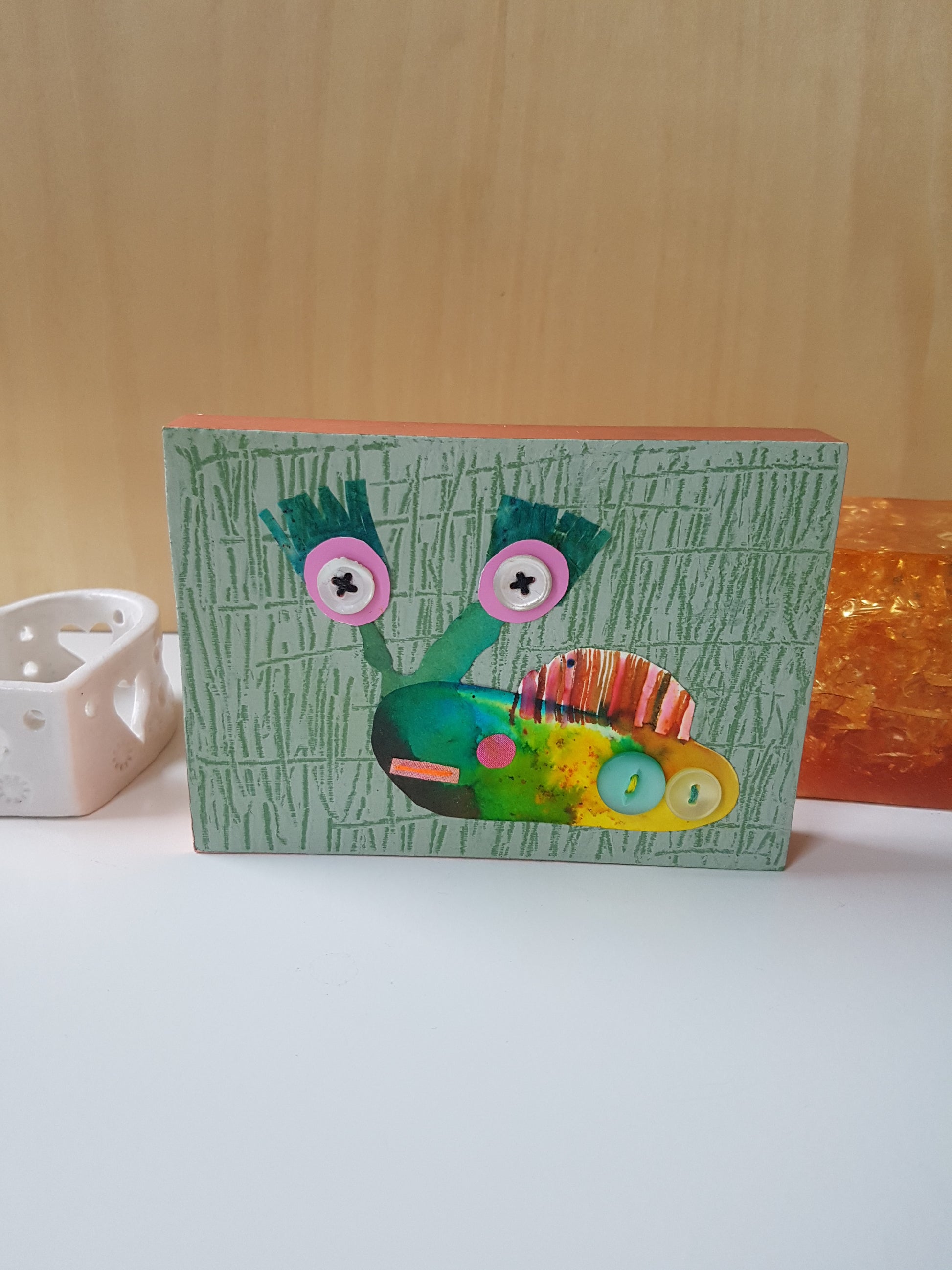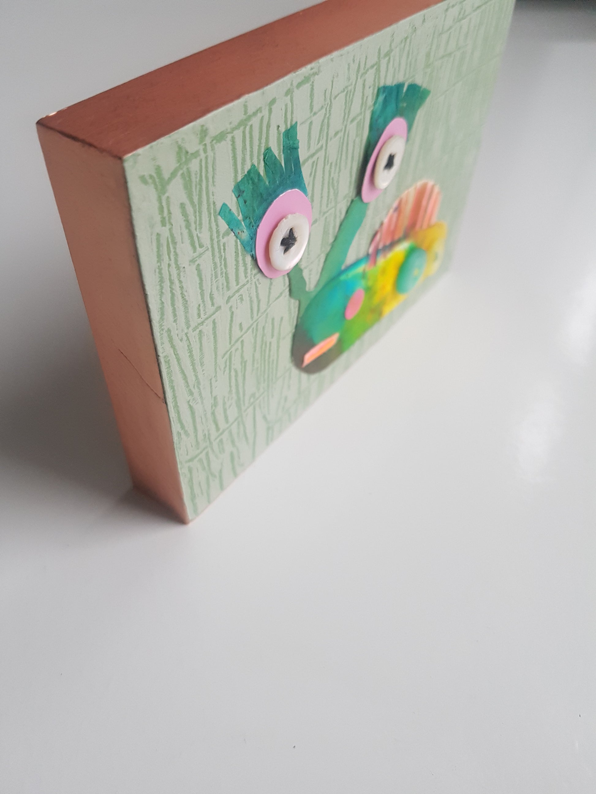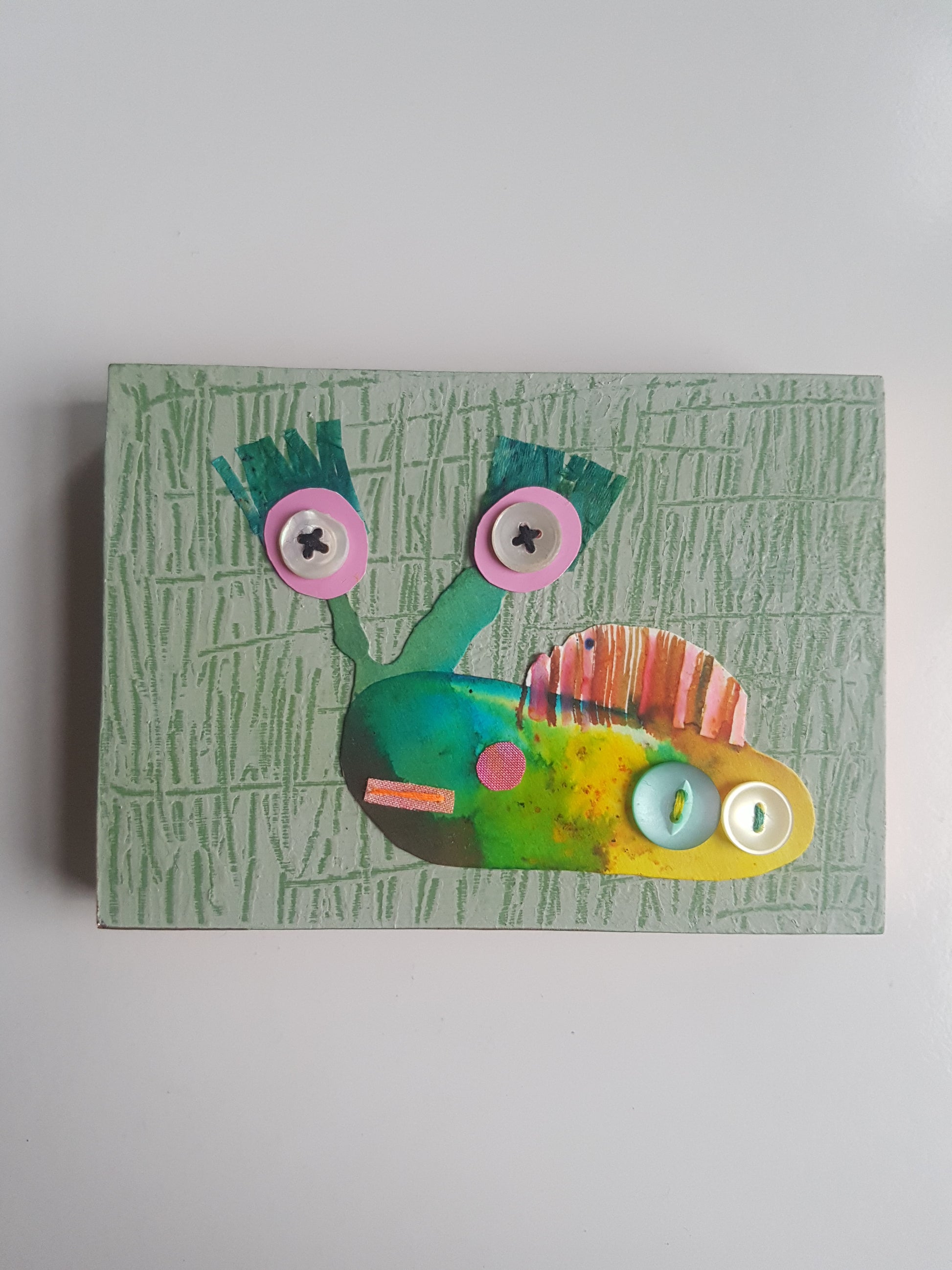 A colourful creepy-crawlie collage of painted papers, buttons and stitch applied to a painted MDF panel. Copper tape covered edges. Sealed with several coats of acrylic varnish for protection.