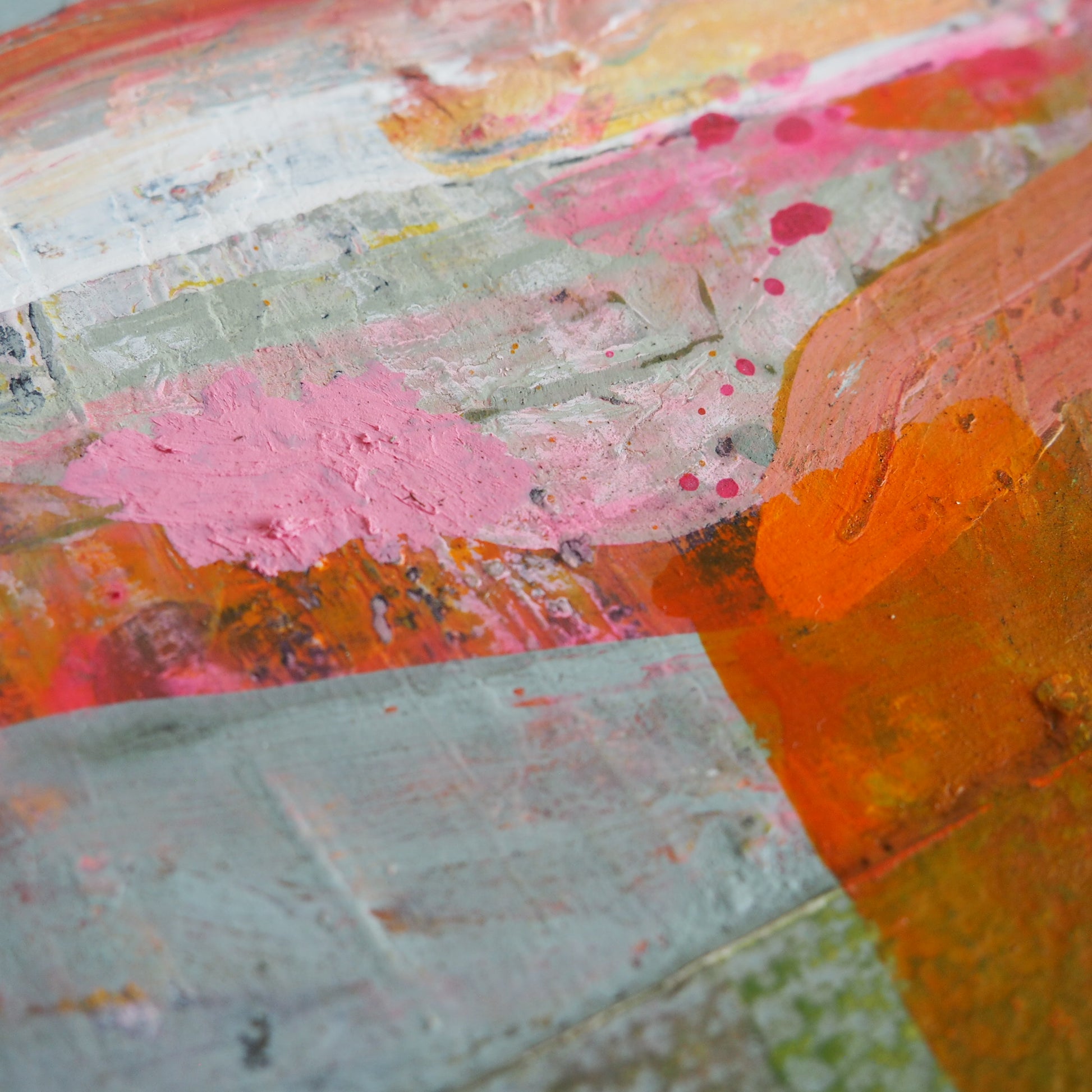 This contemporary abstract painting features a dramatic red sky, adding a touch of warmth and vibrancy to your home. Its small size makes it perfect for displaying on a desk or shelf.