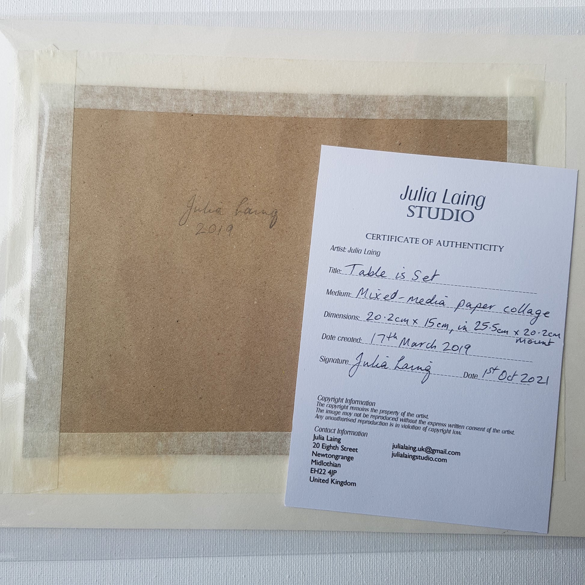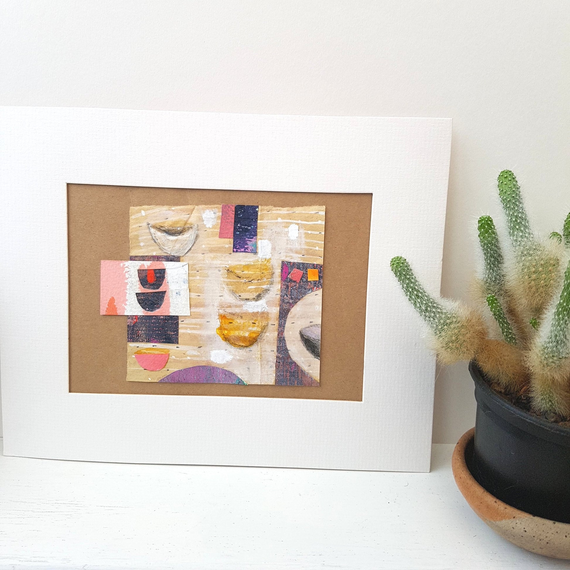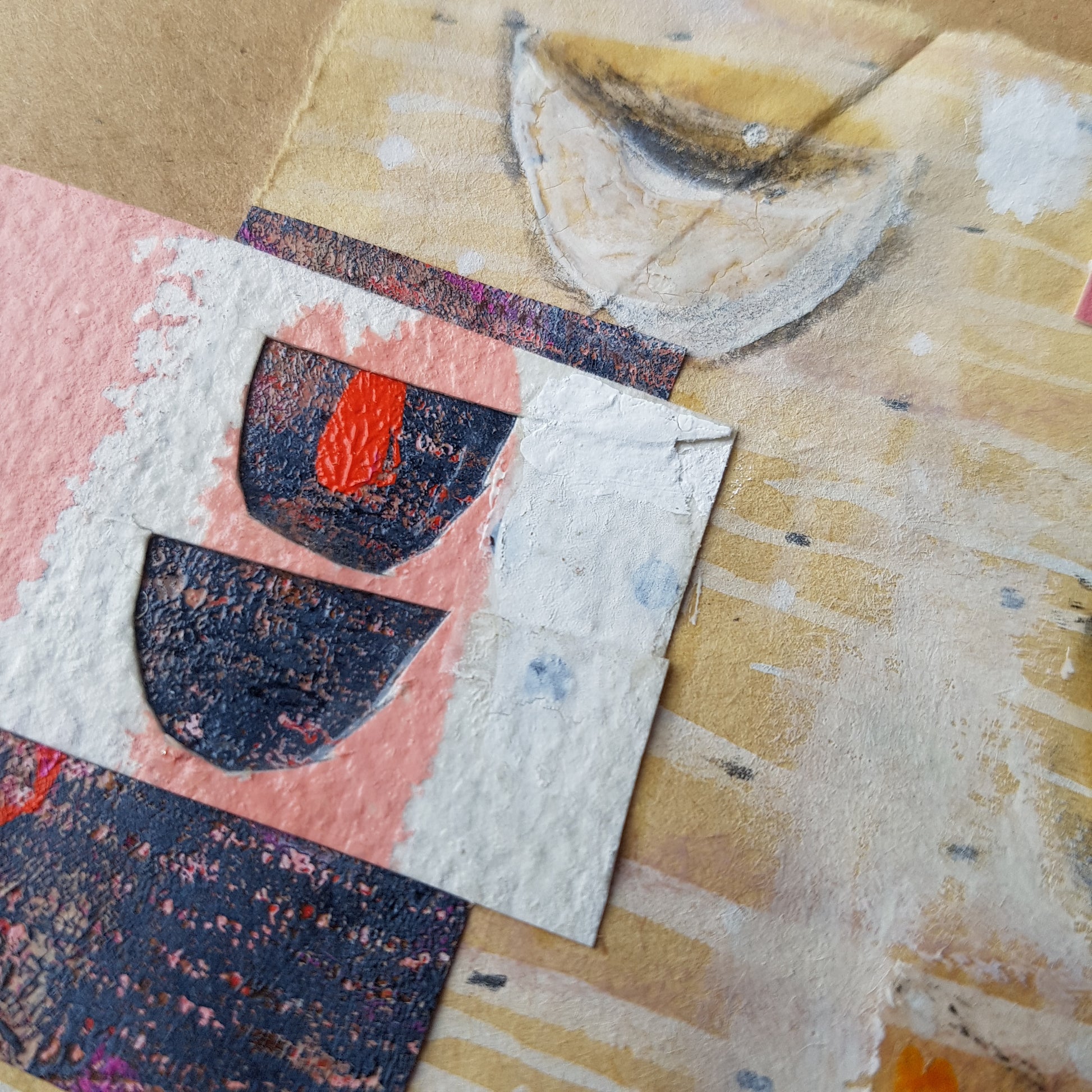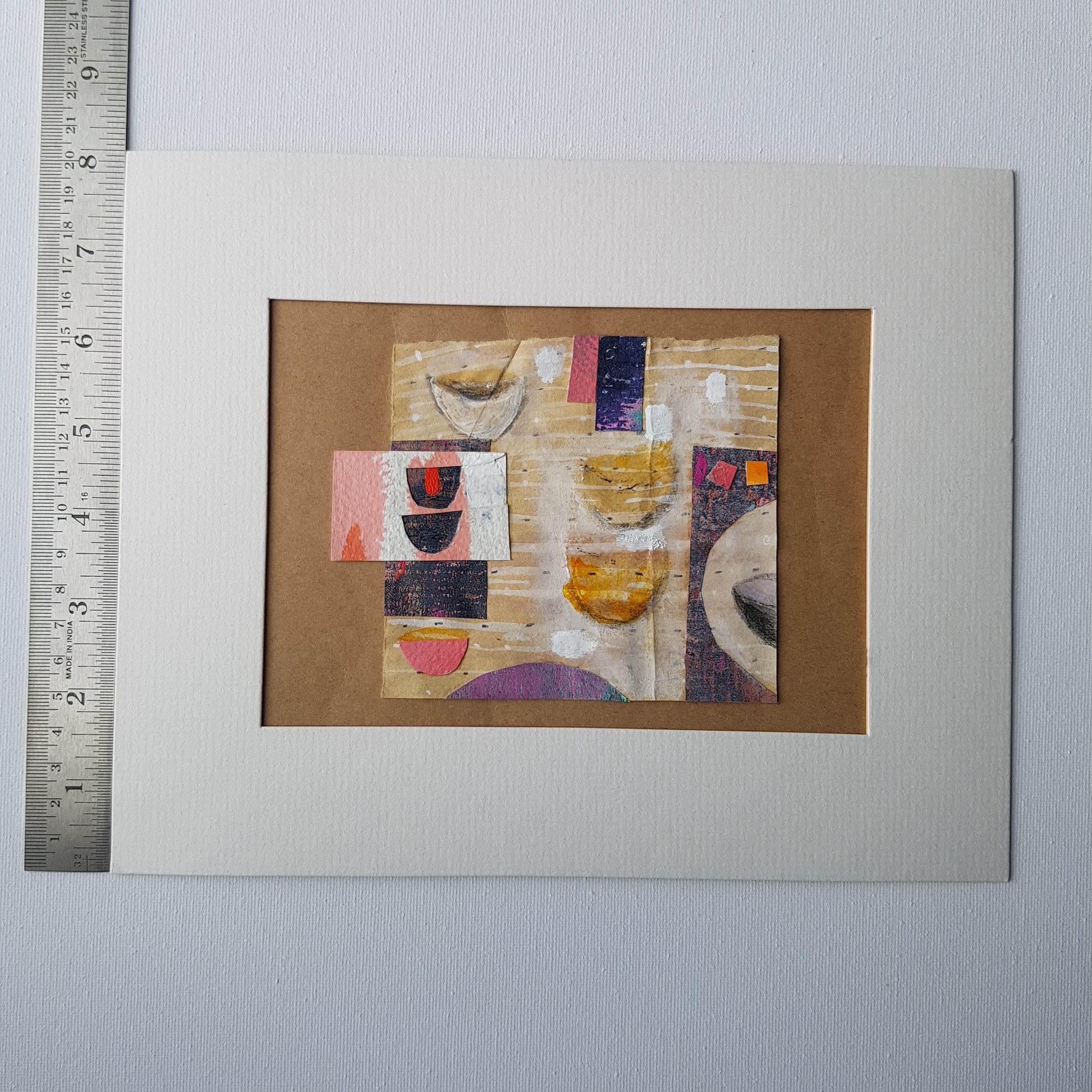 I loved creating this small paper collage. I worked intuitively using mixed painted papers. The different paper elements were pieced together to make an abstract still-life composition, including bowls on a table top, reminiscent of a tea ceremony.