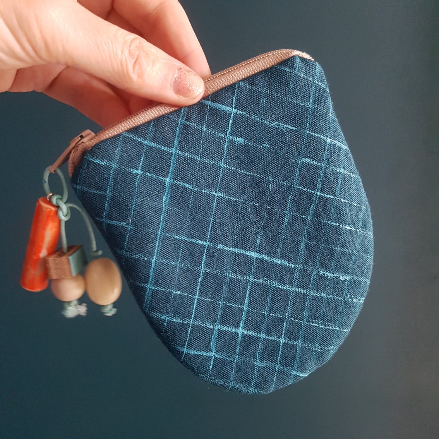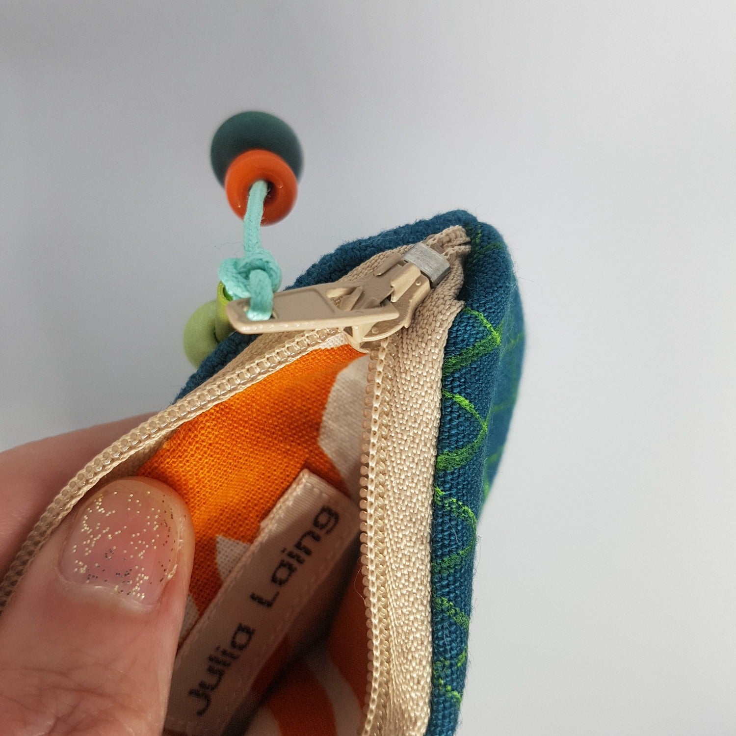 It has an elegantly simple shape which was inspired by the lobster creels you find dotted around harbours. The practical zipper-pull is embellished with rope and float inspired beads, including a couple of wooden ones I made and painted myself.