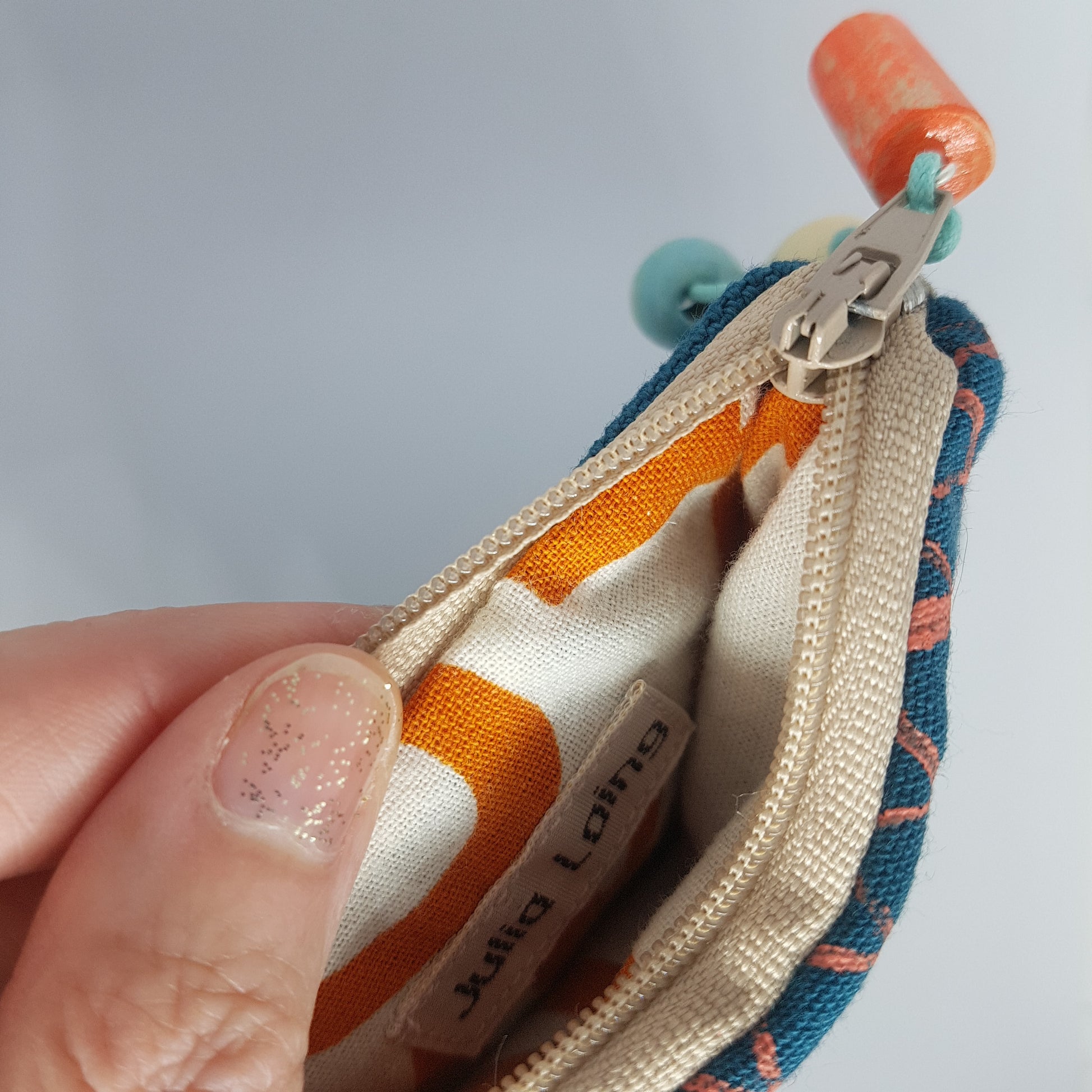 A surprisingly roomy little purse, carefully crafted from beautiful teal linen, with a orange net design I printed by hand.