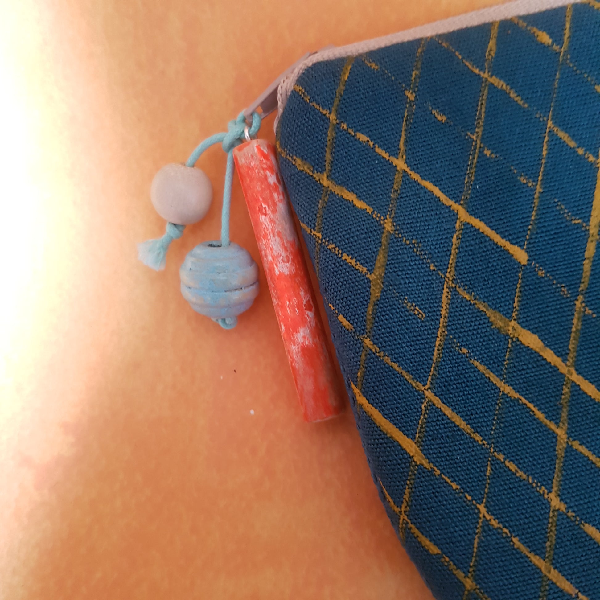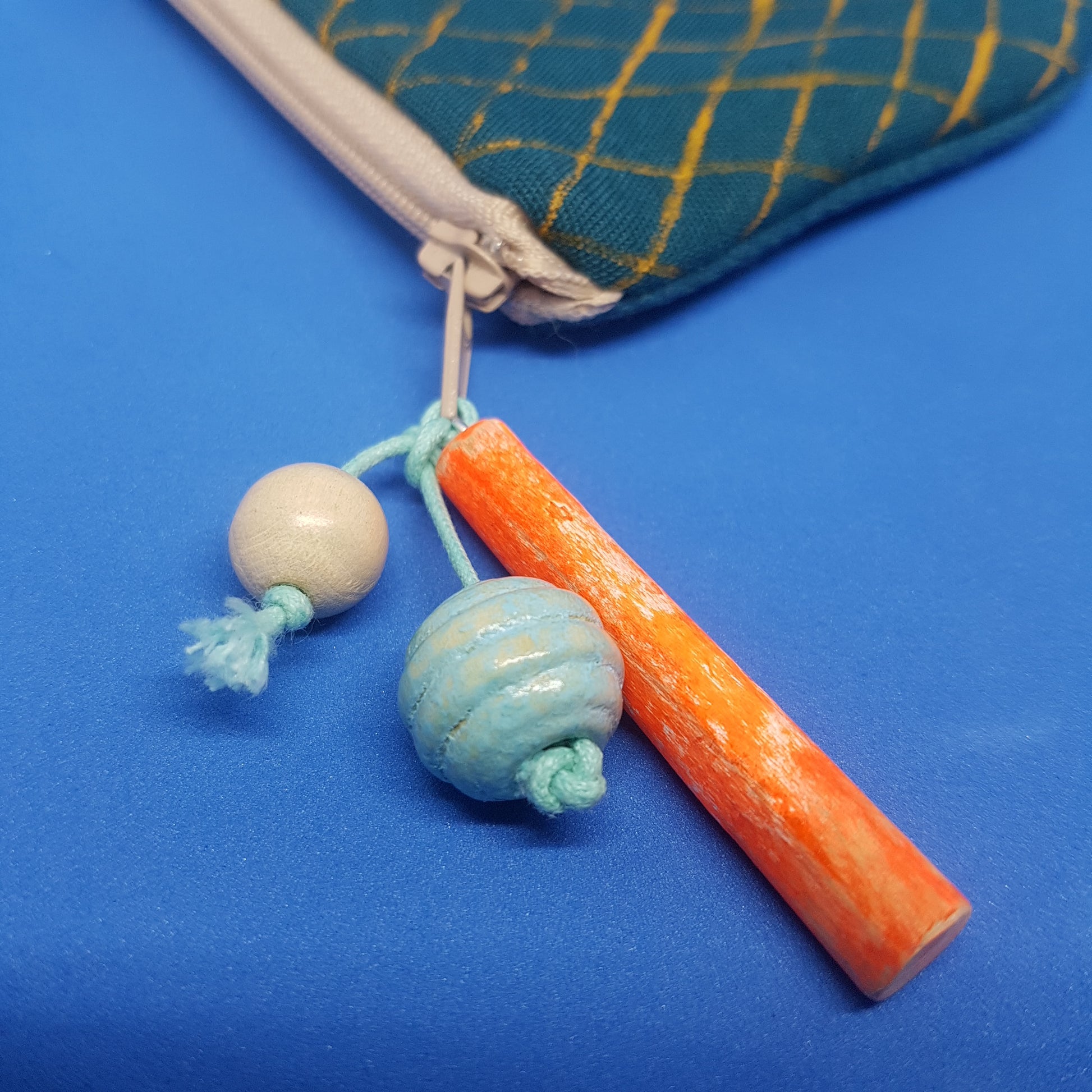 It has an elegantly simple shape which was inspired by the lobster creels you find dotted around harbours. The practical zipper-pull is embellished with rope and float inspired beads, including an orange wooden bead I made and painted myself.
