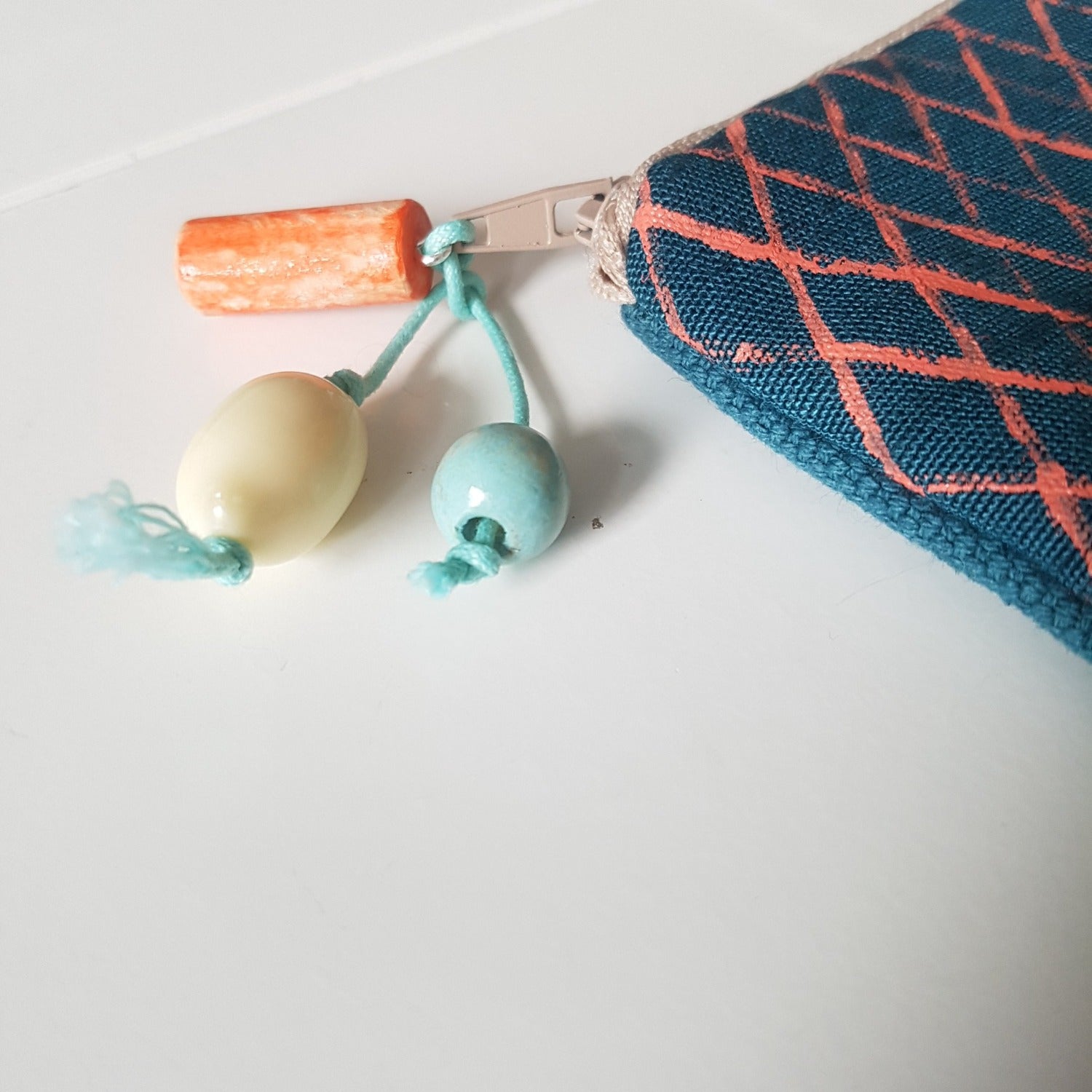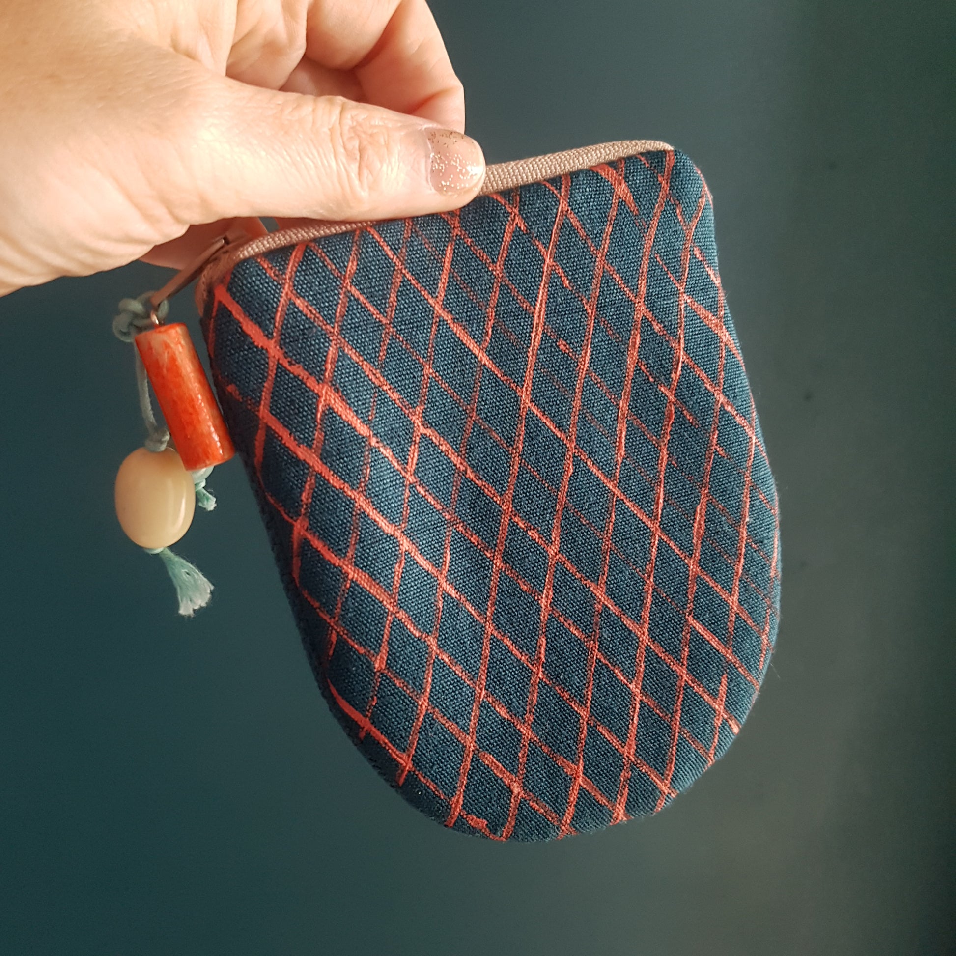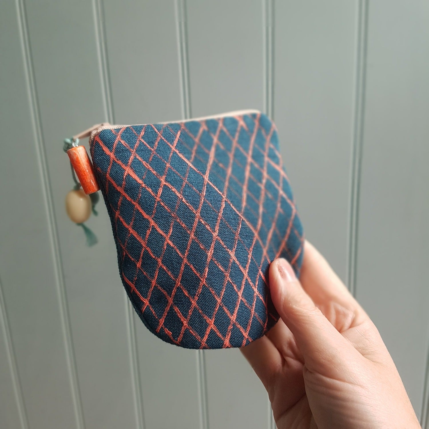 A surprisingly roomy little purse, carefully crafted from beautiful teal linen, with a coral coloured net design I printed by hand.
