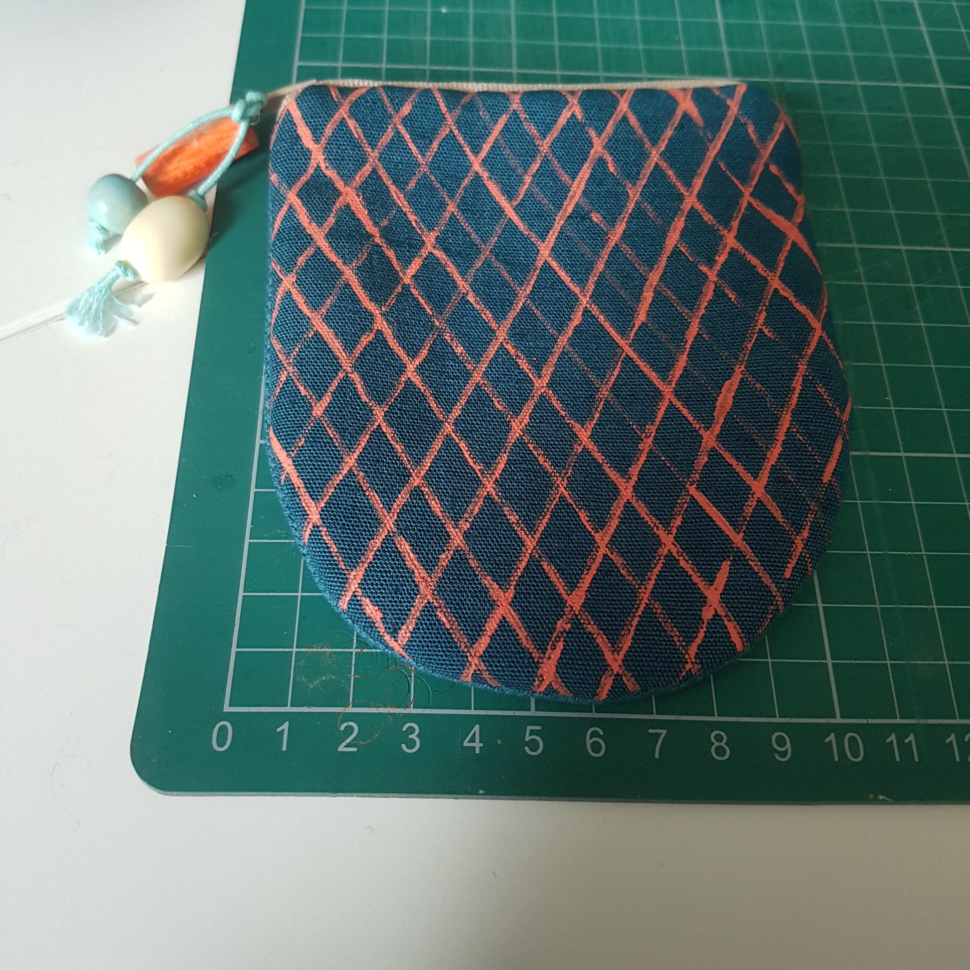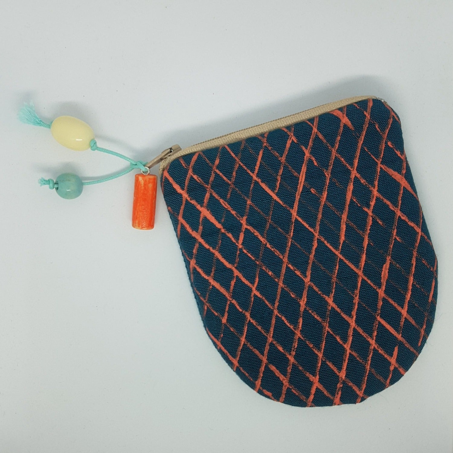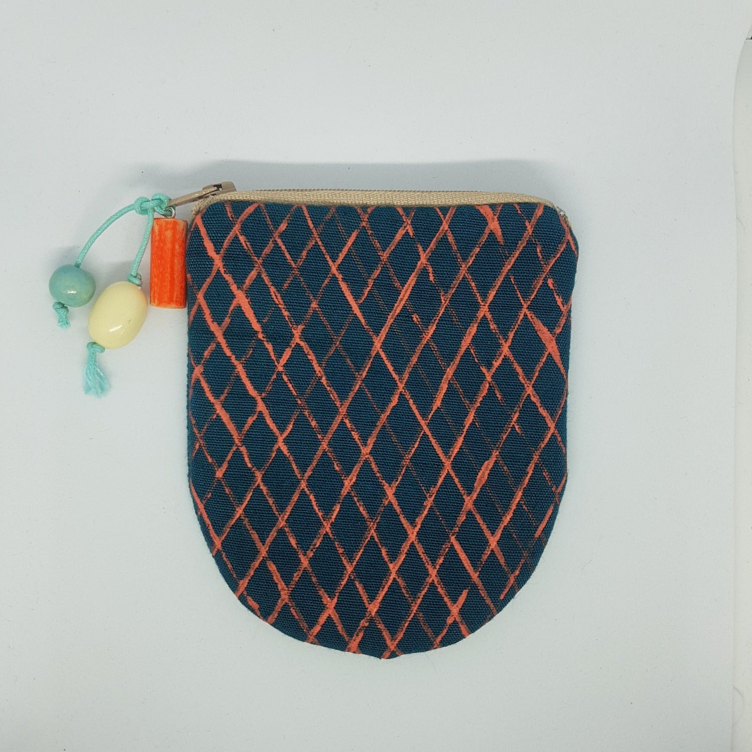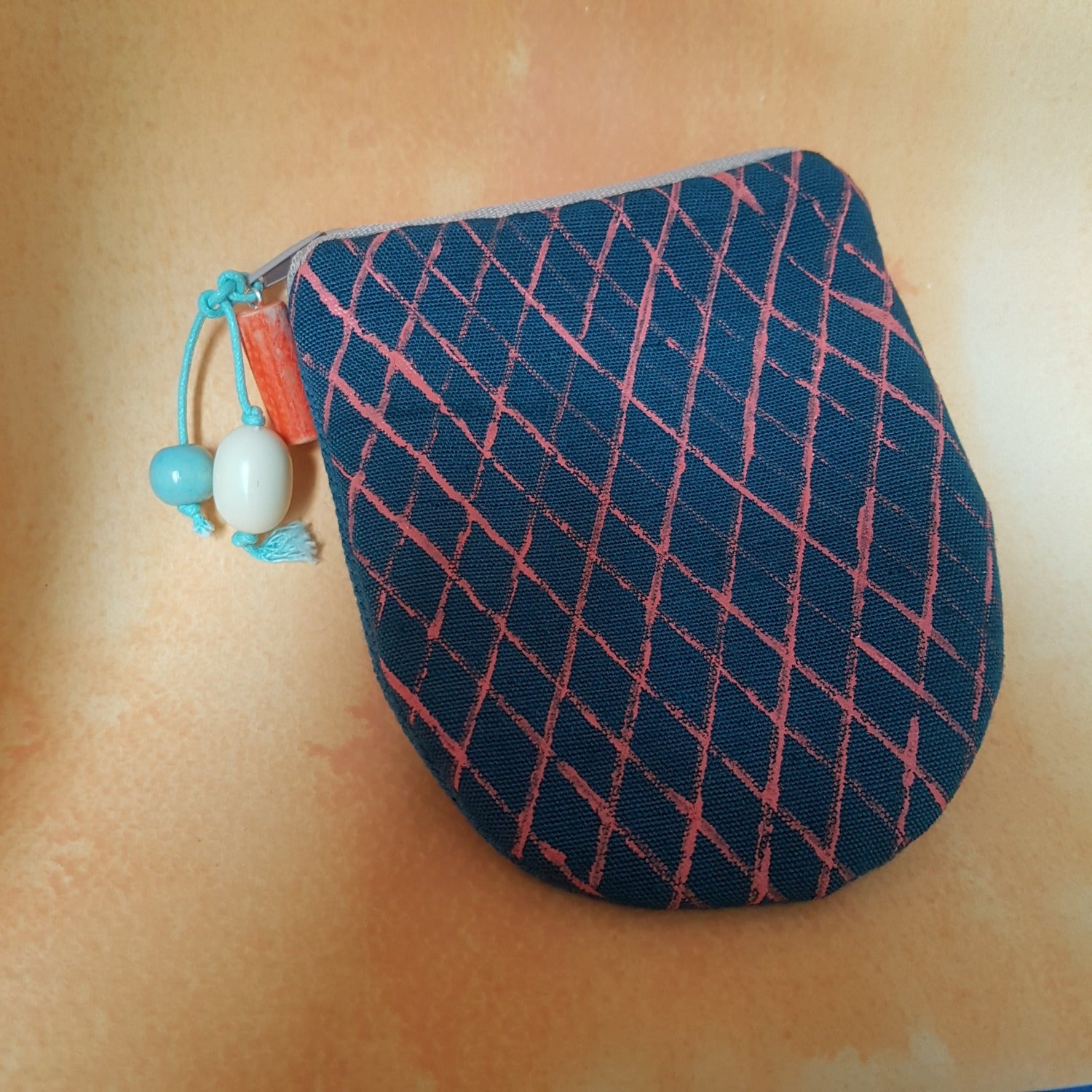 A surprisingly roomy little purse, carefully crafted from beautiful teal linen, with a coral coloured net design I printed by hand.
