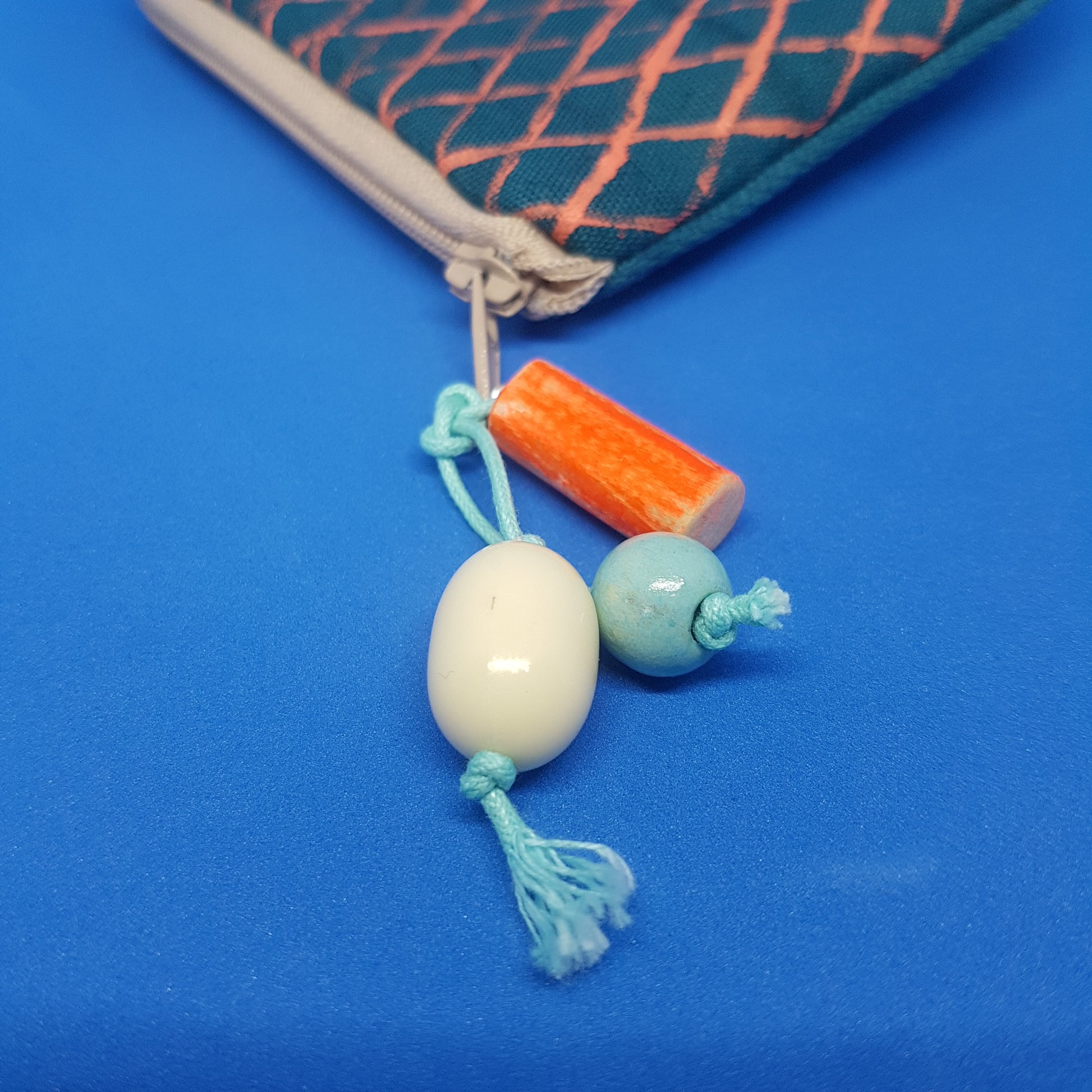 It has an elegantly simple shape which was inspired by the lobster creels you find dotted around harbours. The practical zipper-pull is embellished with rope and float inspired beads, including a wooden one I made and painted myself.