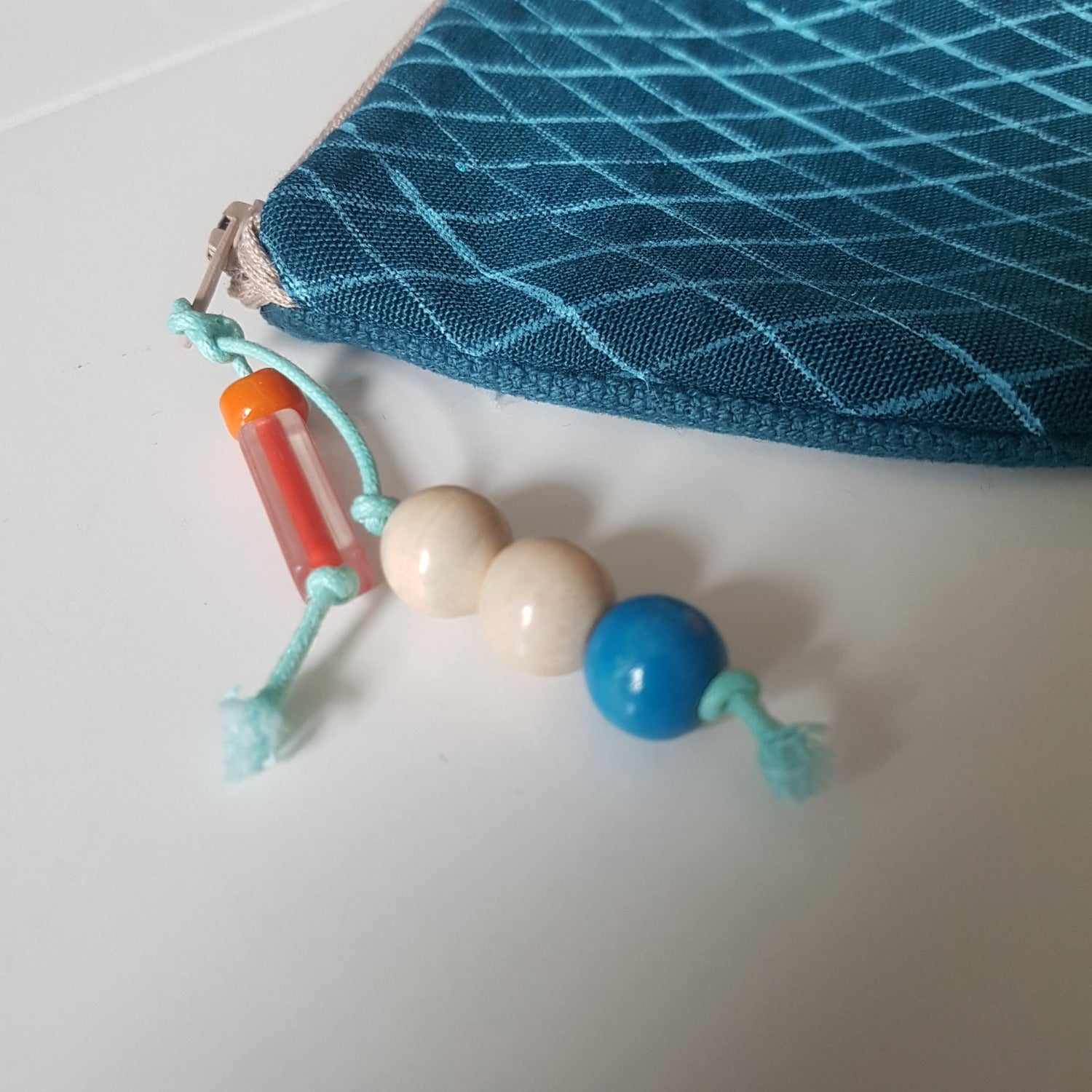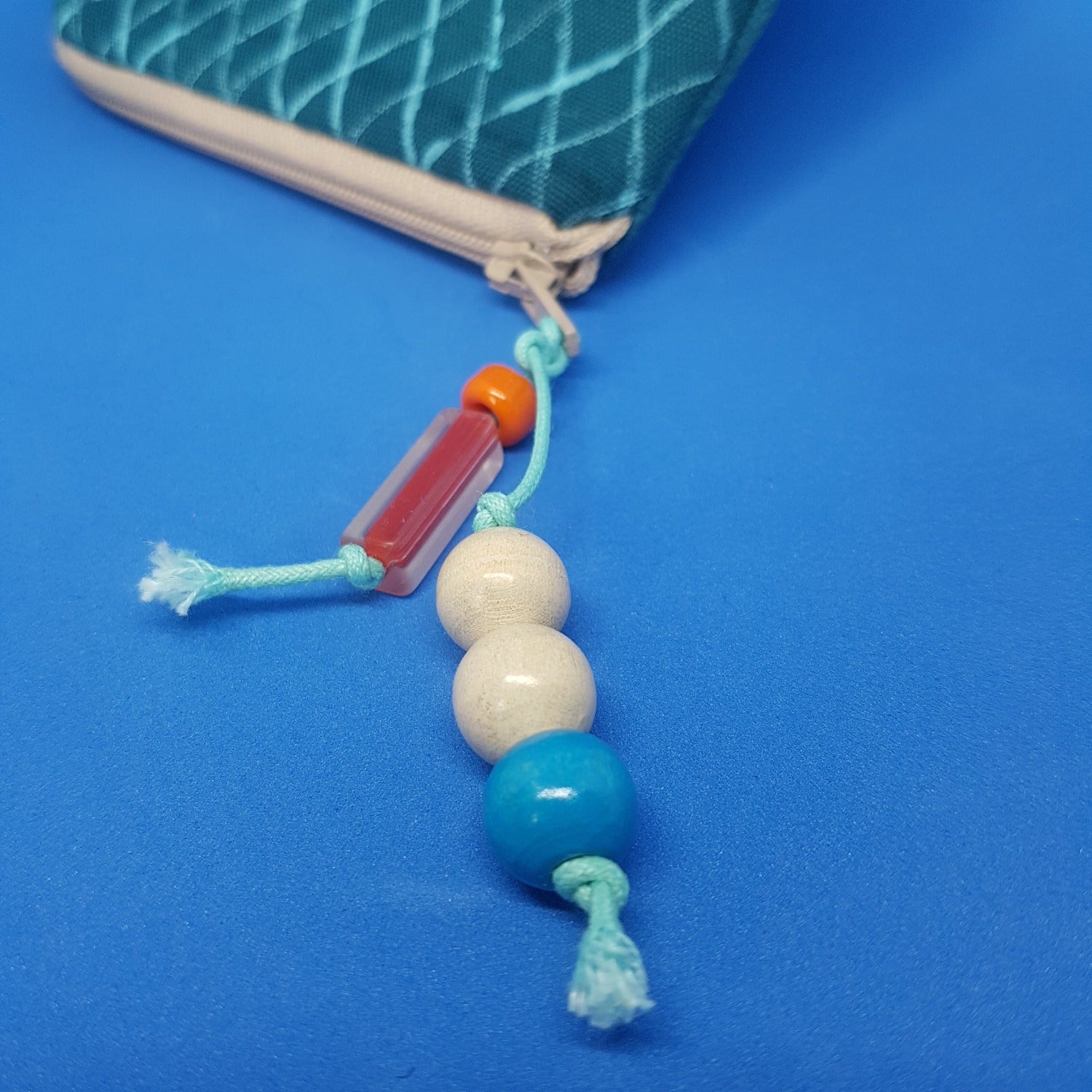 It has an elegantly simple shape which was inspired by the lobster creels you find dotted around harbours. The practical zipper-pull is embellished with rope and float inspired beads.