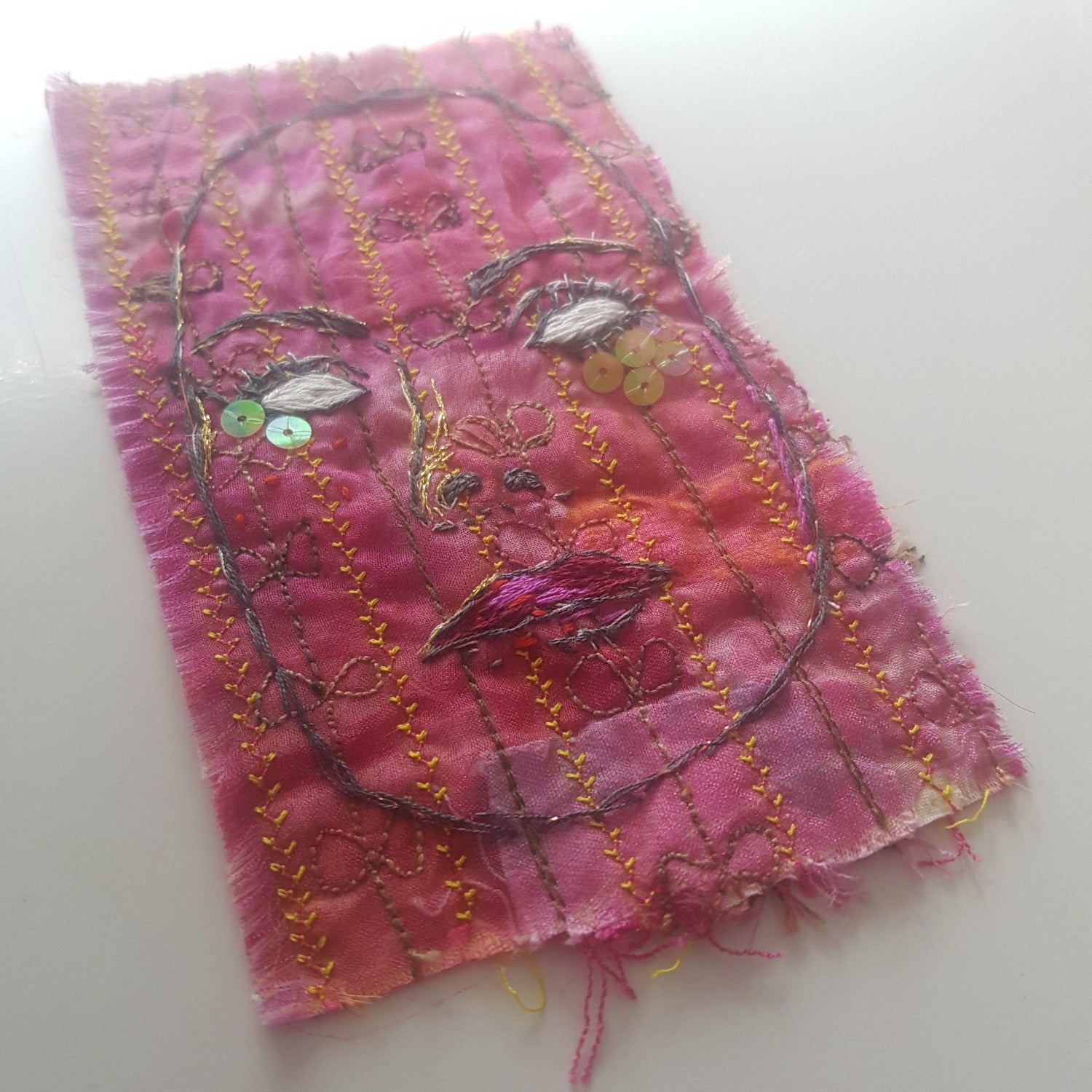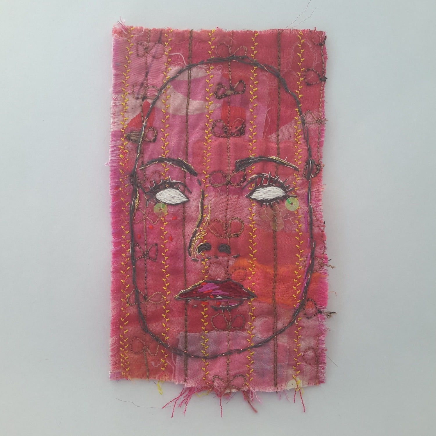 A number of processes were involved in making - The fabric itself was created by piecing together lots of scraps of different fabrics, sandwiching them between a cotton backing and pink voile fabric, I then used my sewing machine to stitch the layers together, with a combination of stripes and patterns drawn freehand.