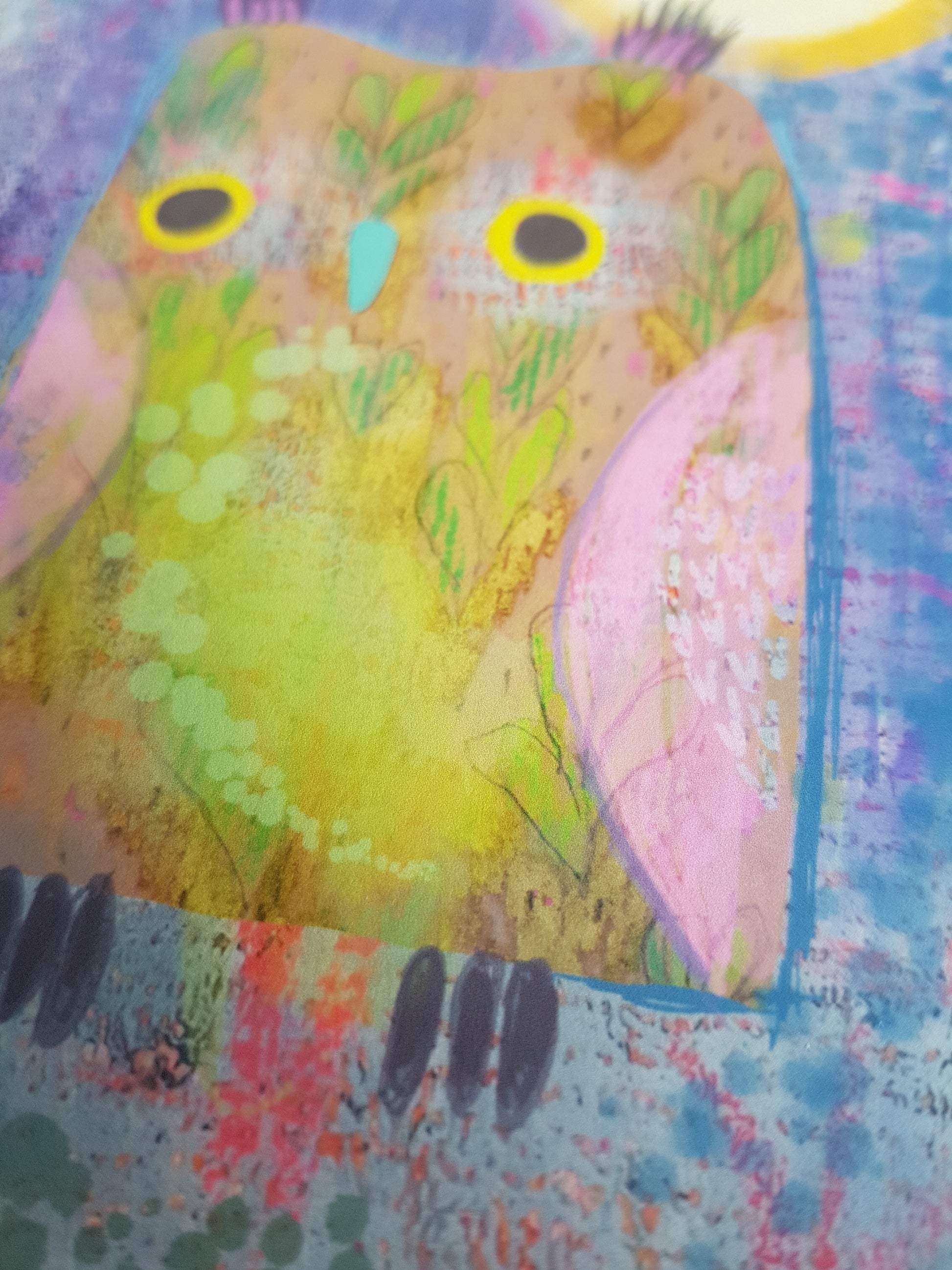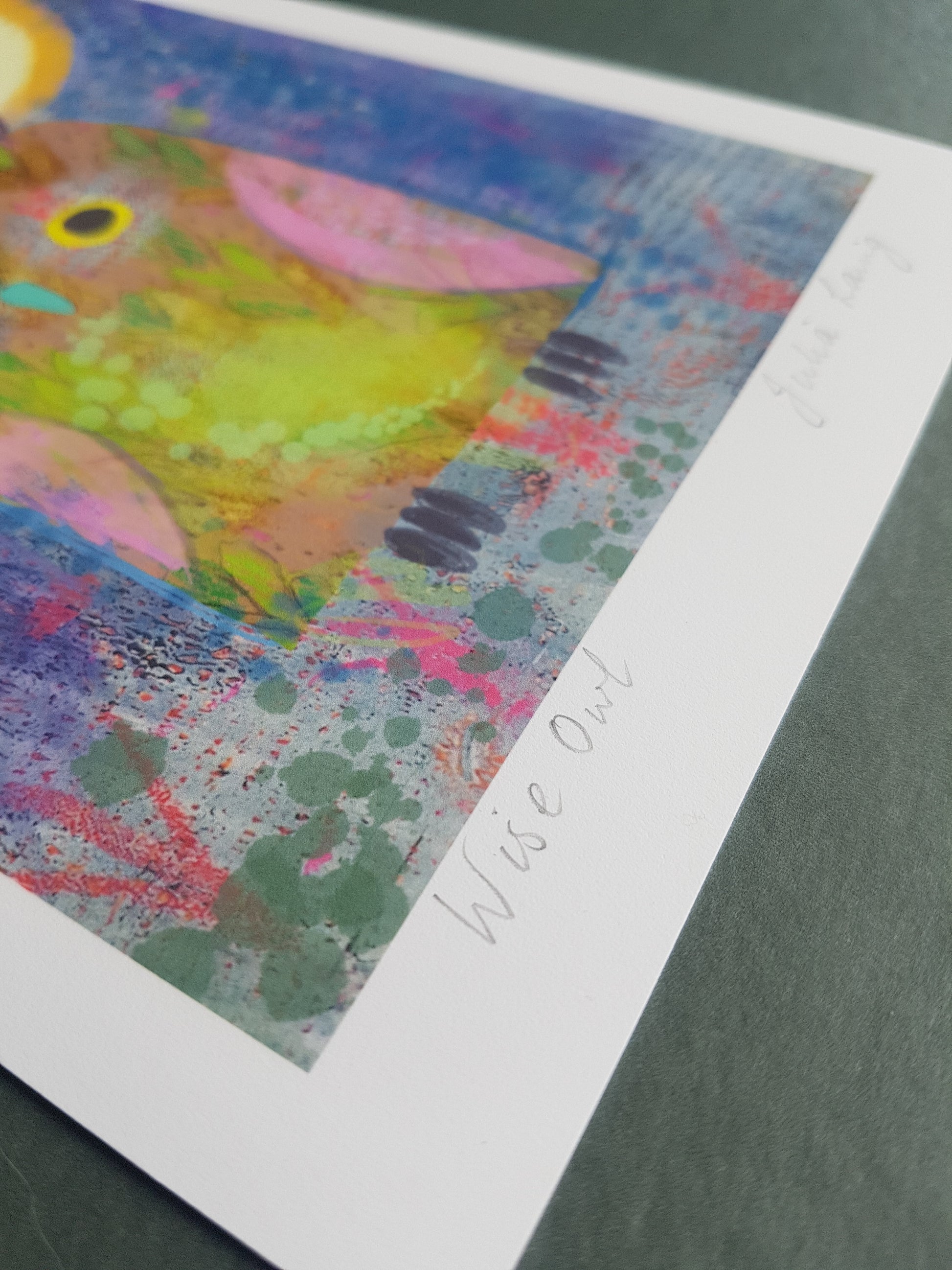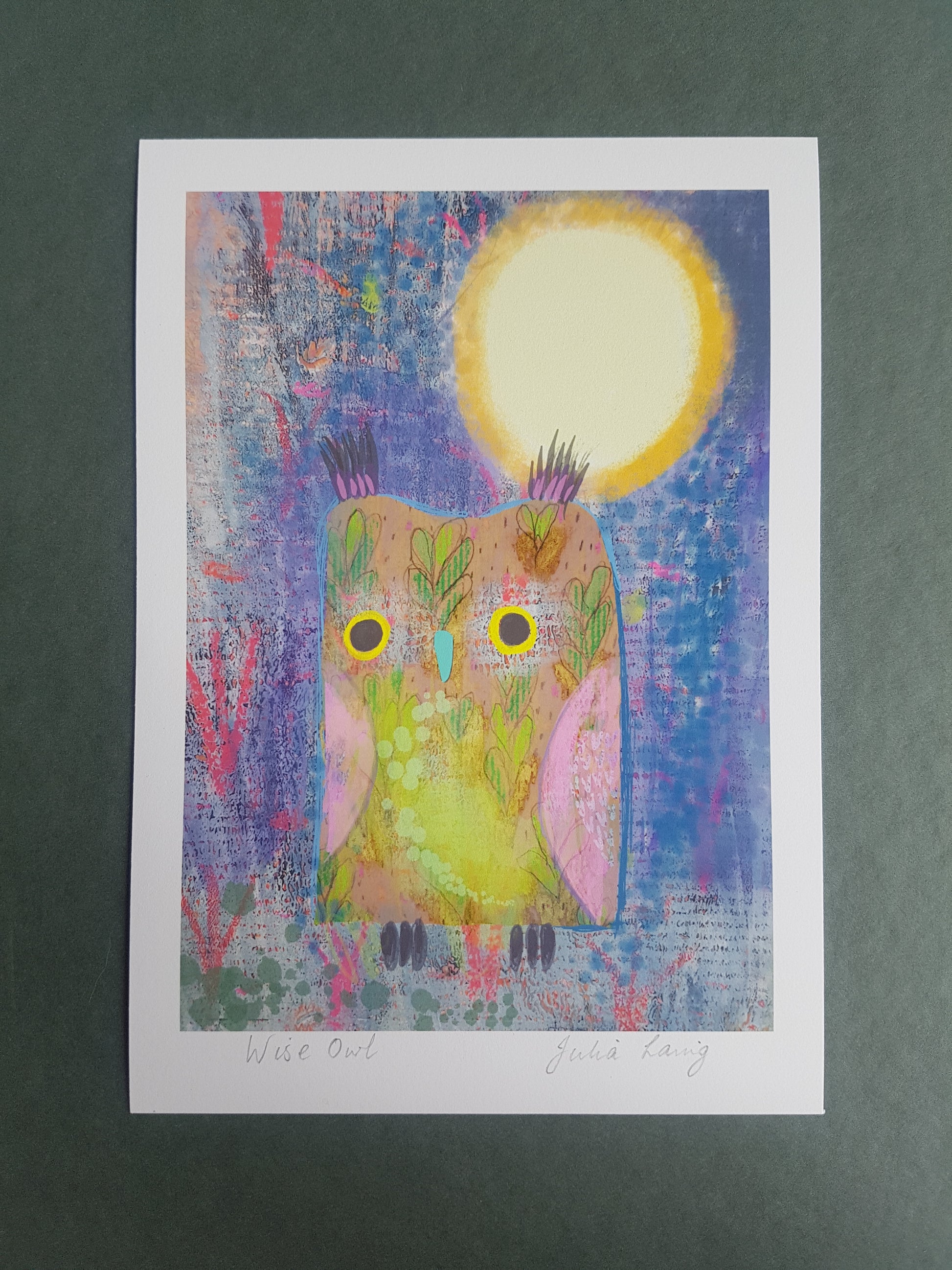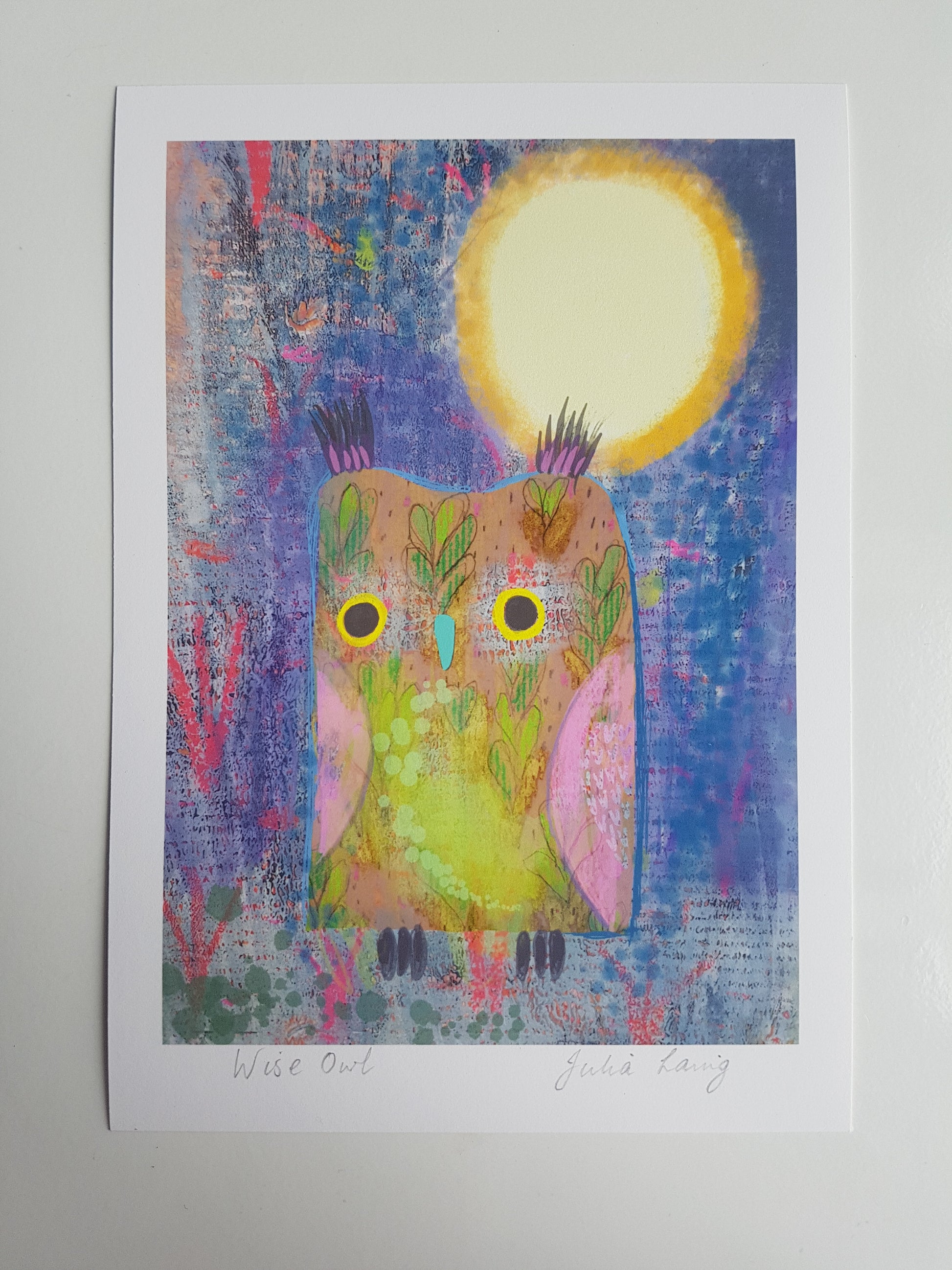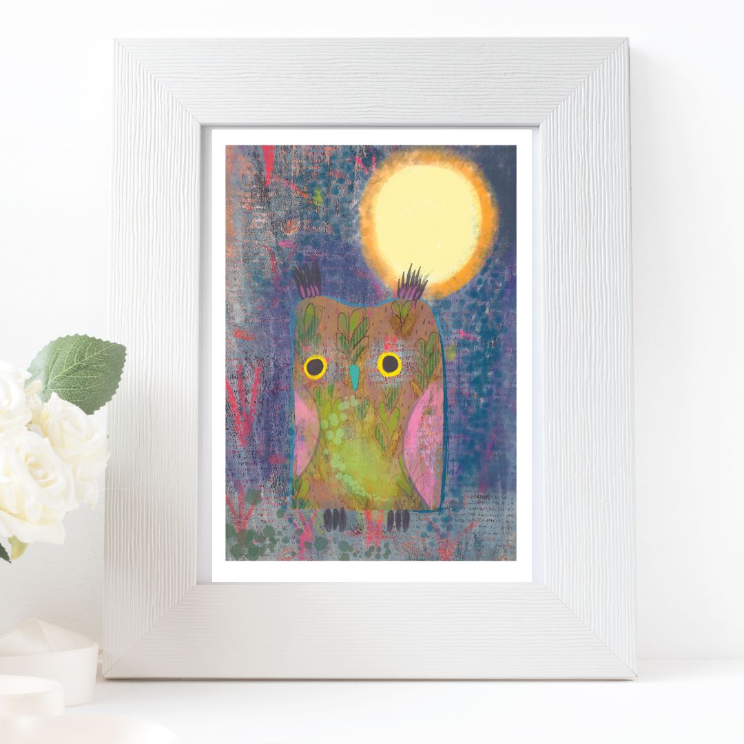 Brighten up your home decor with the vibrant Wise Owl Giclee Print. Featuring a digitally drawn owl illustration, this high-quality A5 print will complement any living space. Showcase your love for nature with this inspiring and unique artwork!