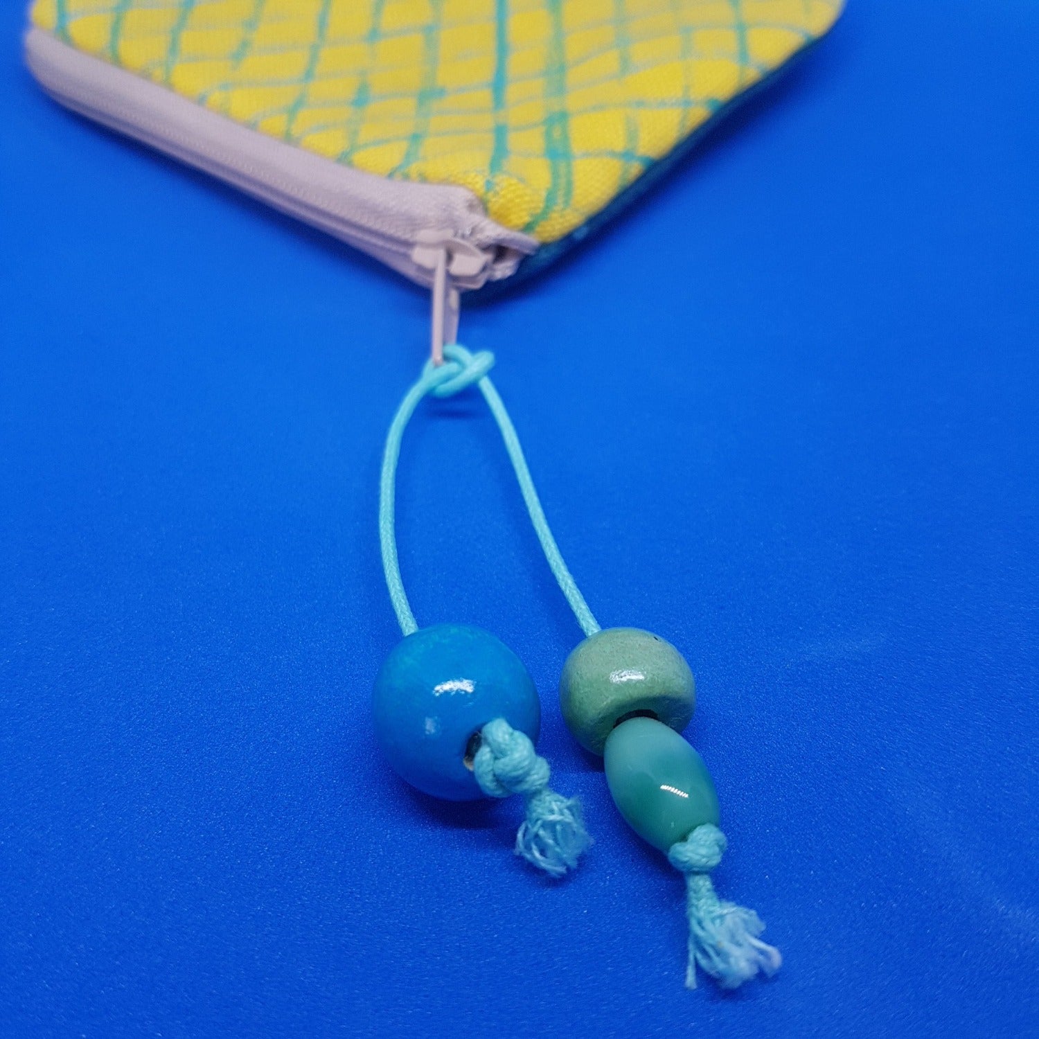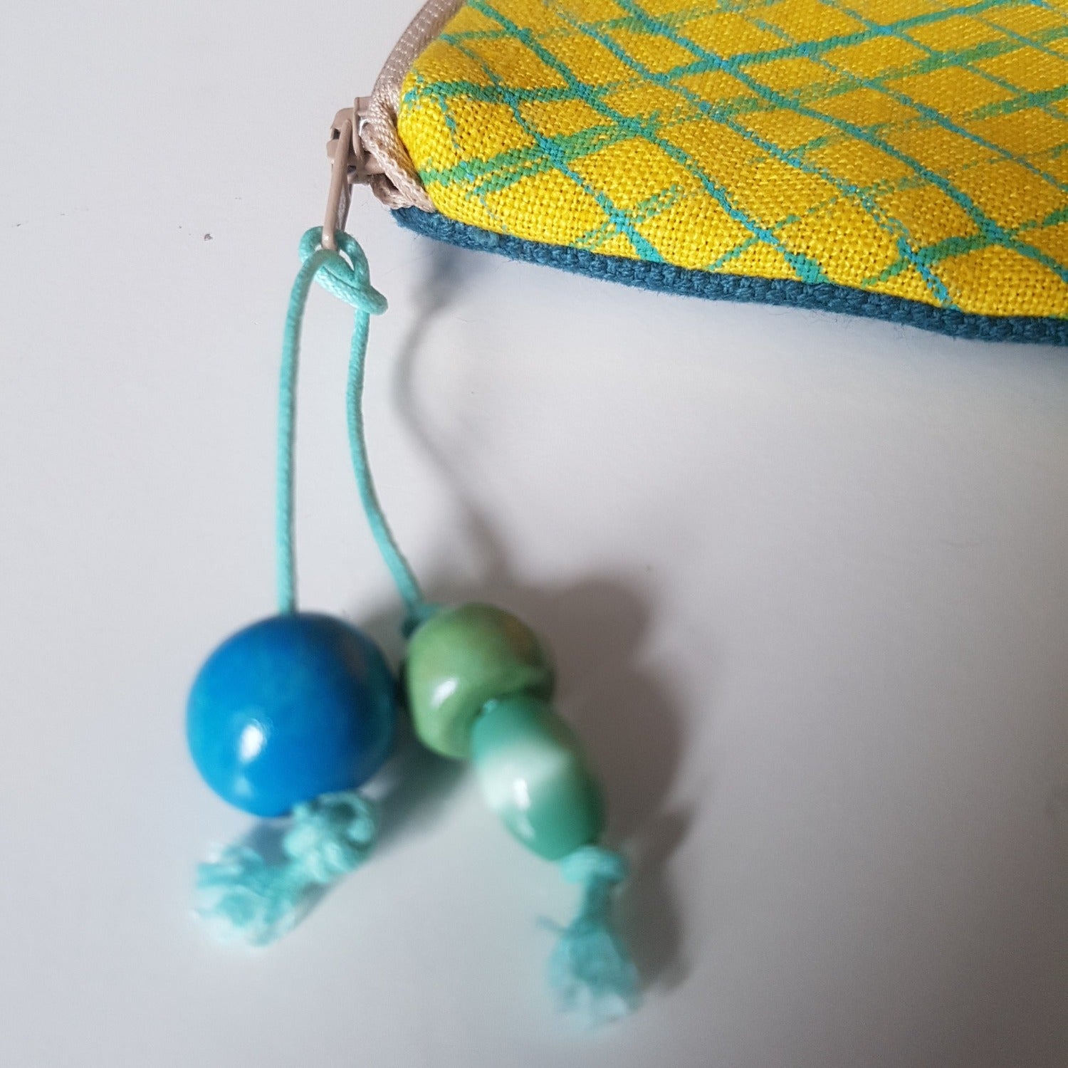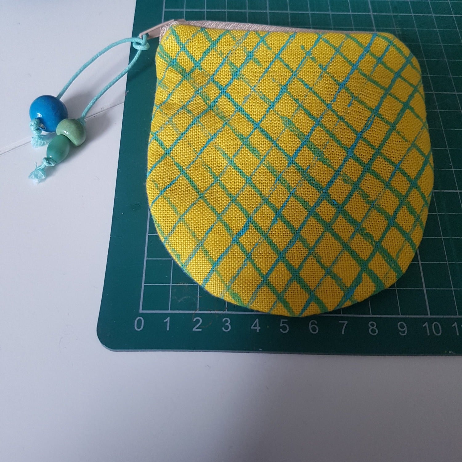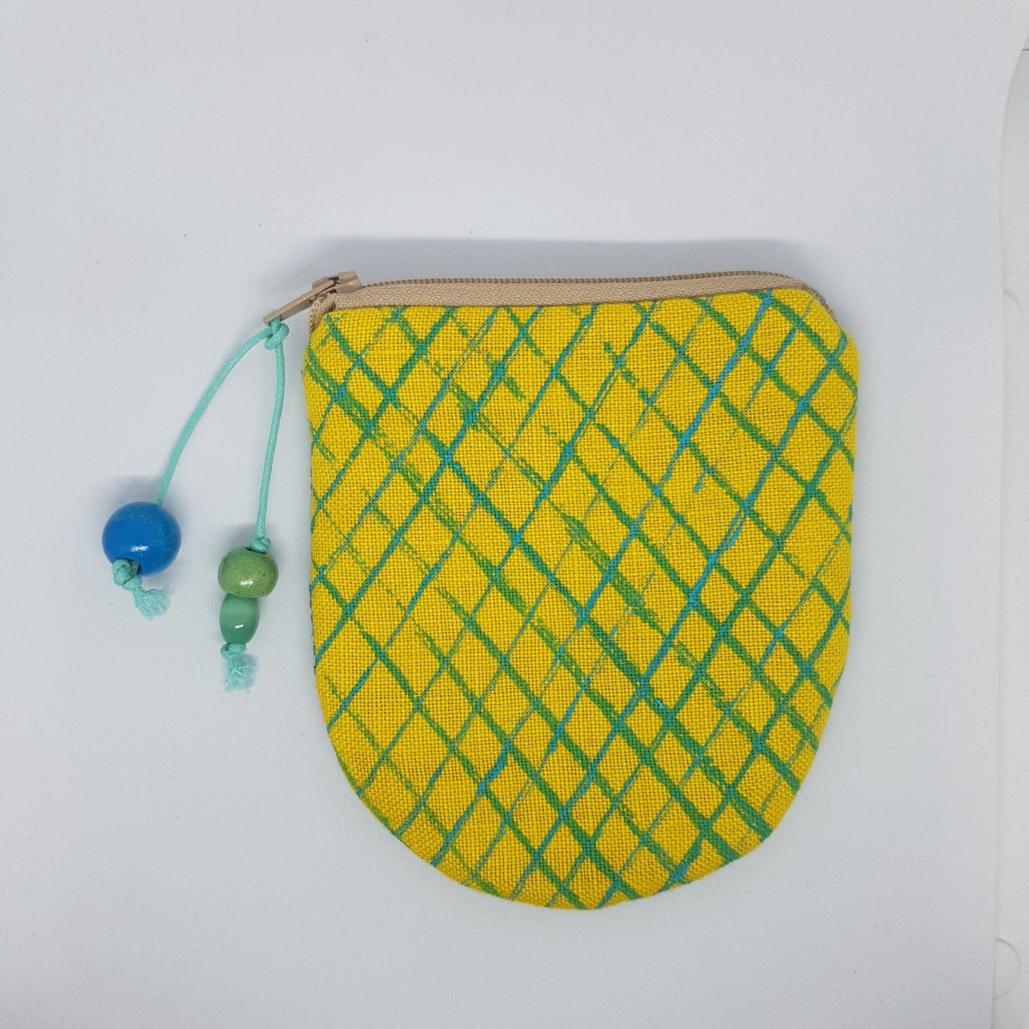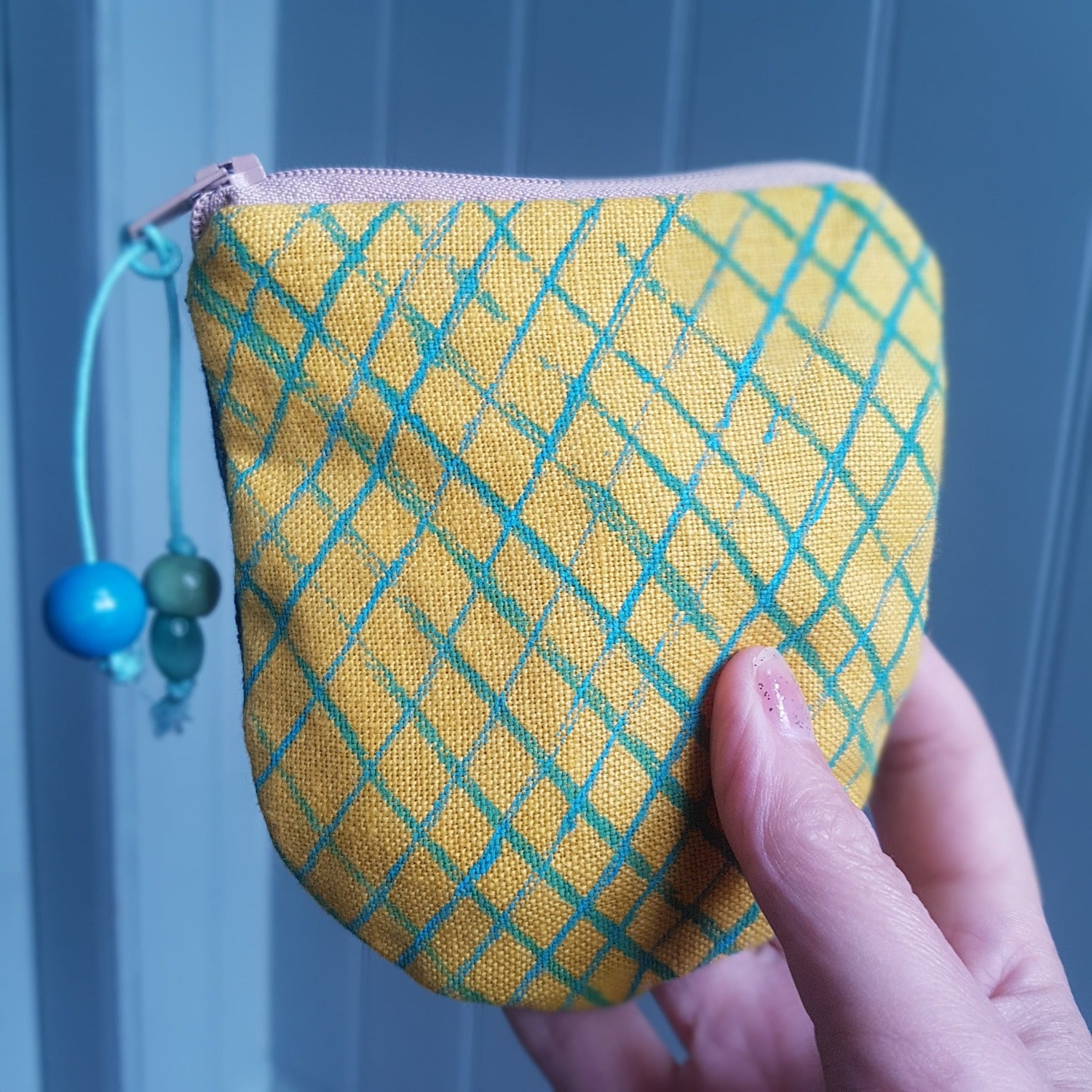 A carefully crafted coin purse made from beautiful yellow linen, with a turquoise net design that was printed by hand.